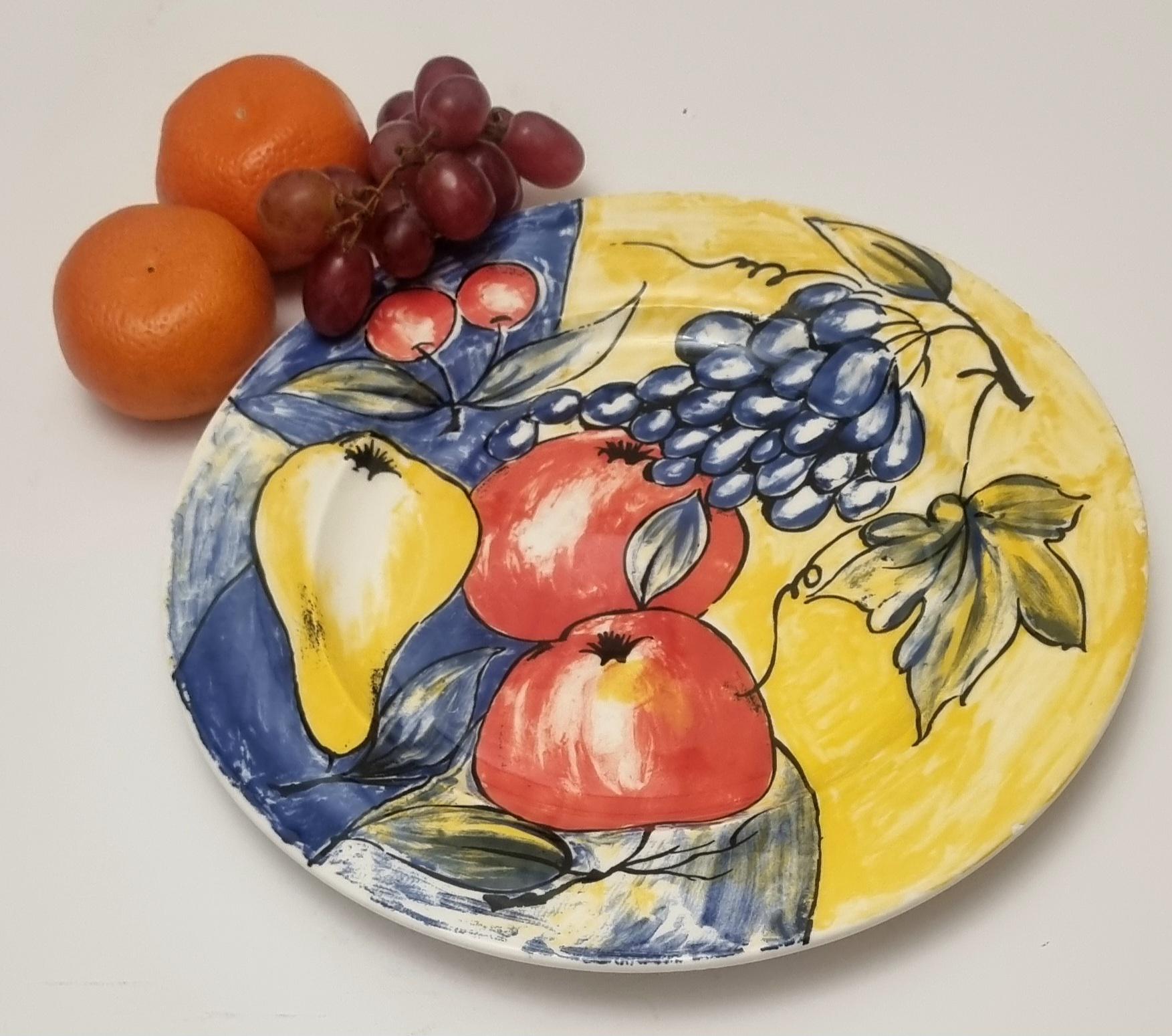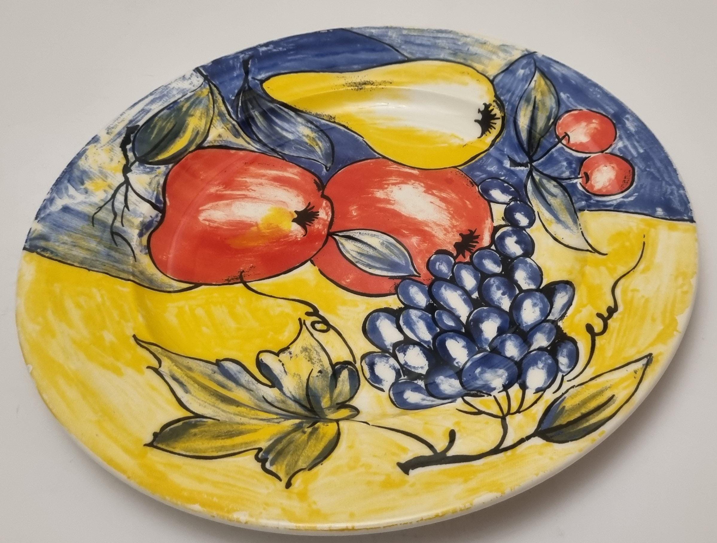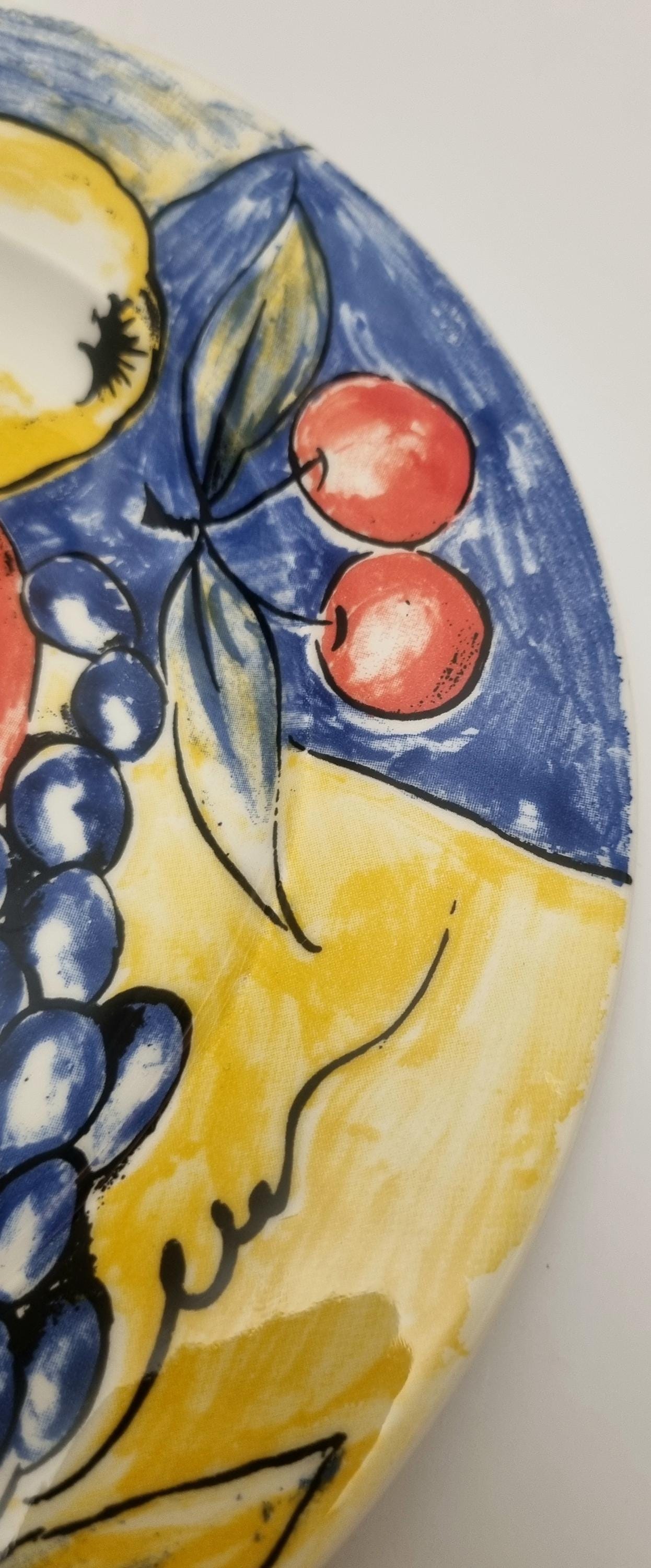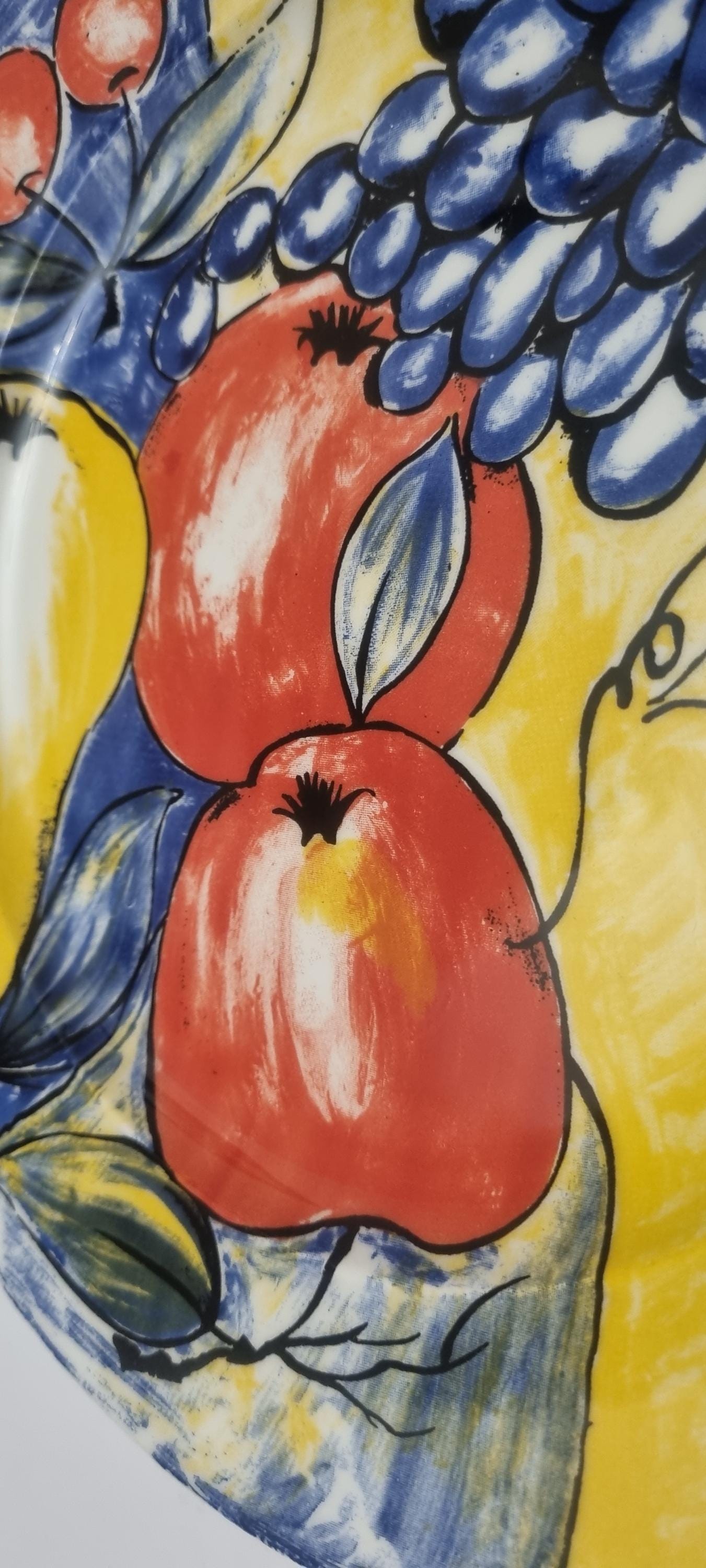 A vibrant vintage serving plate/platter from the Ligne Hôtesse collection. This piece features a striking hand-painted design of grapes, apples, and a pear against a bold yellow and blue background. Can also be displayed as a decorative art piece.
