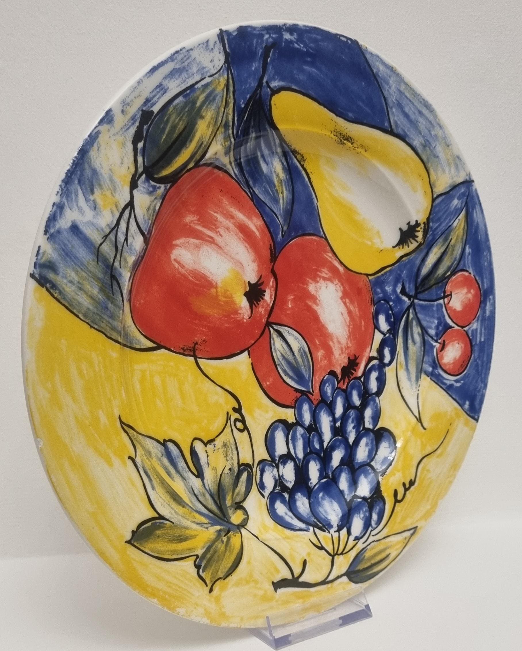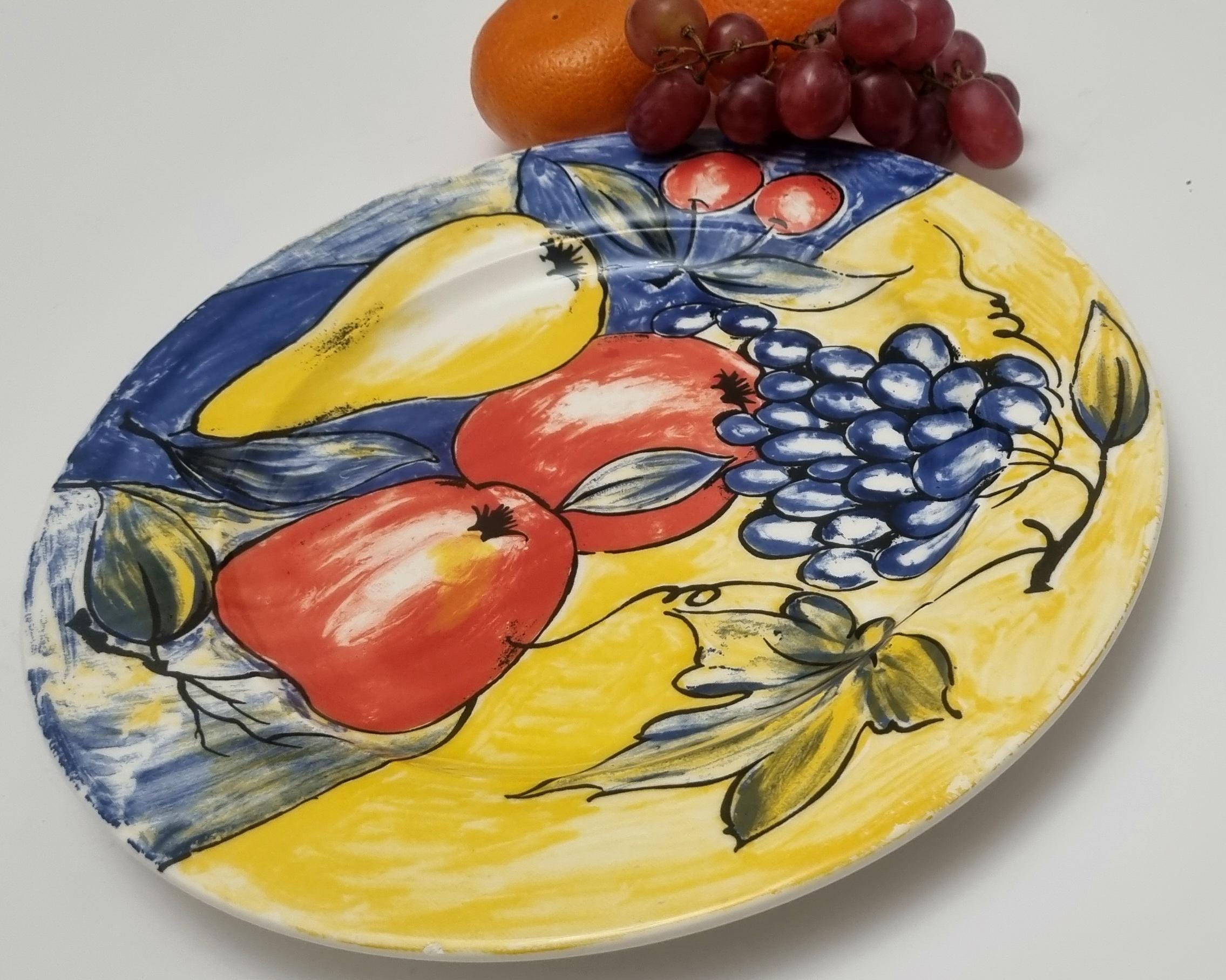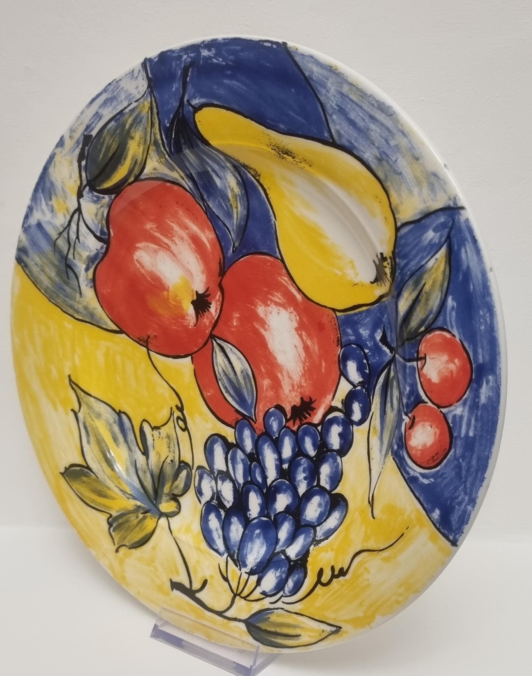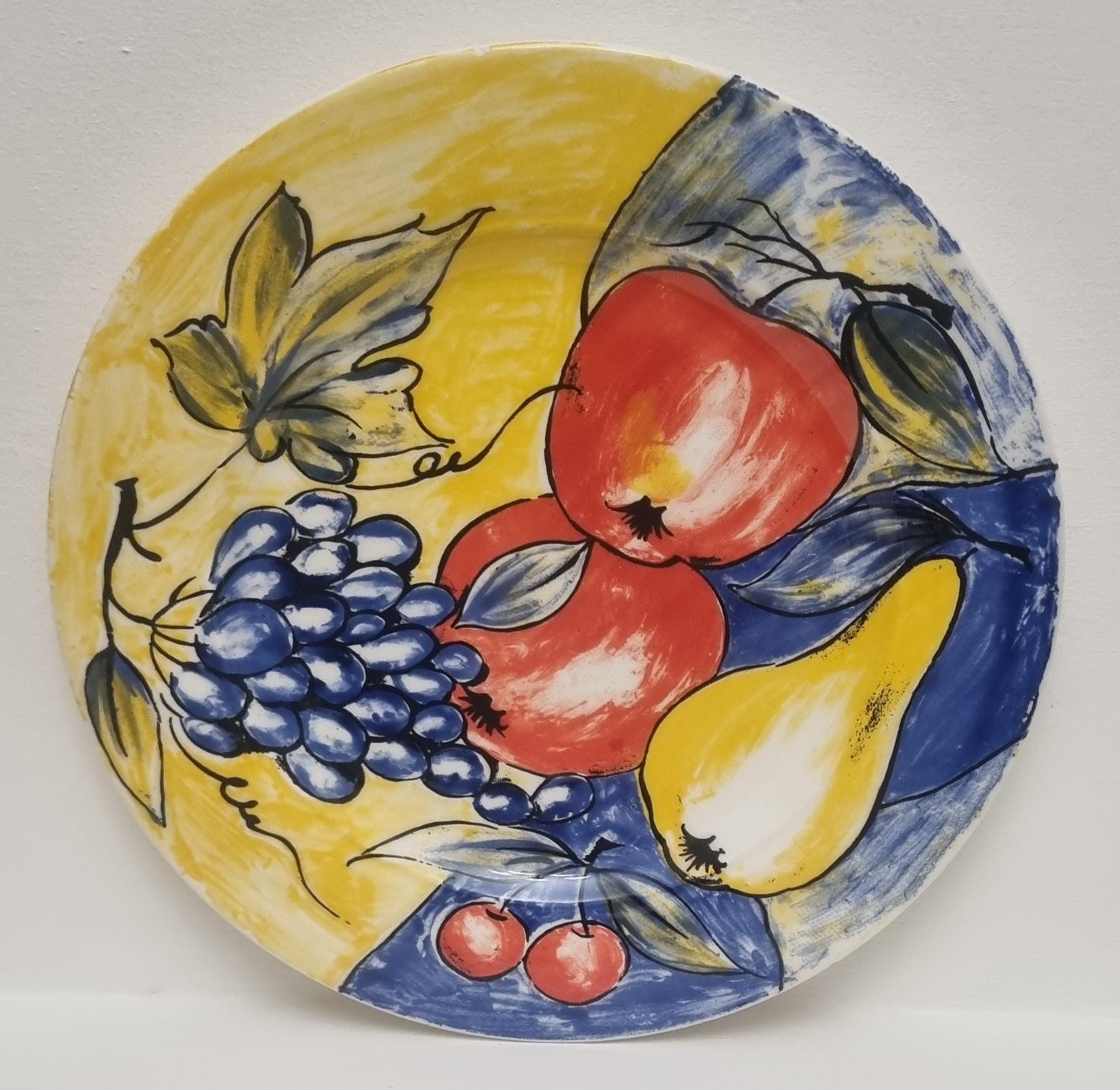 A vibrant vintage serving plate/platter from the Ligne Hôtesse collection. This piece features a striking hand-painted design of grapes, apples, and a pear against a bold yellow and blue background. Can also be displayed as a decorative art piece.