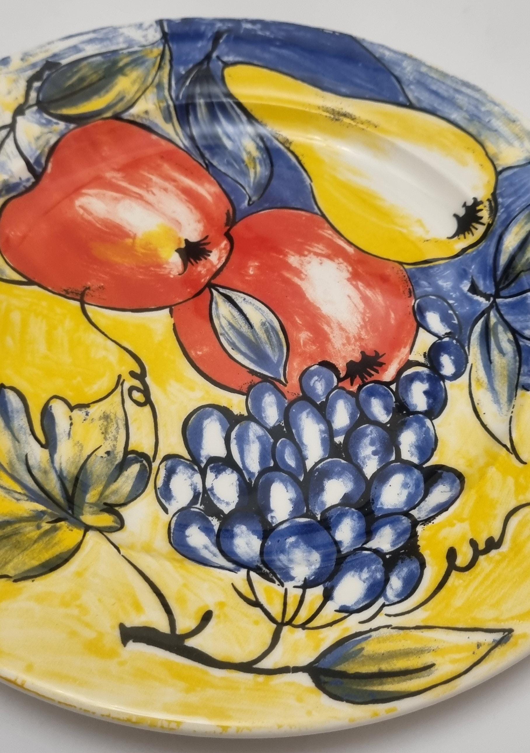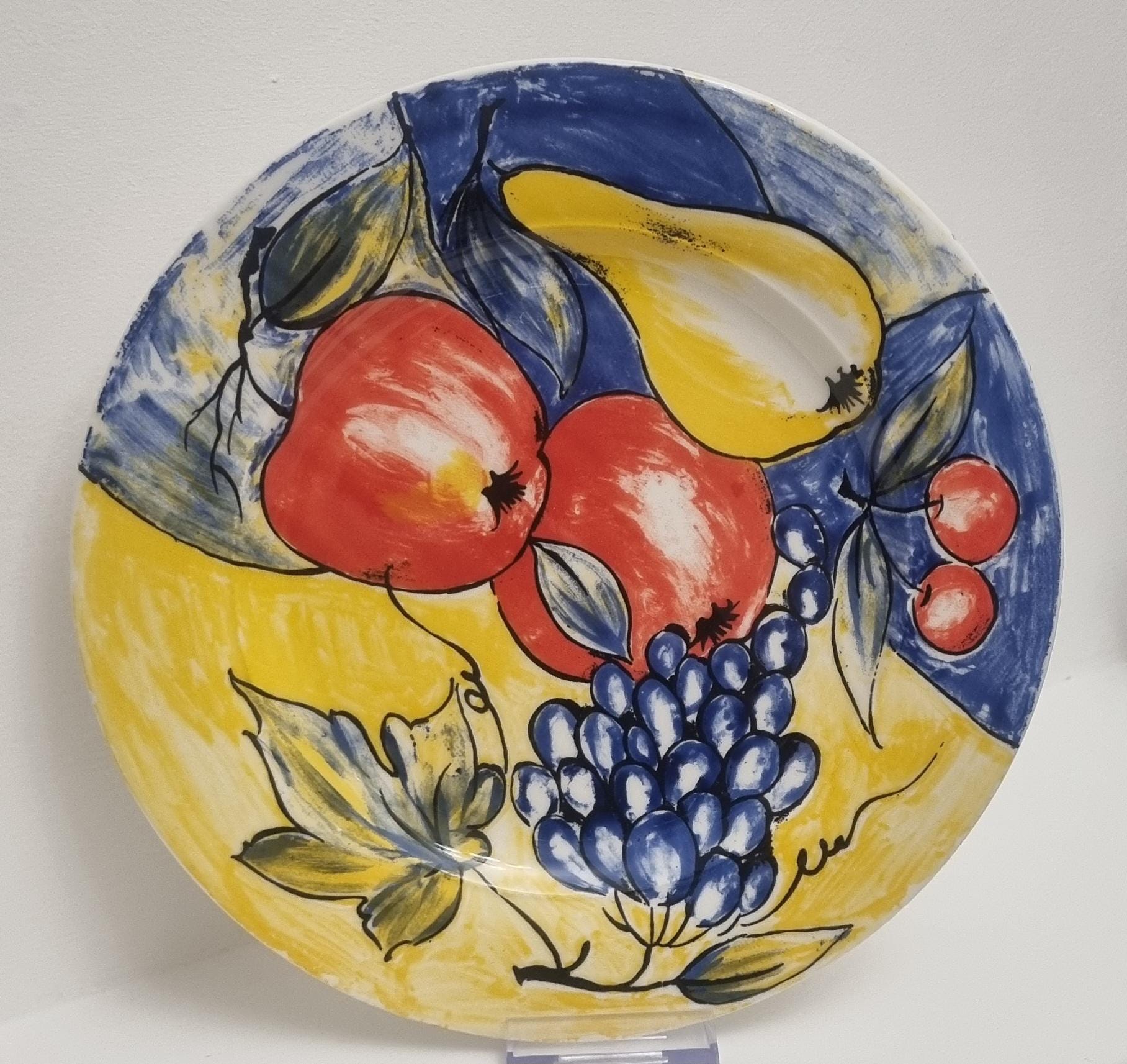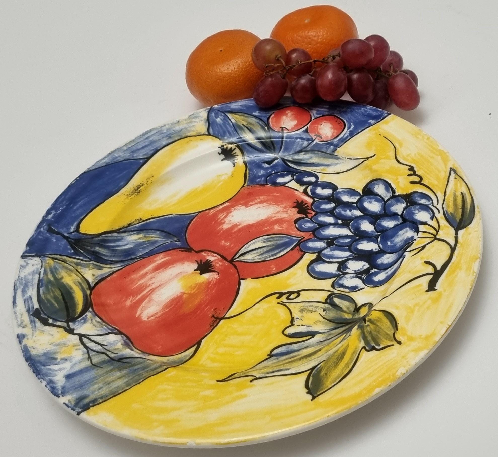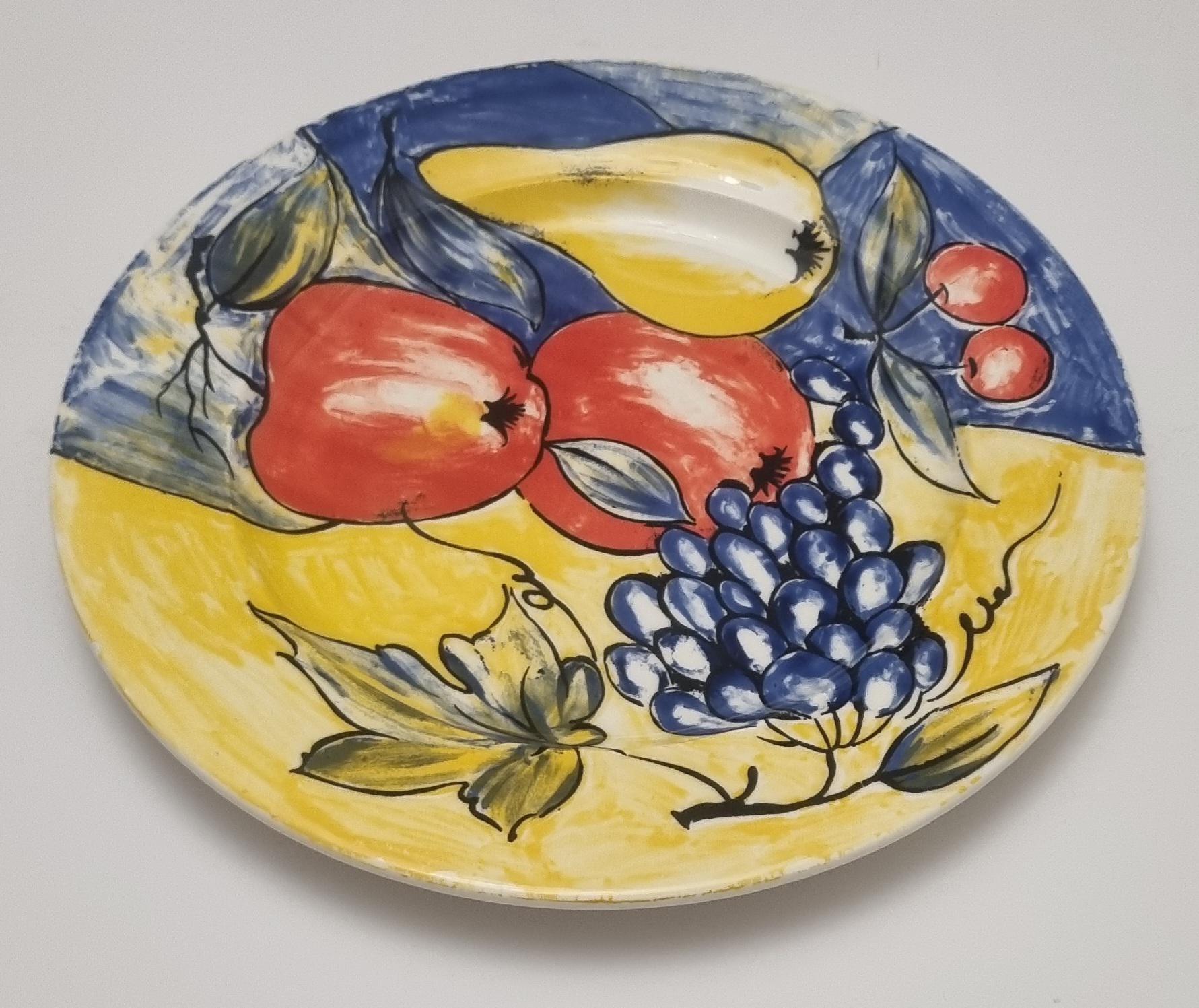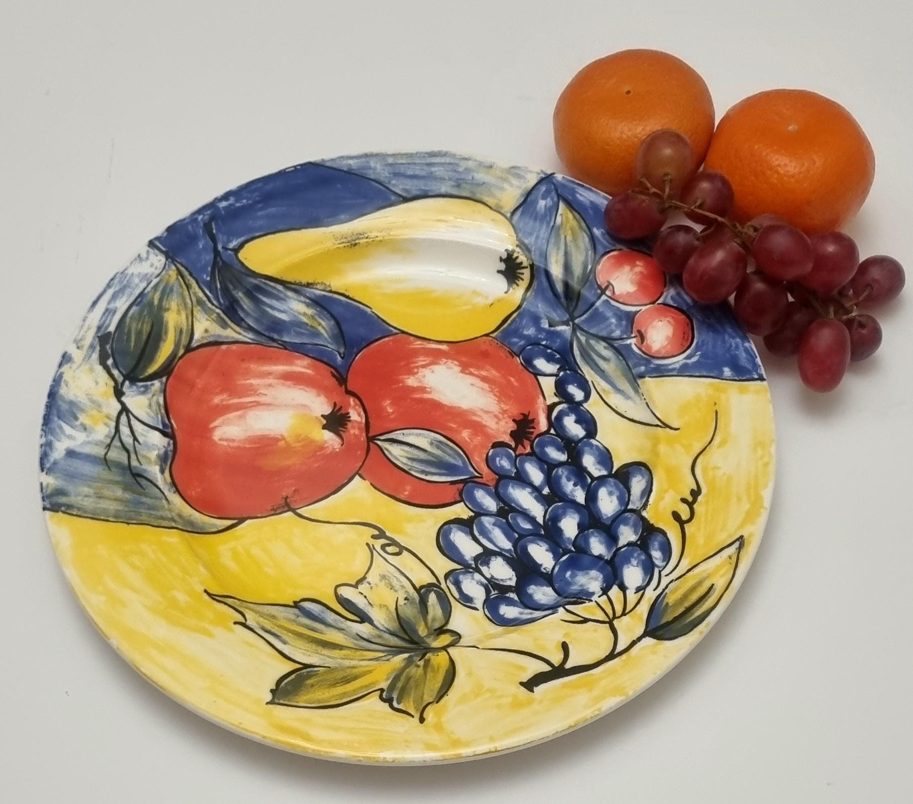 A vibrant vintage serving plate/platter from the Ligne Hôtesse collection. This piece features a striking hand-painted design of grapes, apples, and a pear against a bold yellow and blue background. Can also be displayed as a decorative art piece.