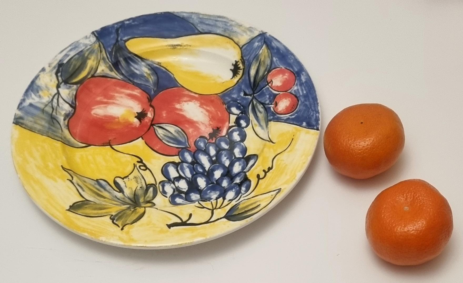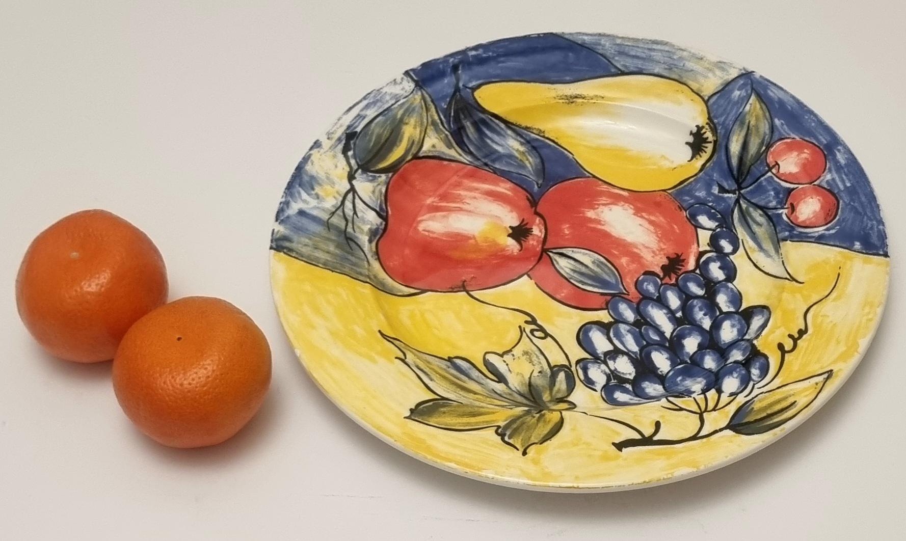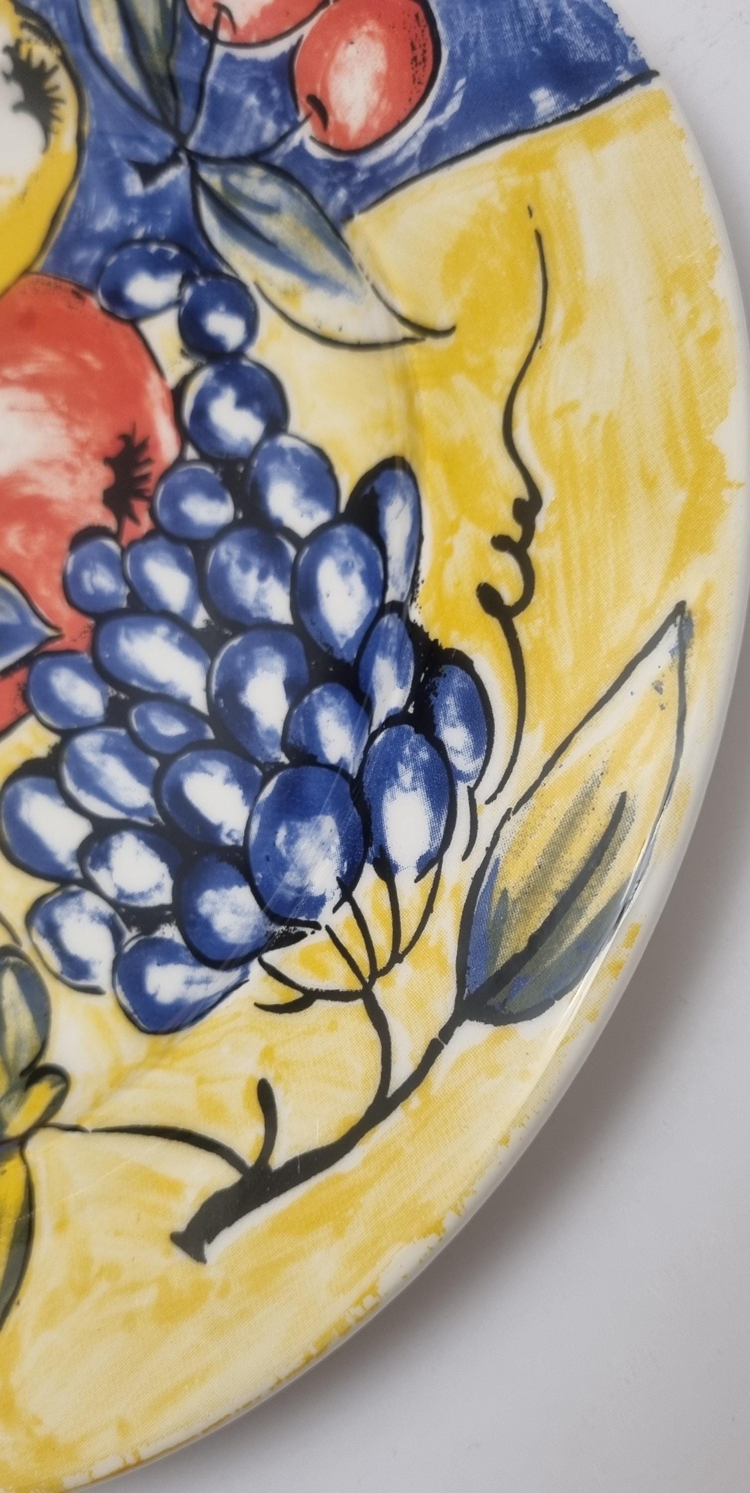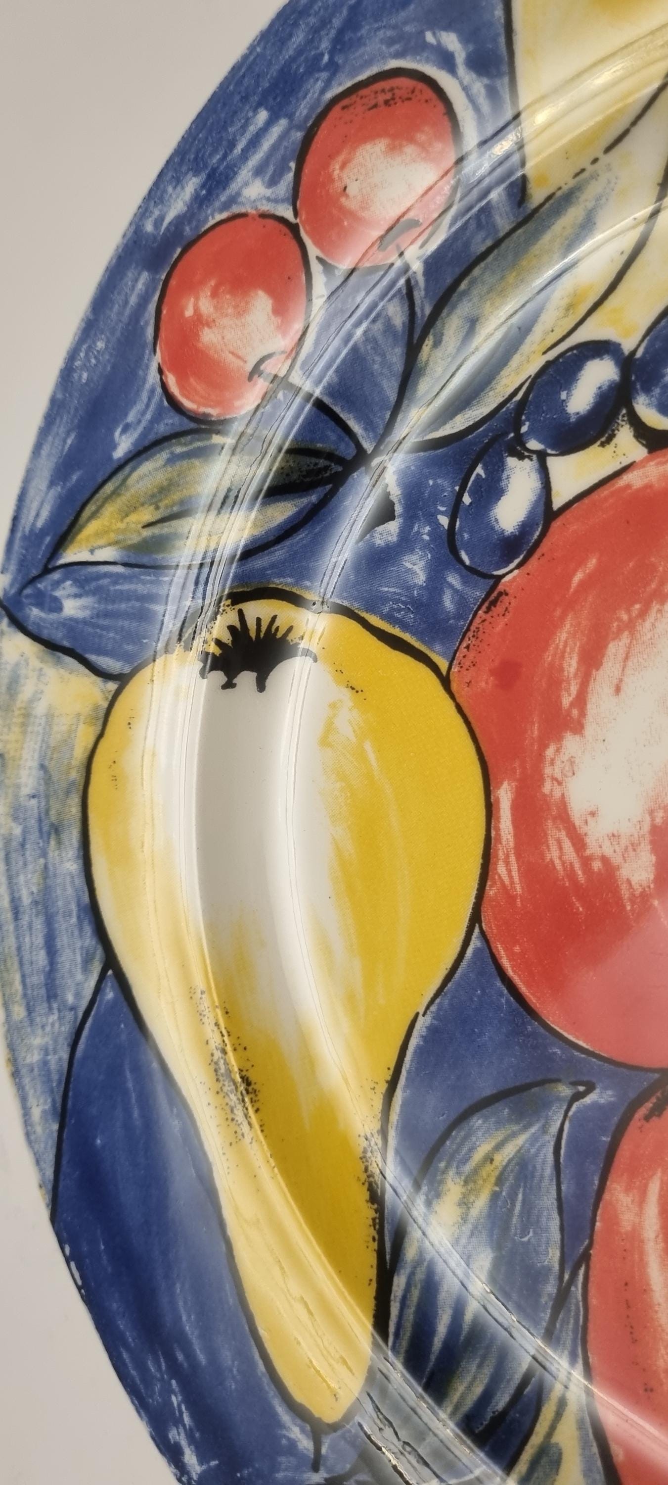 A vibrant vintage serving plate/platter from the Ligne Hôtesse collection. This piece features a striking hand-painted design of grapes, apples, and a pear against a bold yellow and blue background. Can also be displayed as a decorative art piece.