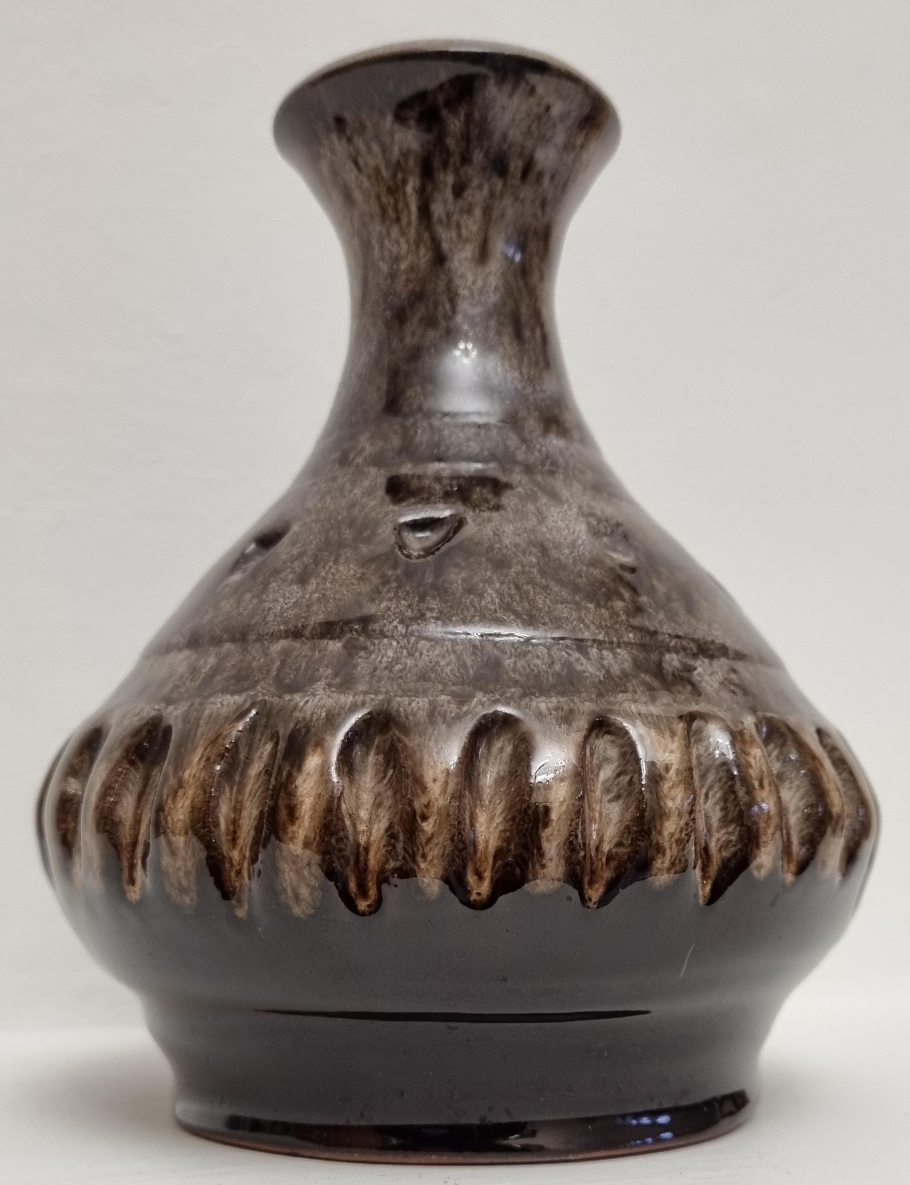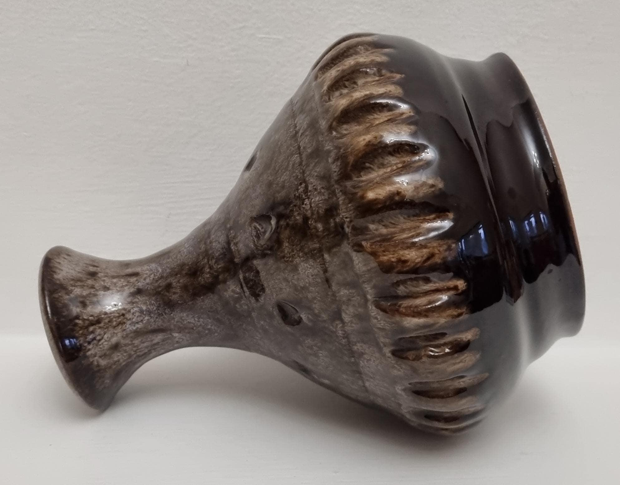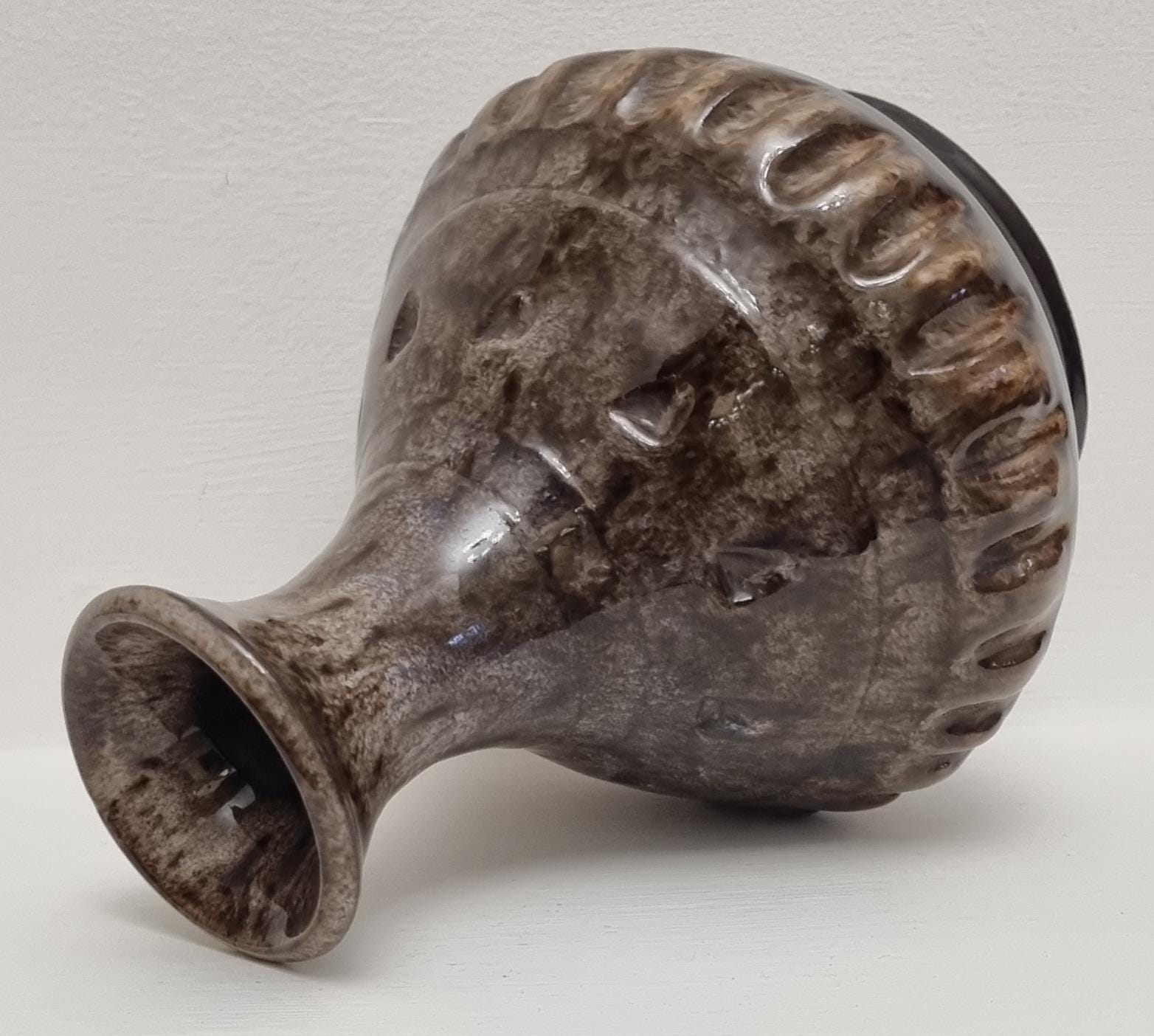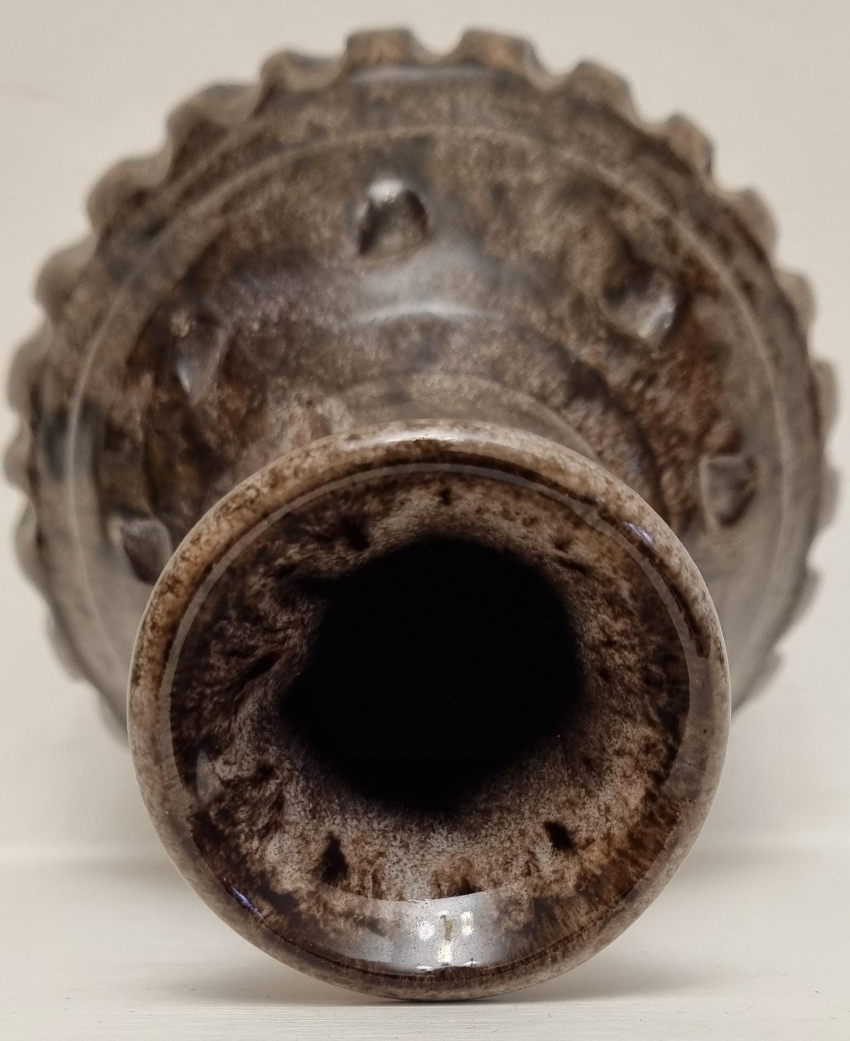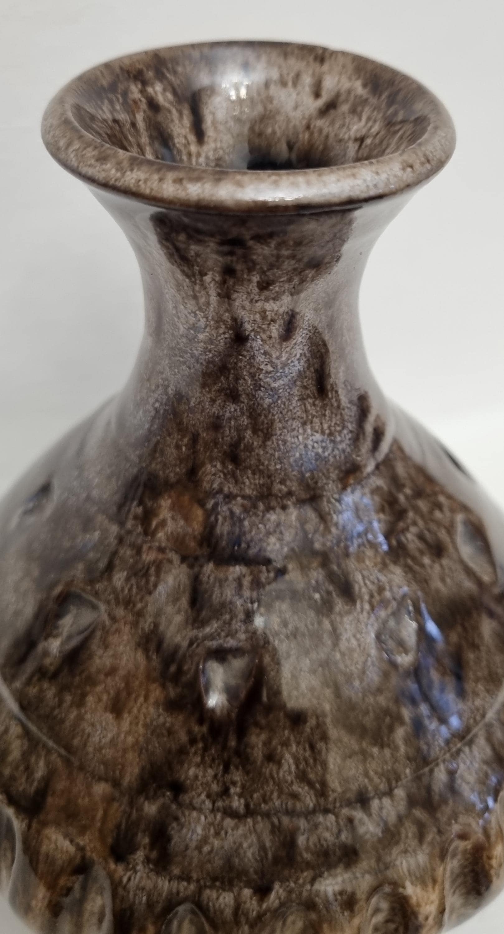This vintage mid century modern studio pottery vase features a classic bulbous body with a flared neck and a striking ribbed, thumbprint texture around the centre. It has a earthy, tactile, and artisan-crafted vibe and sort of a brutalist/rustic style.