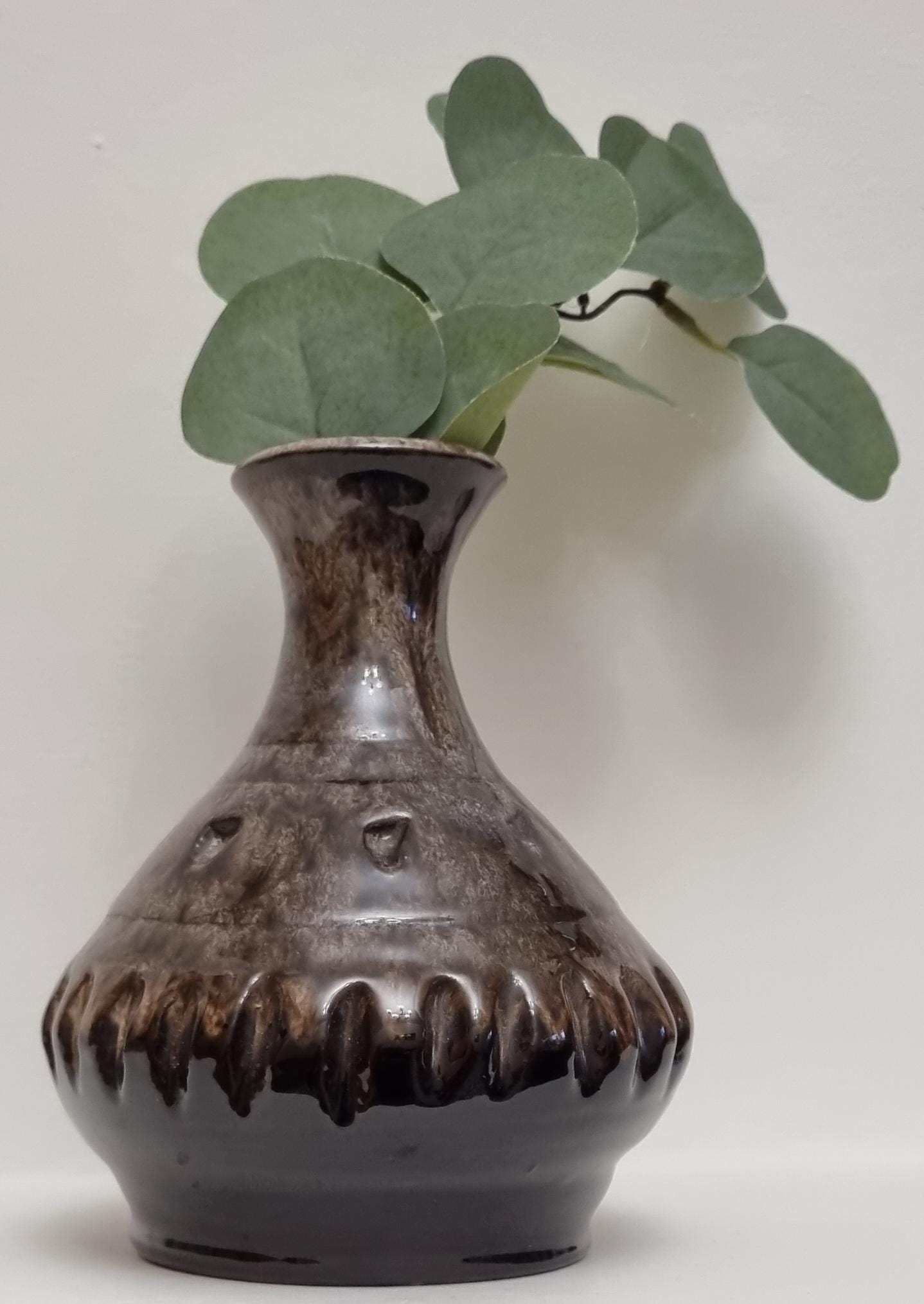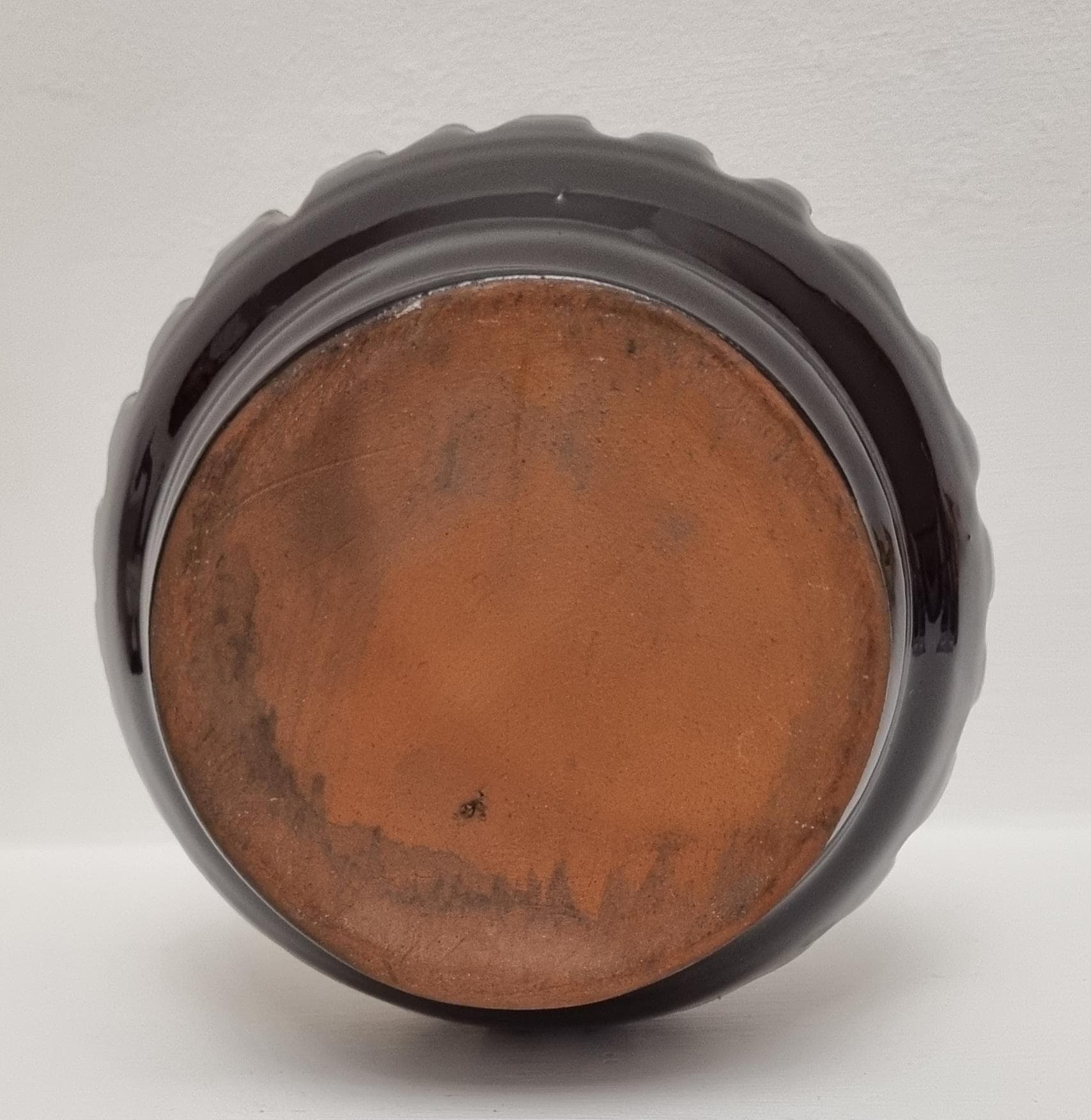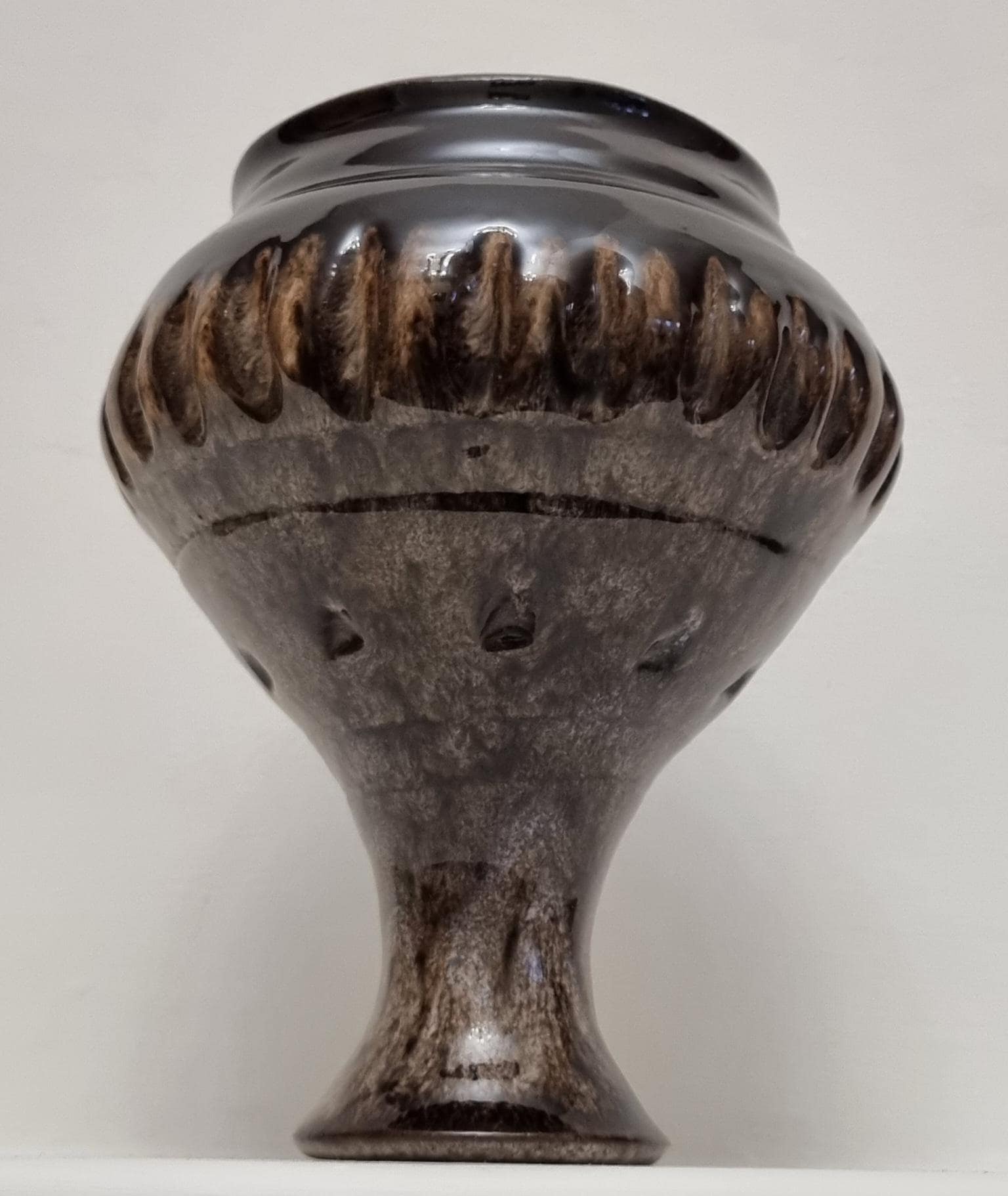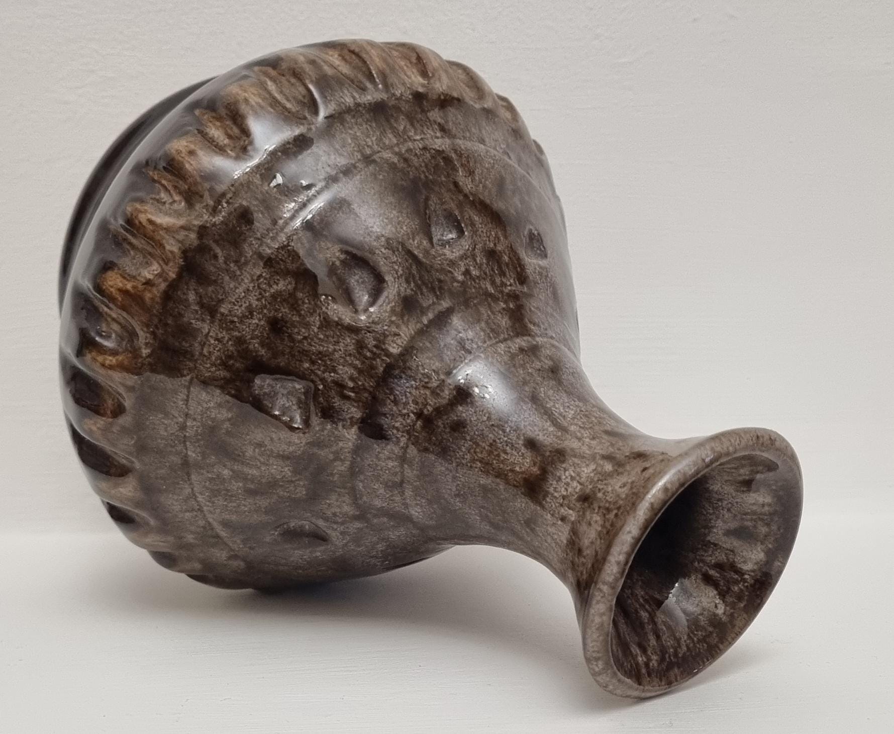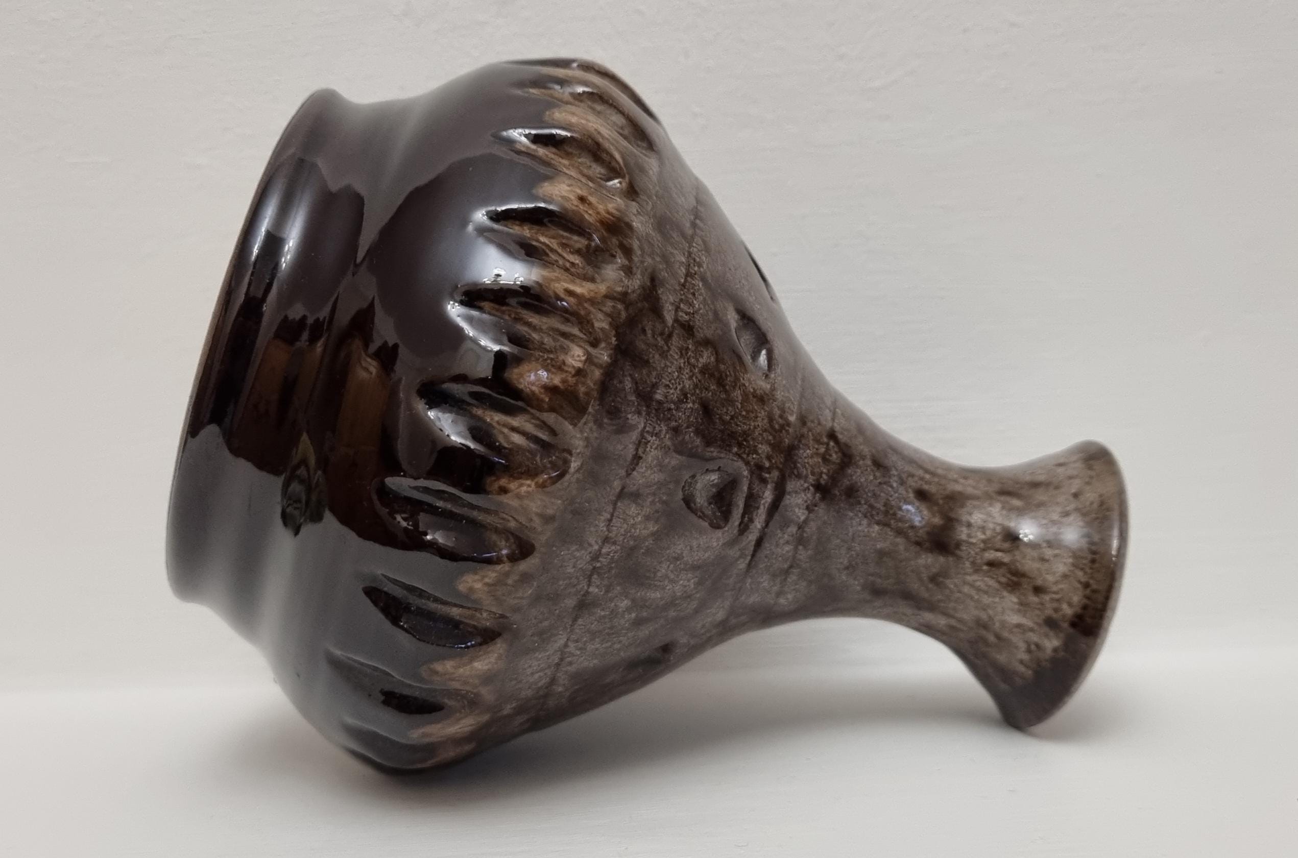 This vintage mid century modern studio pottery vase features a classic bulbous body with a flared neck and a striking ribbed, thumbprint texture around the centre. It has a earthy, tactile, and artisan-crafted vibe and sort of a brutalist/rustic style.