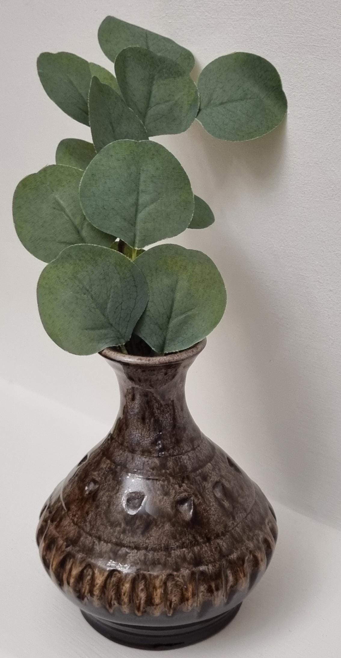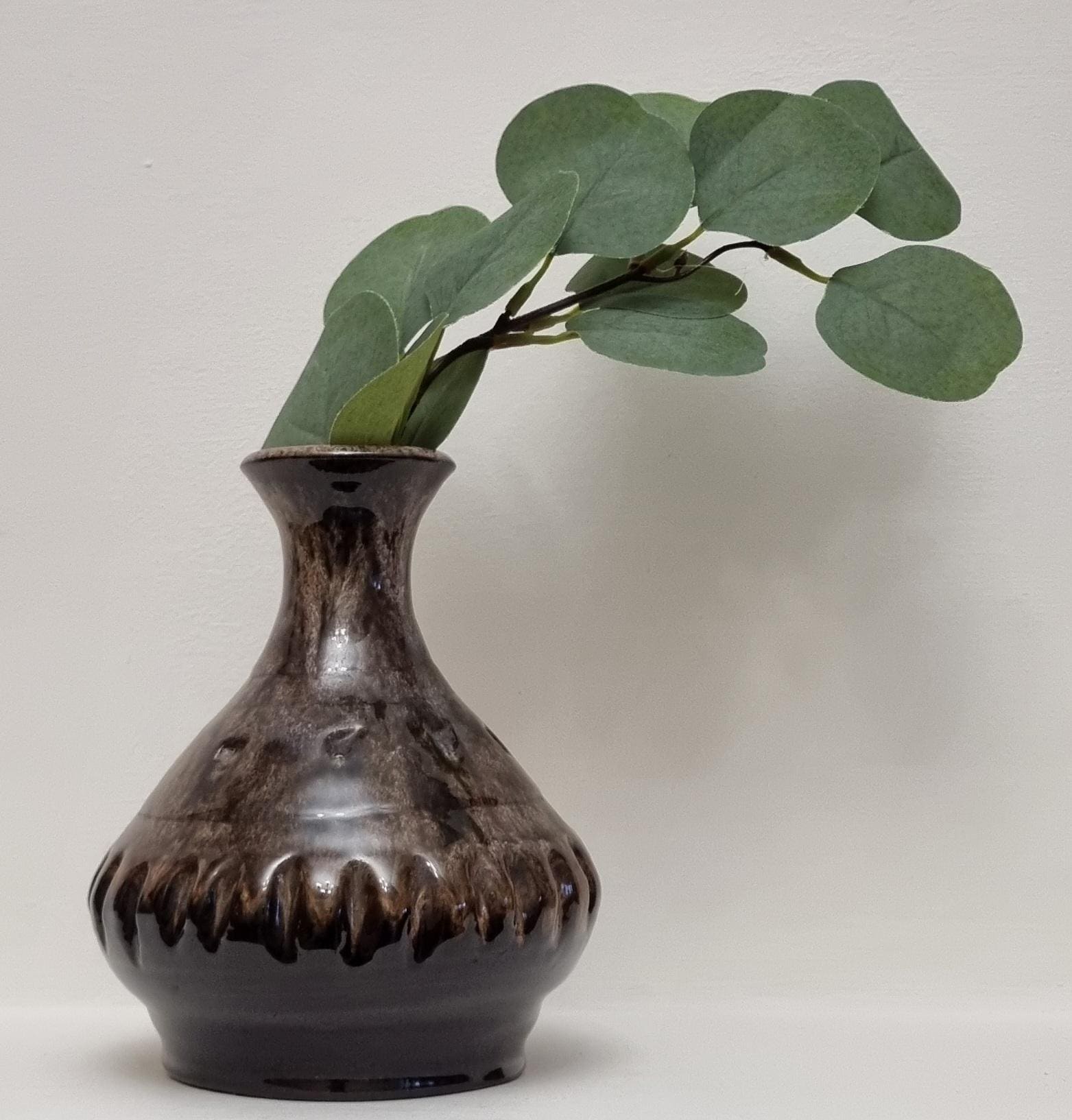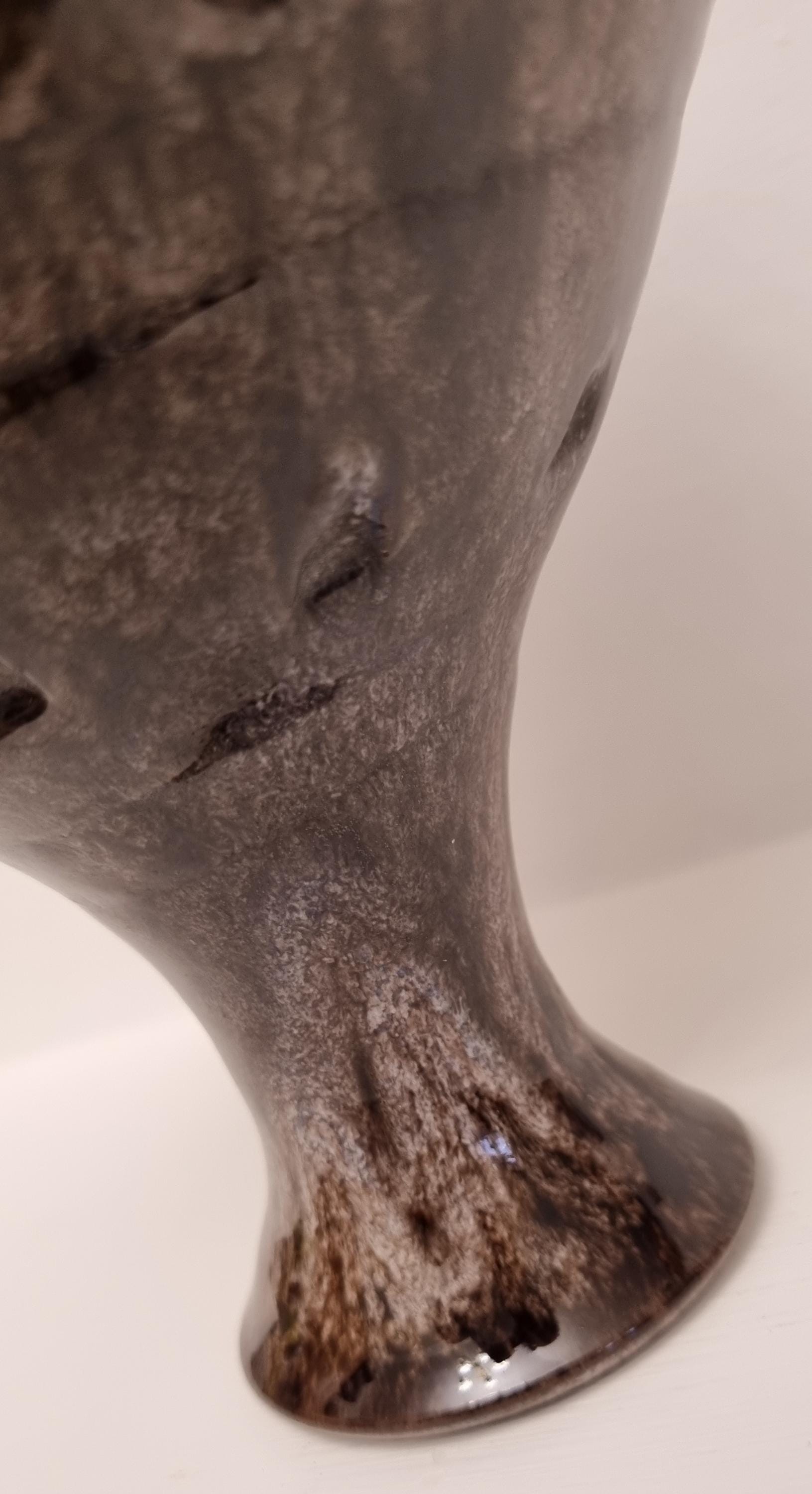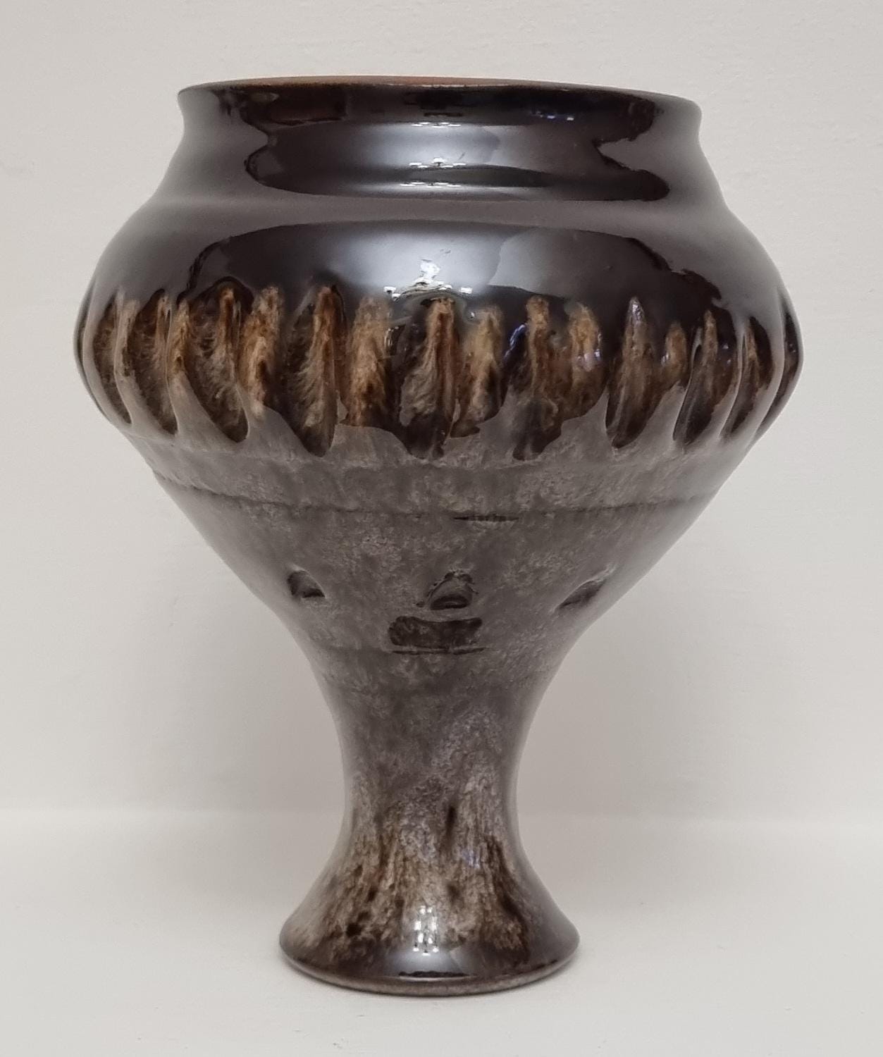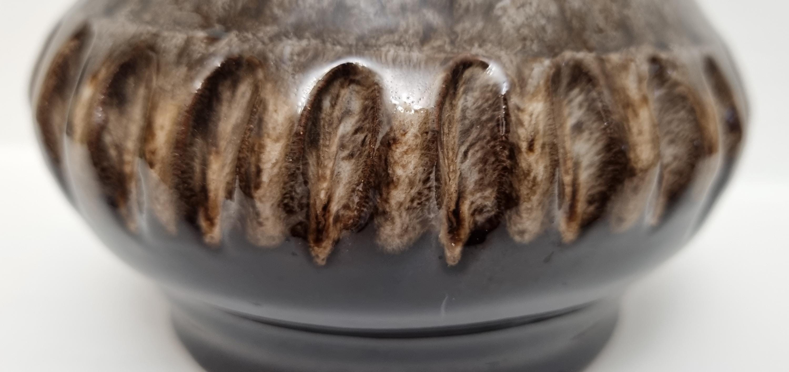 This vintage mid century modern studio pottery vase features a classic bulbous body with a flared neck and a striking ribbed, thumbprint texture around the centre. It has a earthy, tactile, and artisan-crafted vibe and sort of a brutalist/rustic style.