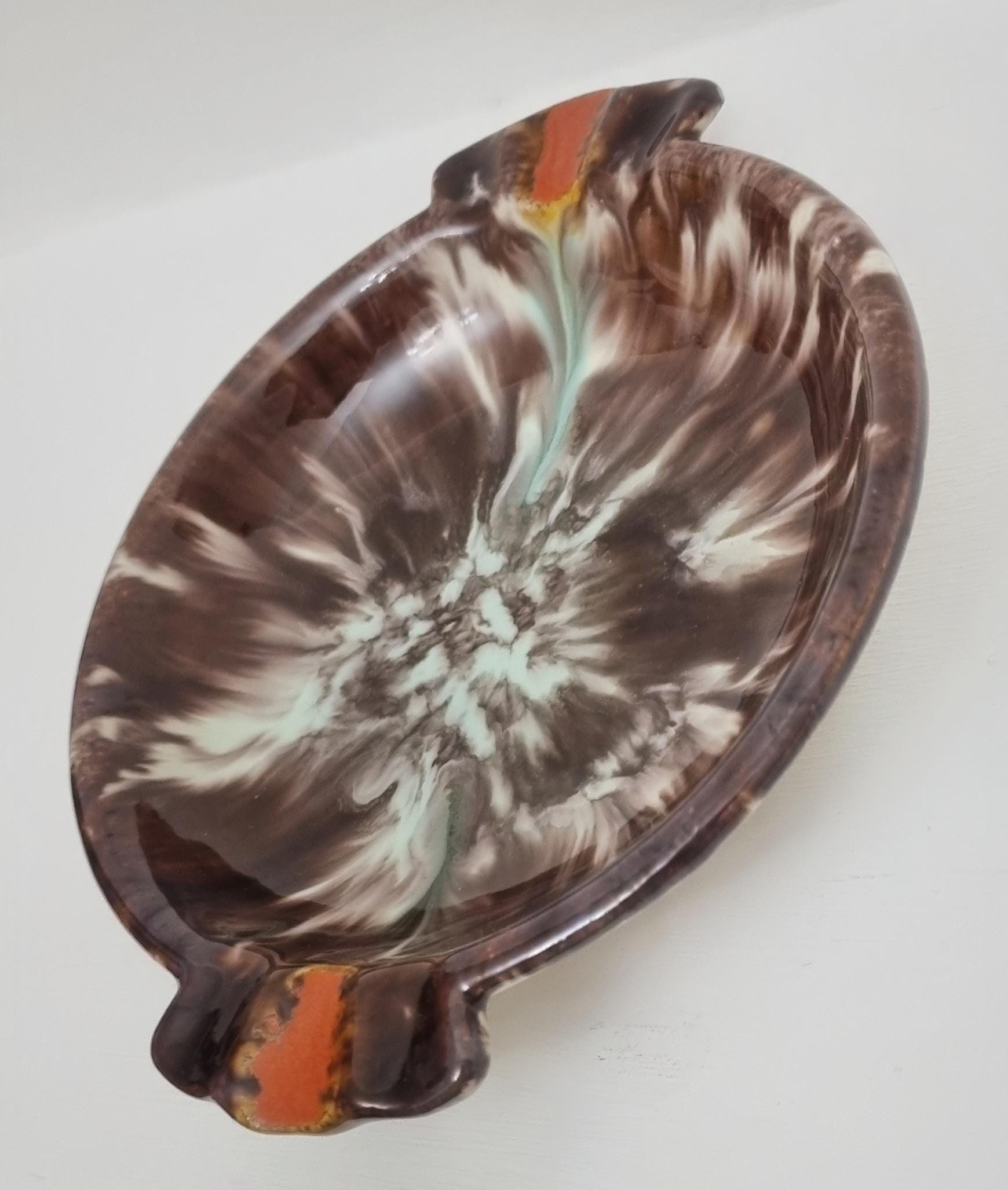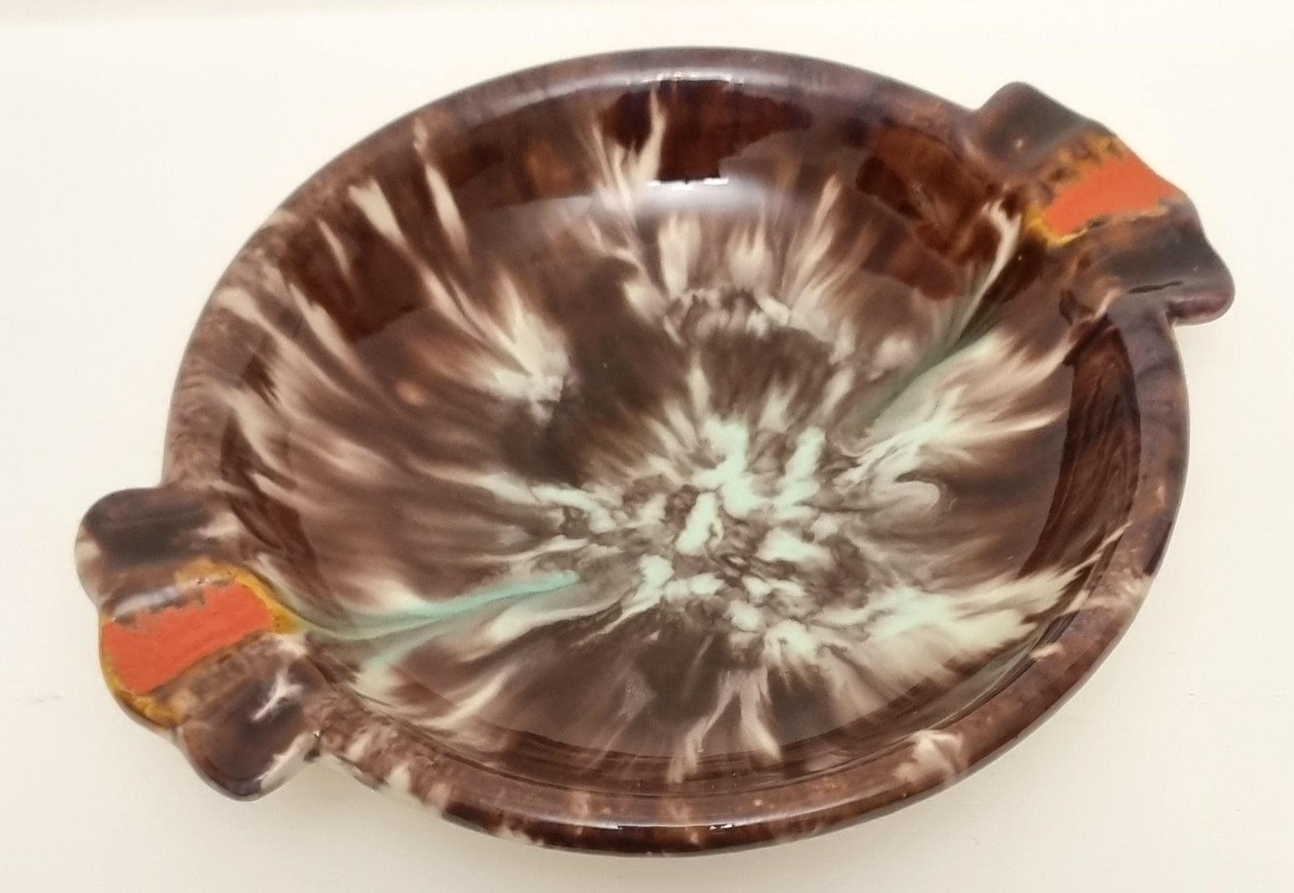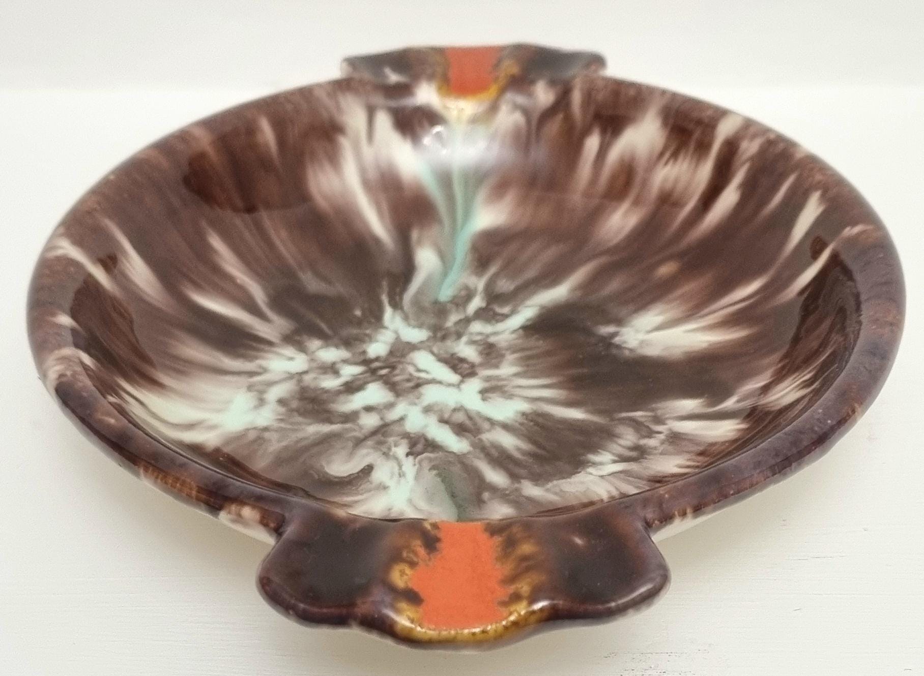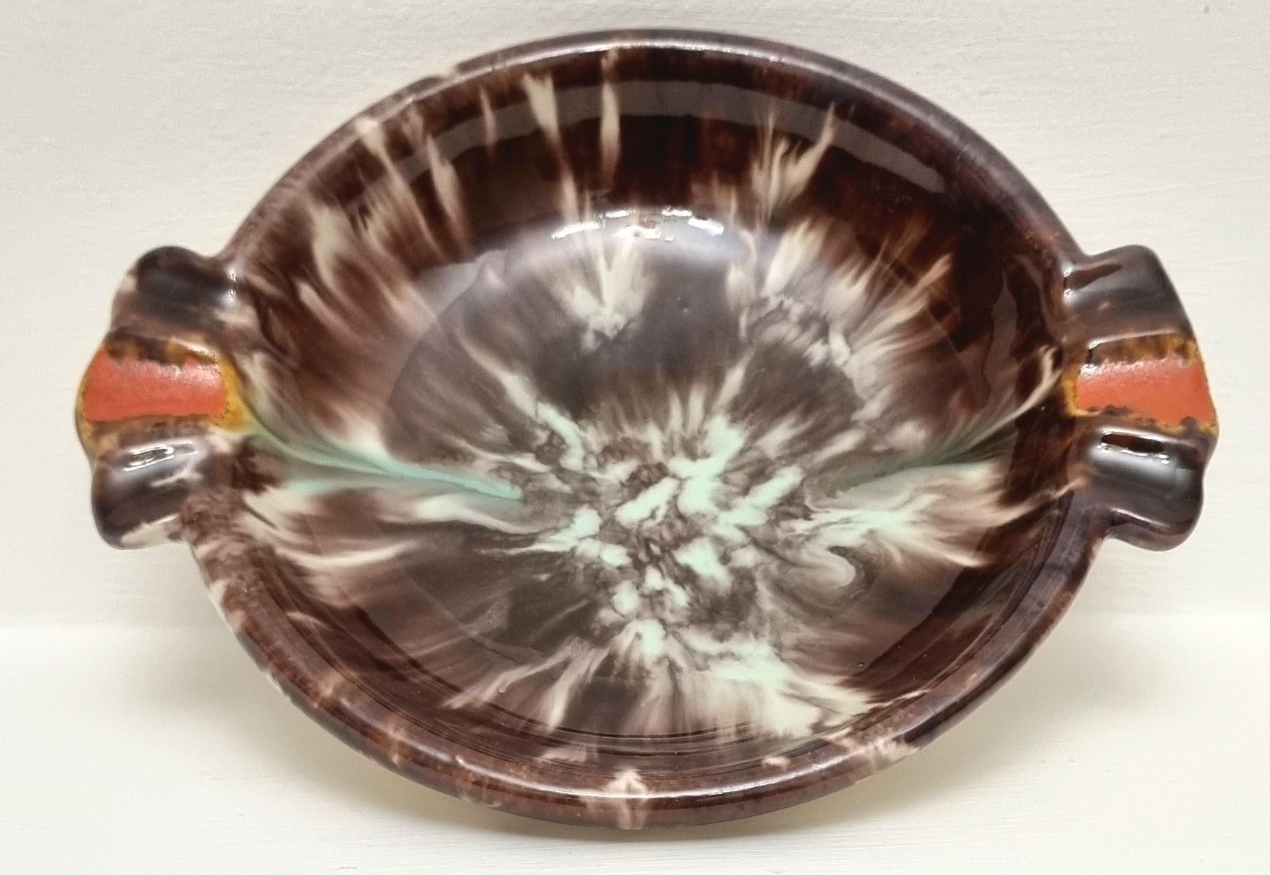 This vintage West German Pottery (WGP) ashtray or trinket dish features a deep, high-gloss chocolate brown base enriched with a dramatic volcanic drip glaze. The centre erupts with a starburst of cream and pale seafoam green, while the dual cigarette rests are highlighted with bold, lava-orange accents.