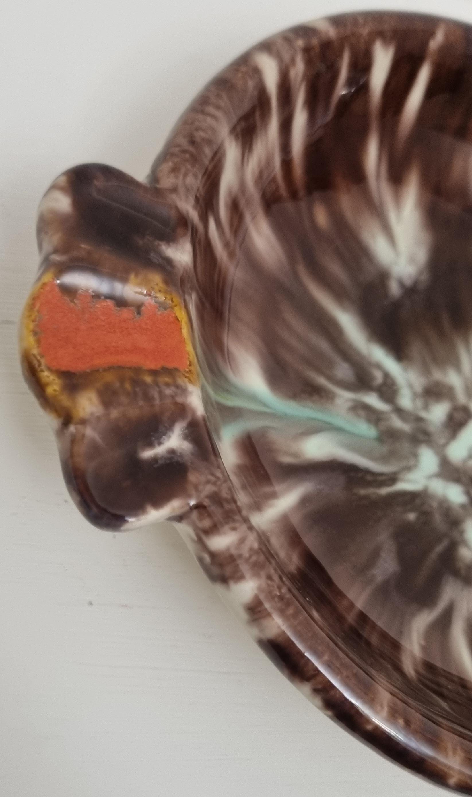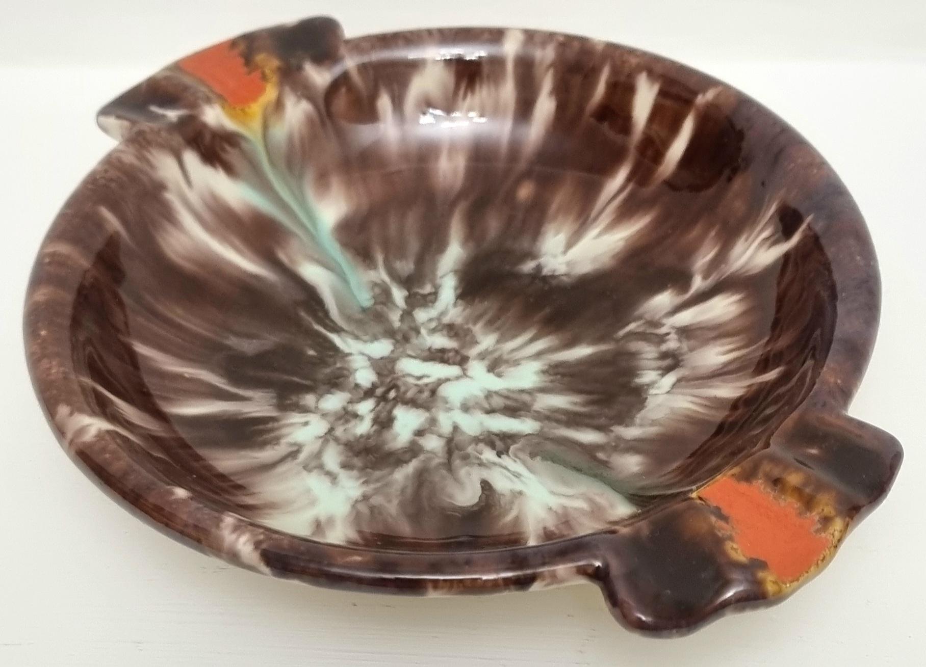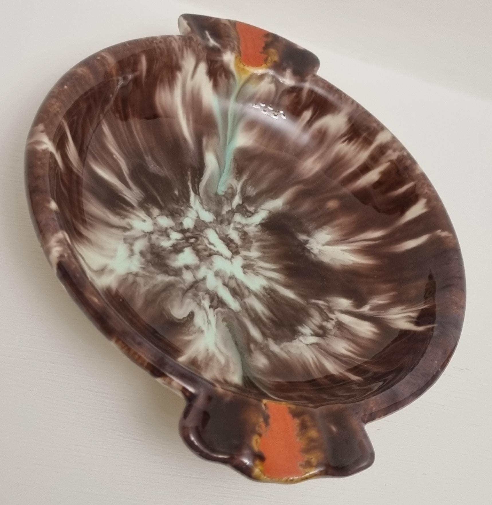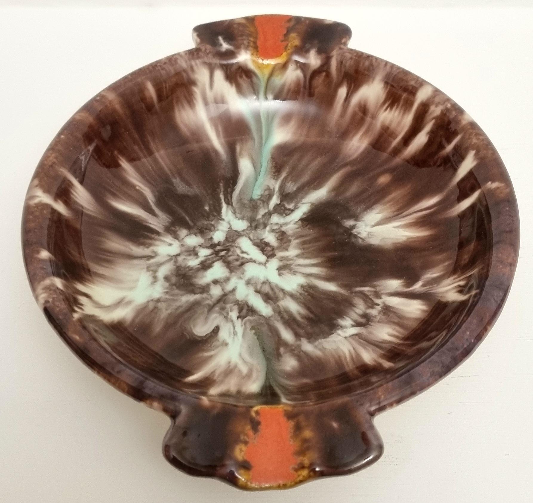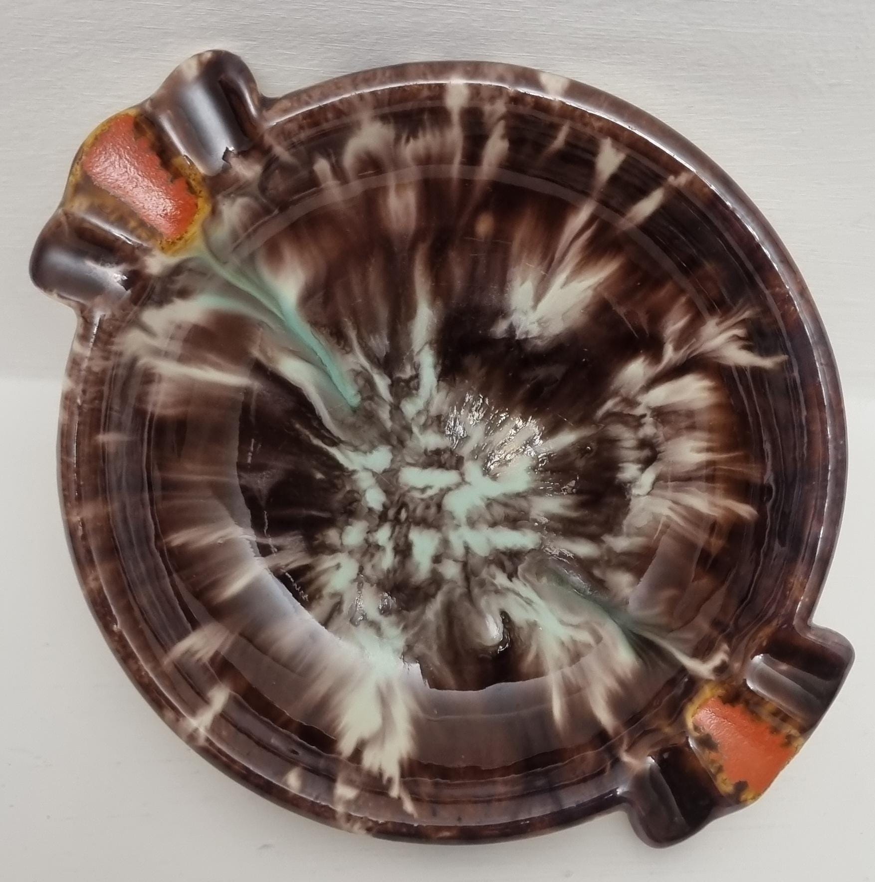 This vintage West German Pottery (WGP) ashtray or trinket dish features a deep, high-gloss chocolate brown base enriched with a dramatic volcanic drip glaze. The centre erupts with a starburst of cream and pale seafoam green, while the dual cigarette rests are highlighted with bold, lava-orange accents.