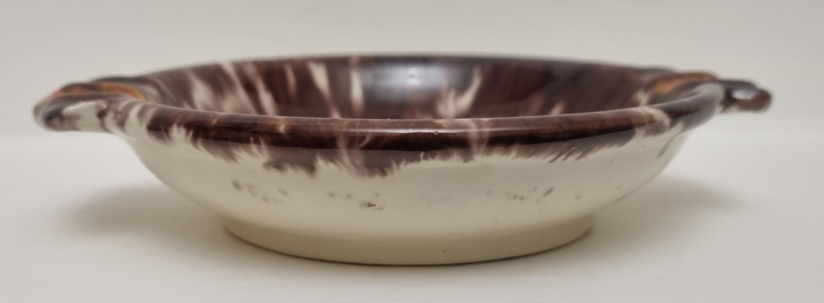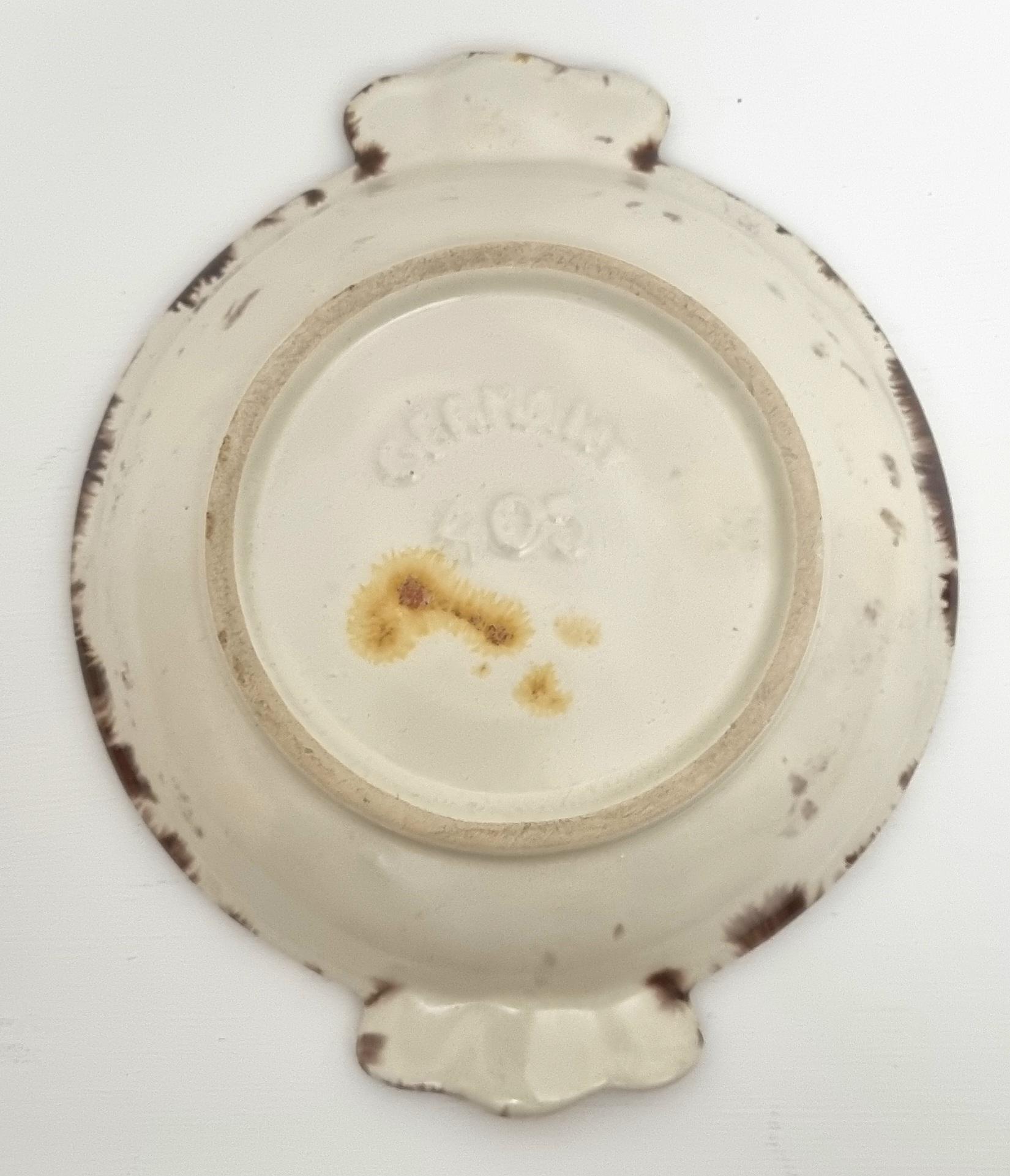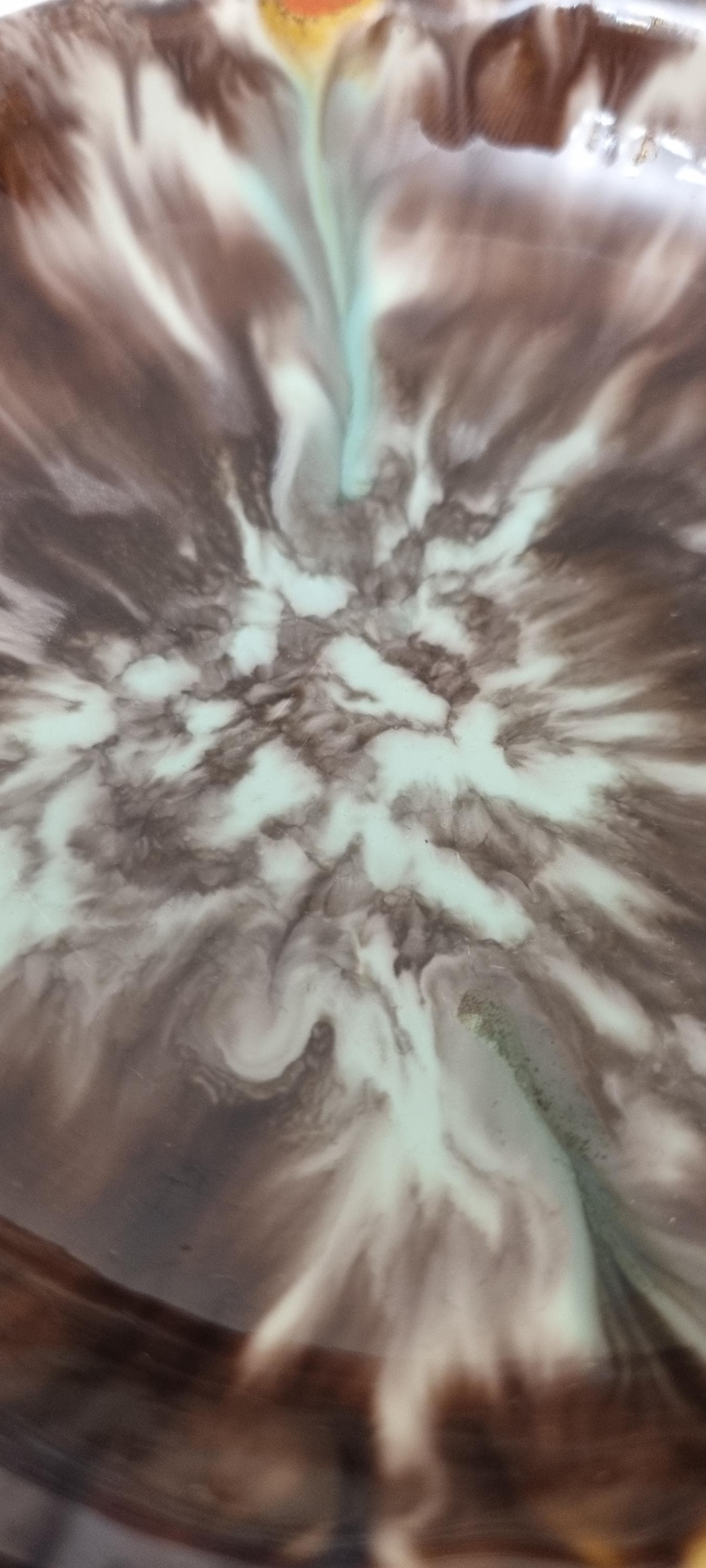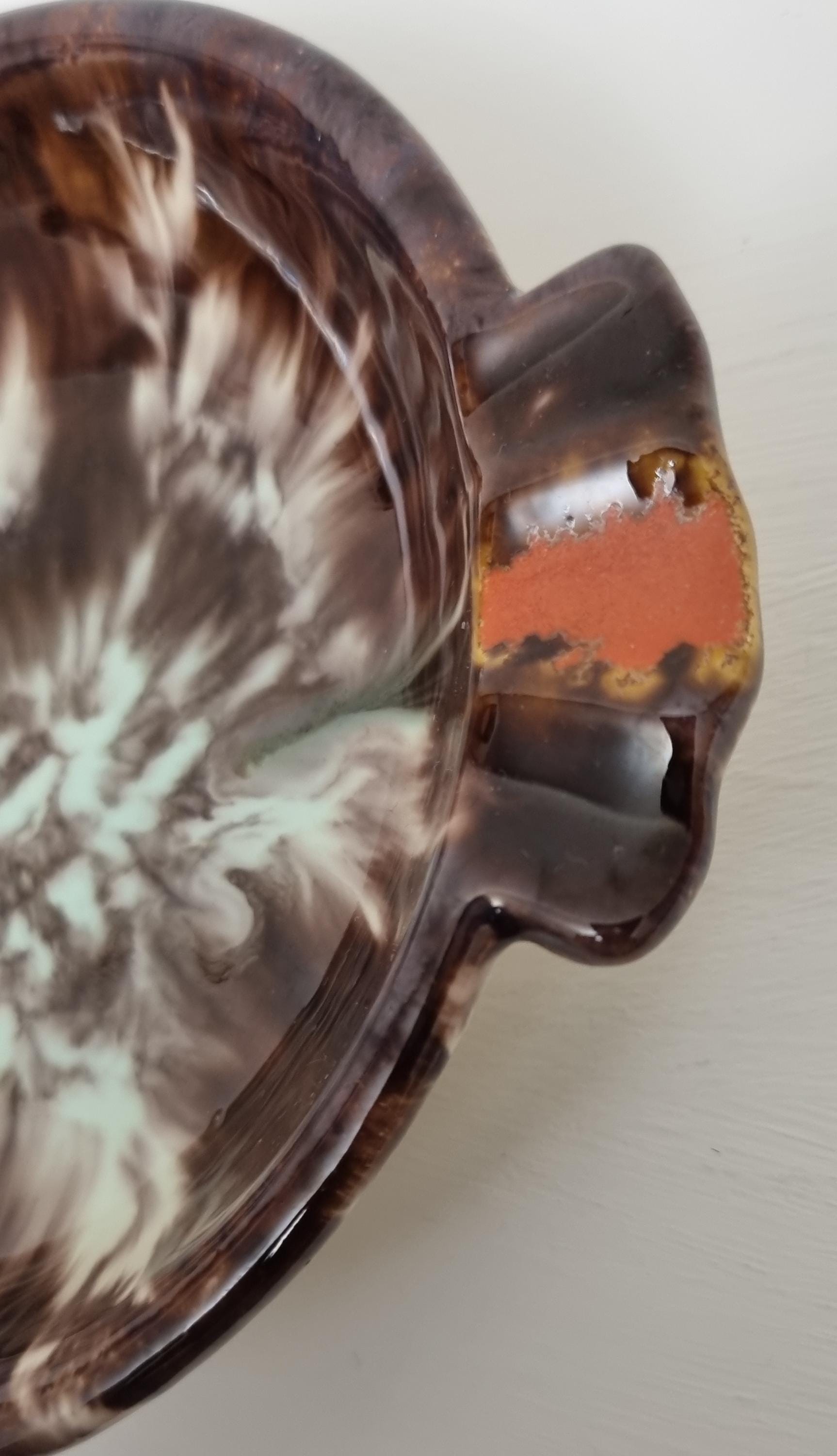 This vintage West German Pottery (WGP) ashtray or trinket dish features a deep, high-gloss chocolate brown base enriched with a dramatic volcanic drip glaze. The centre erupts with a starburst of cream and pale seafoam green, while the dual cigarette rests are highlighted with bold, lava-orange accents.