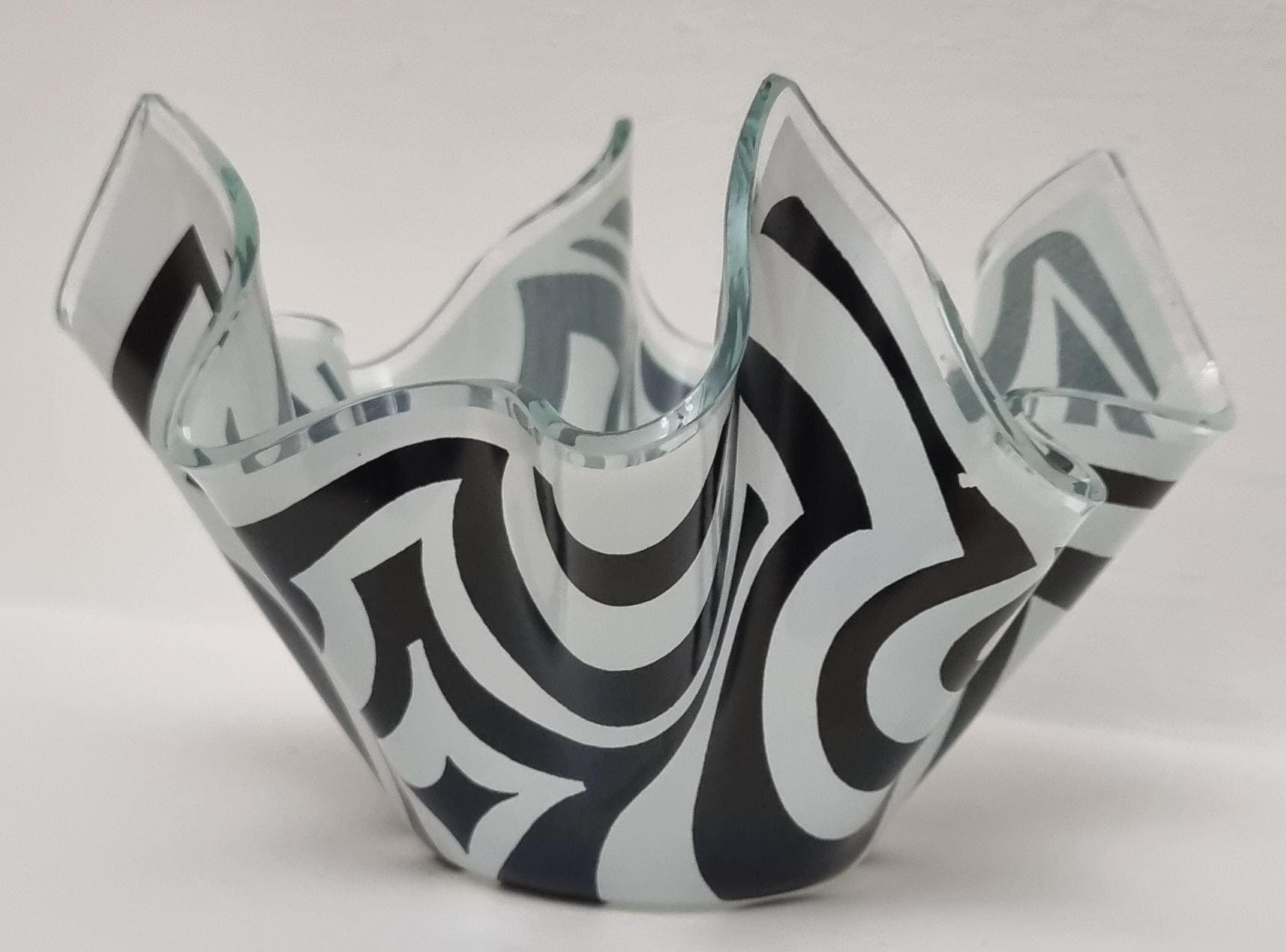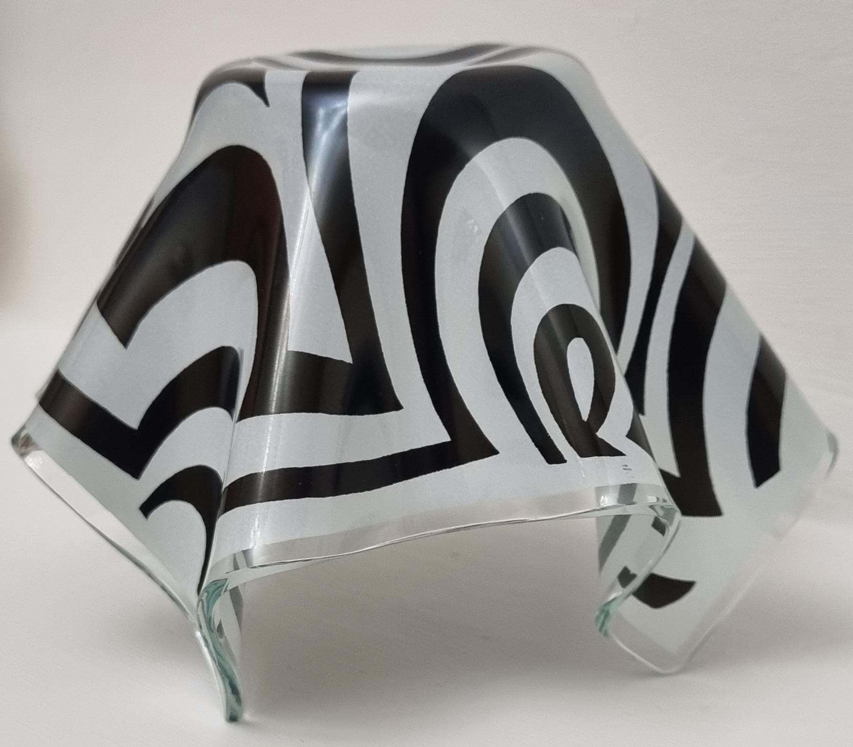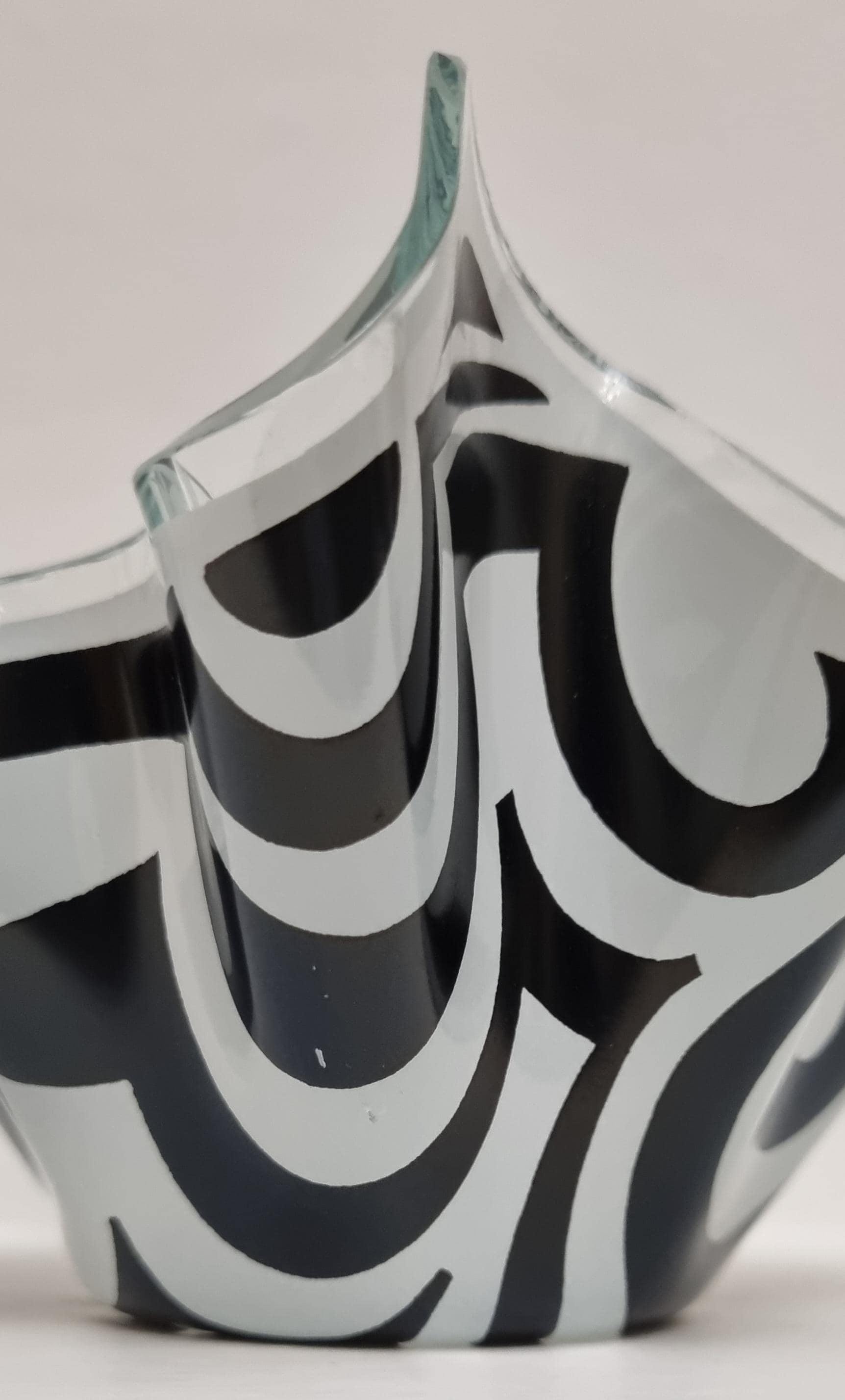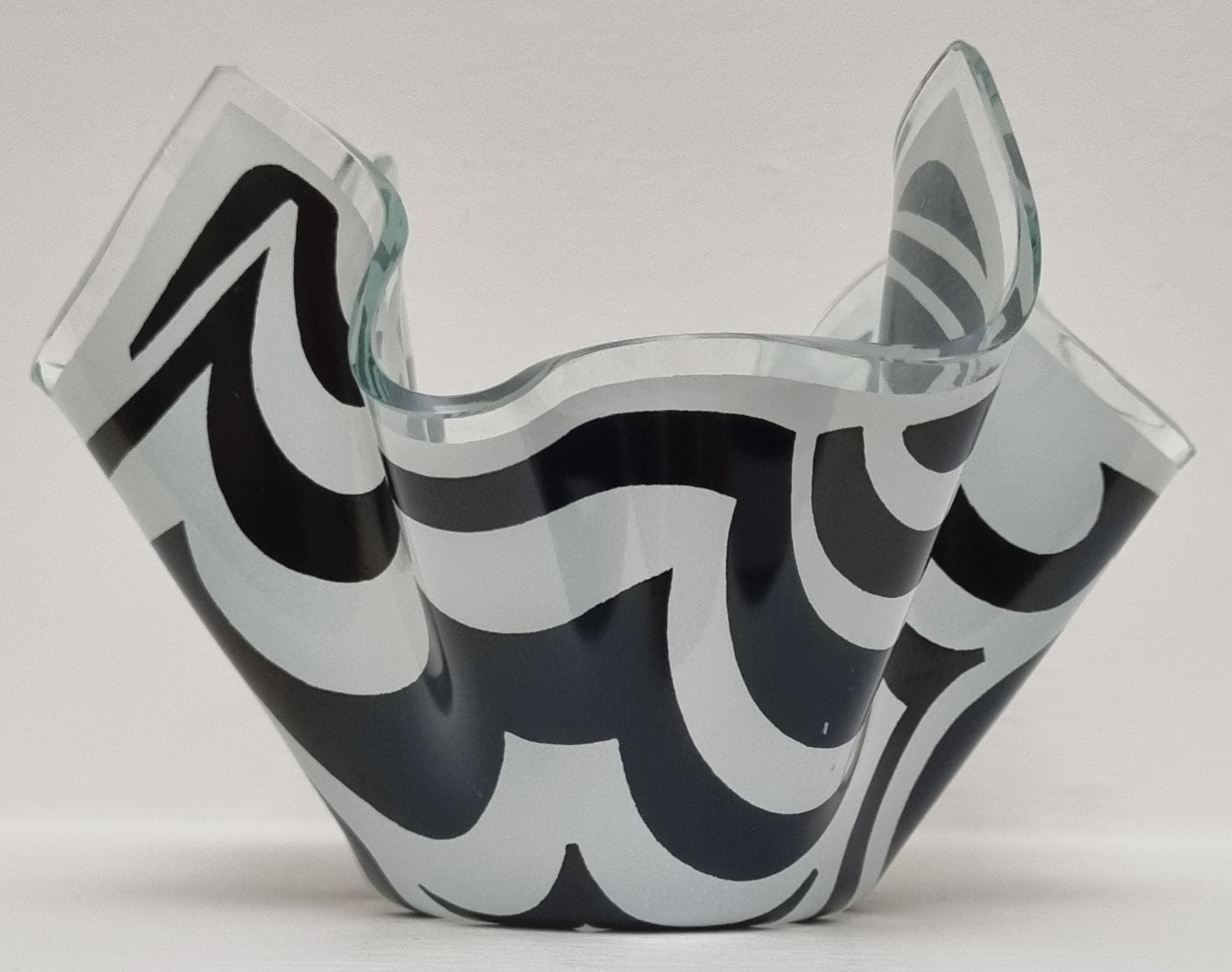 Mid-Century Modern handkerchief vase by the renowned British manufacturer Chance Glass. It features the highly collectible "Psychedelic" pattern, characterized by bold, swirling black and white Op-Art waves that create a striking optical effect.