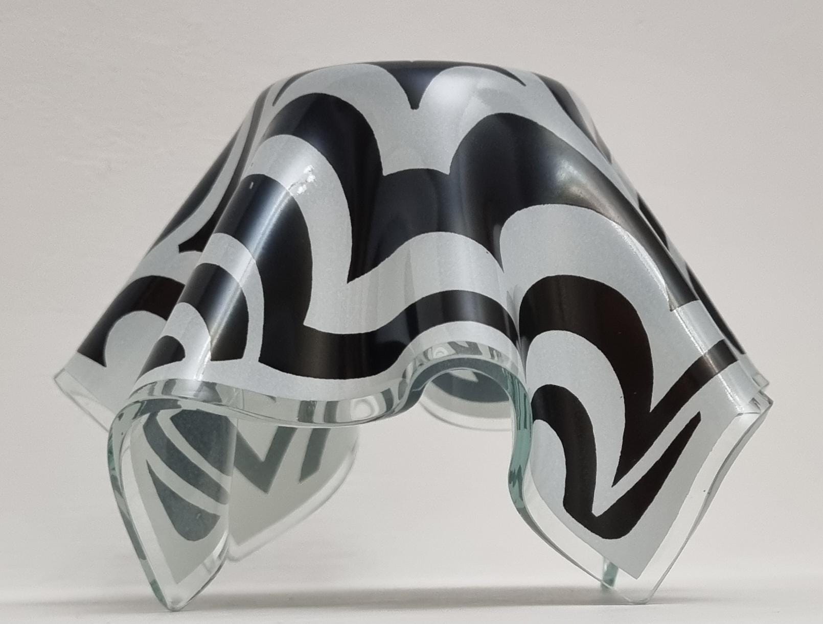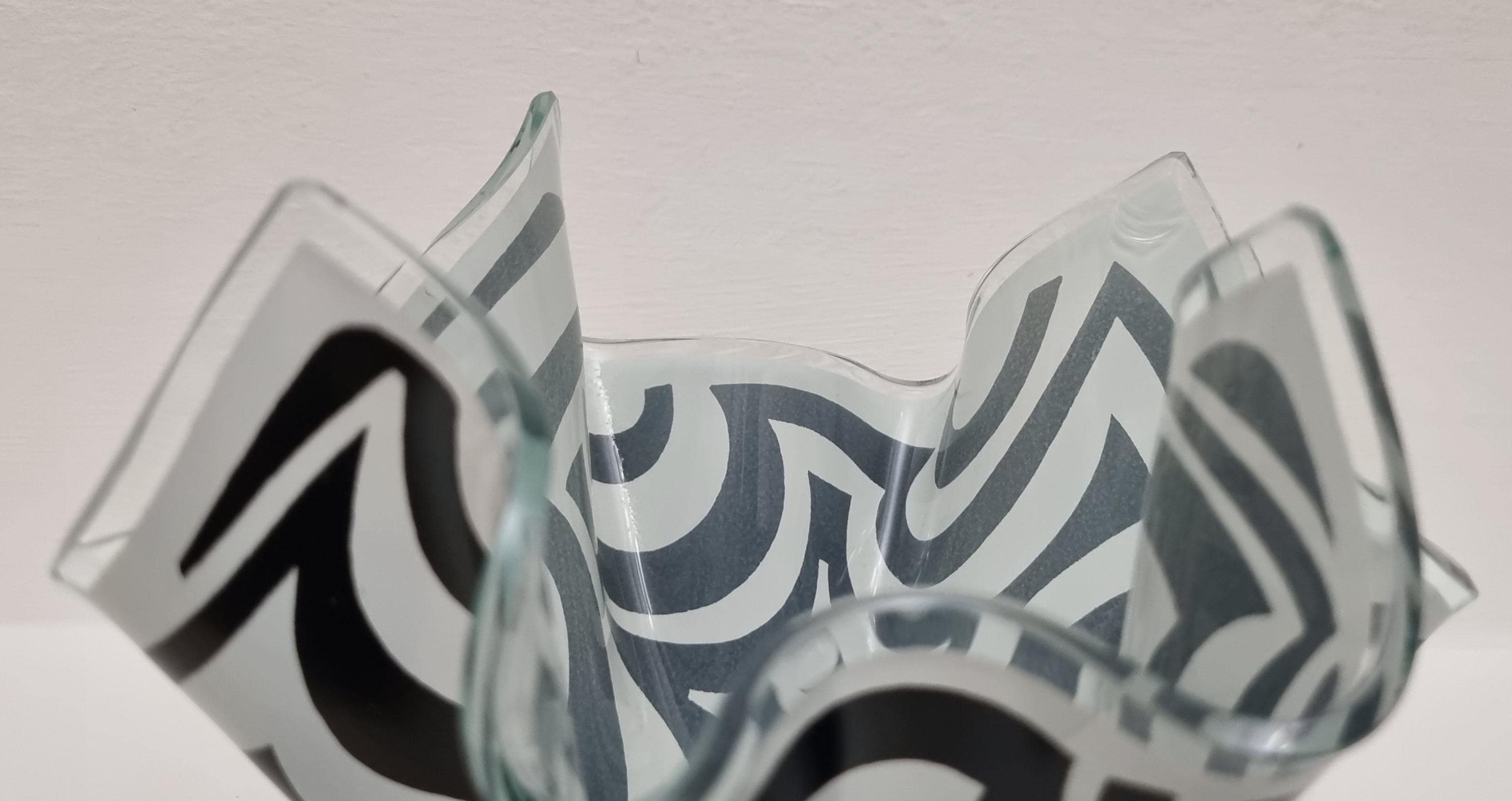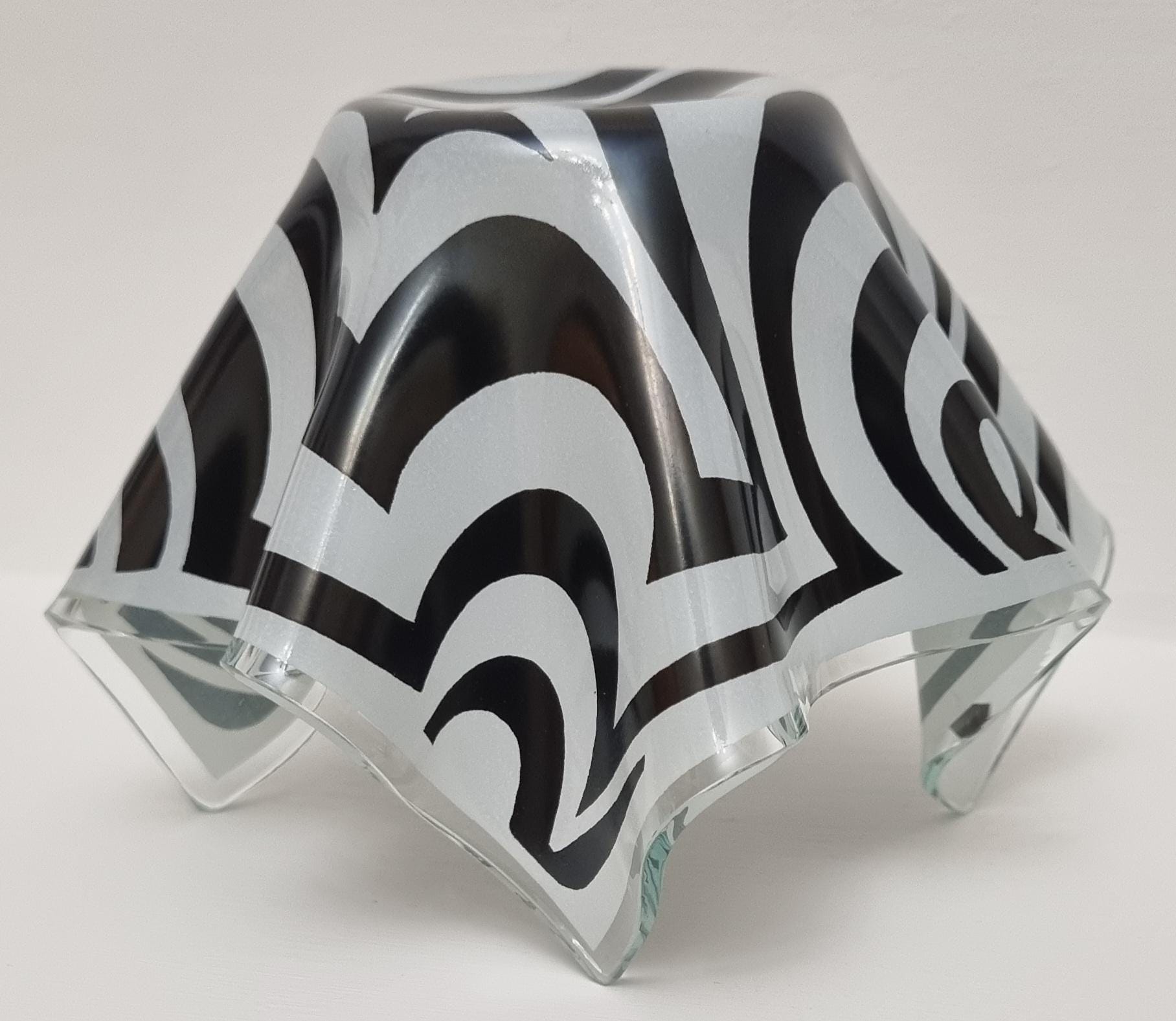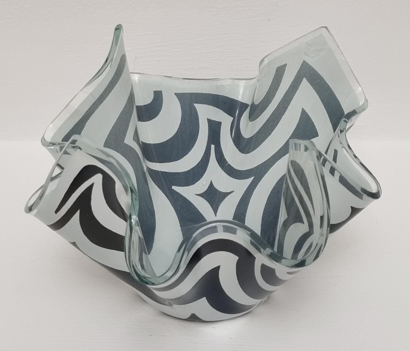 Mid-Century Modern handkerchief vase by the renowned British manufacturer Chance Glass. It features the highly collectible "Psychedelic" pattern, characterized by bold, swirling black and white Op-Art waves that create a striking optical effect.