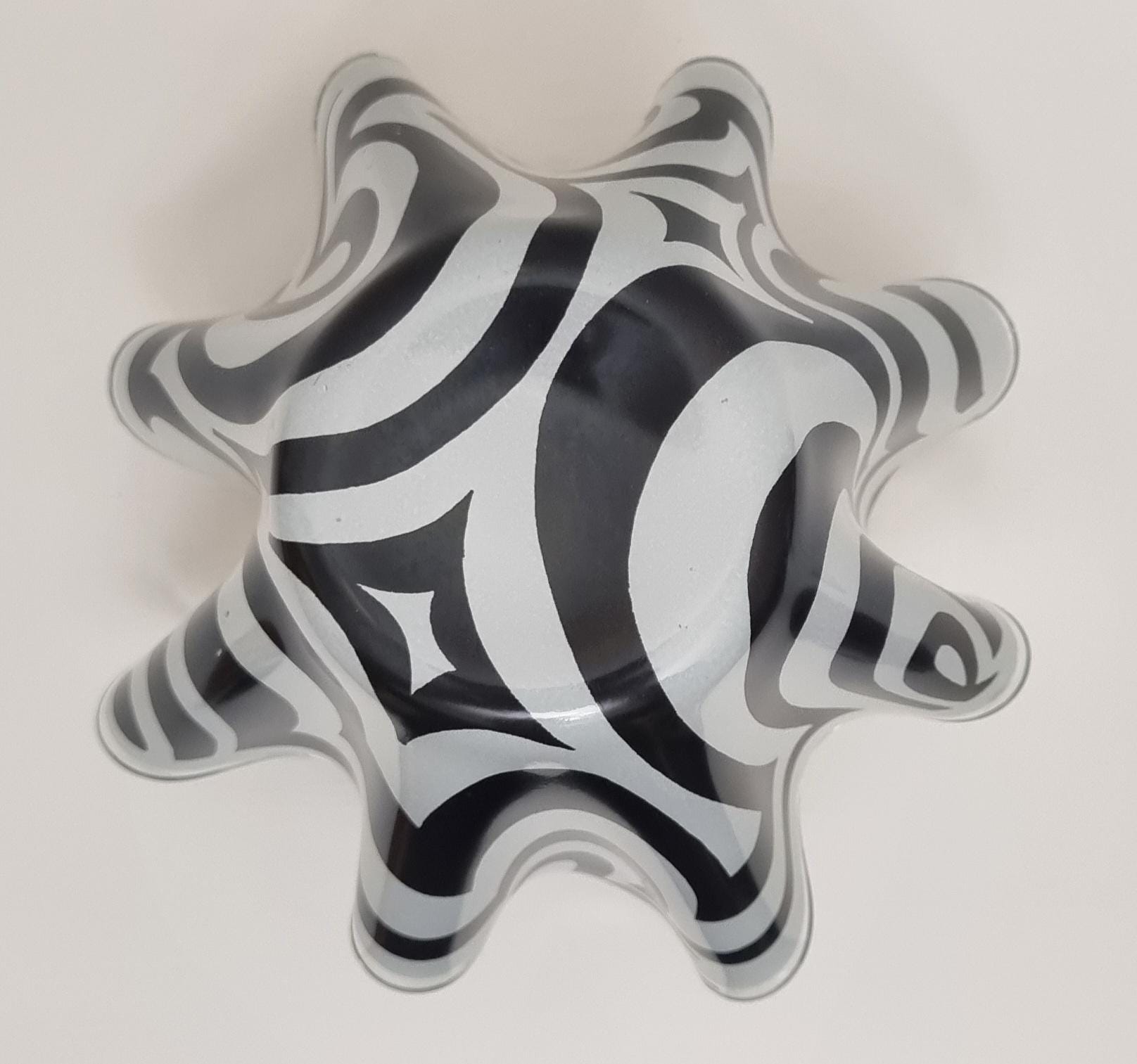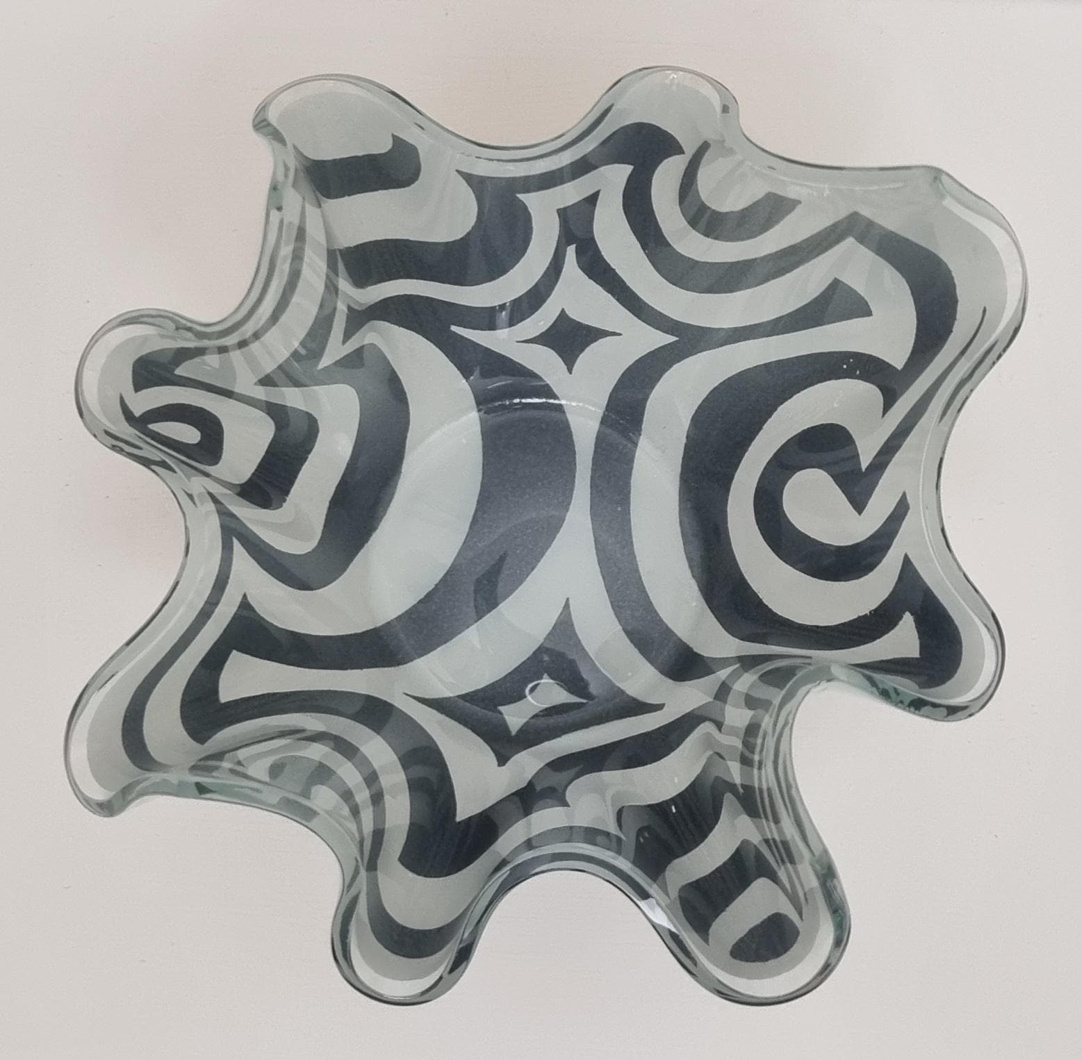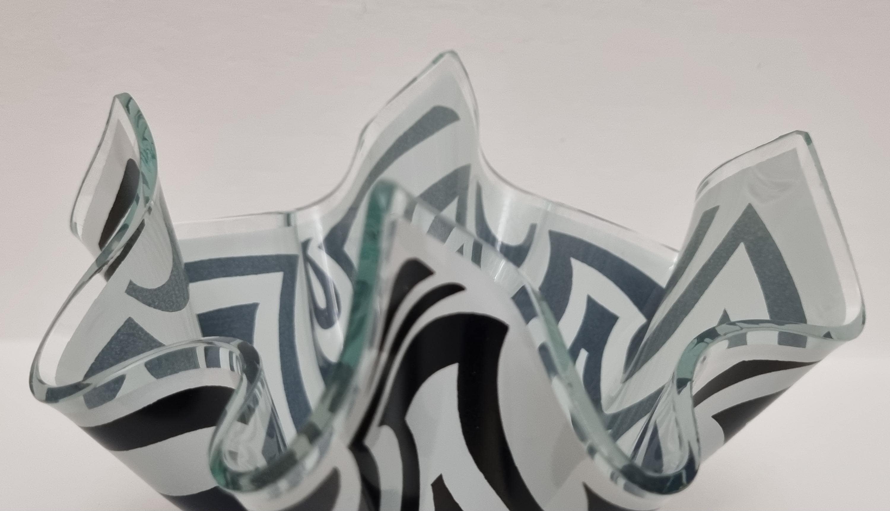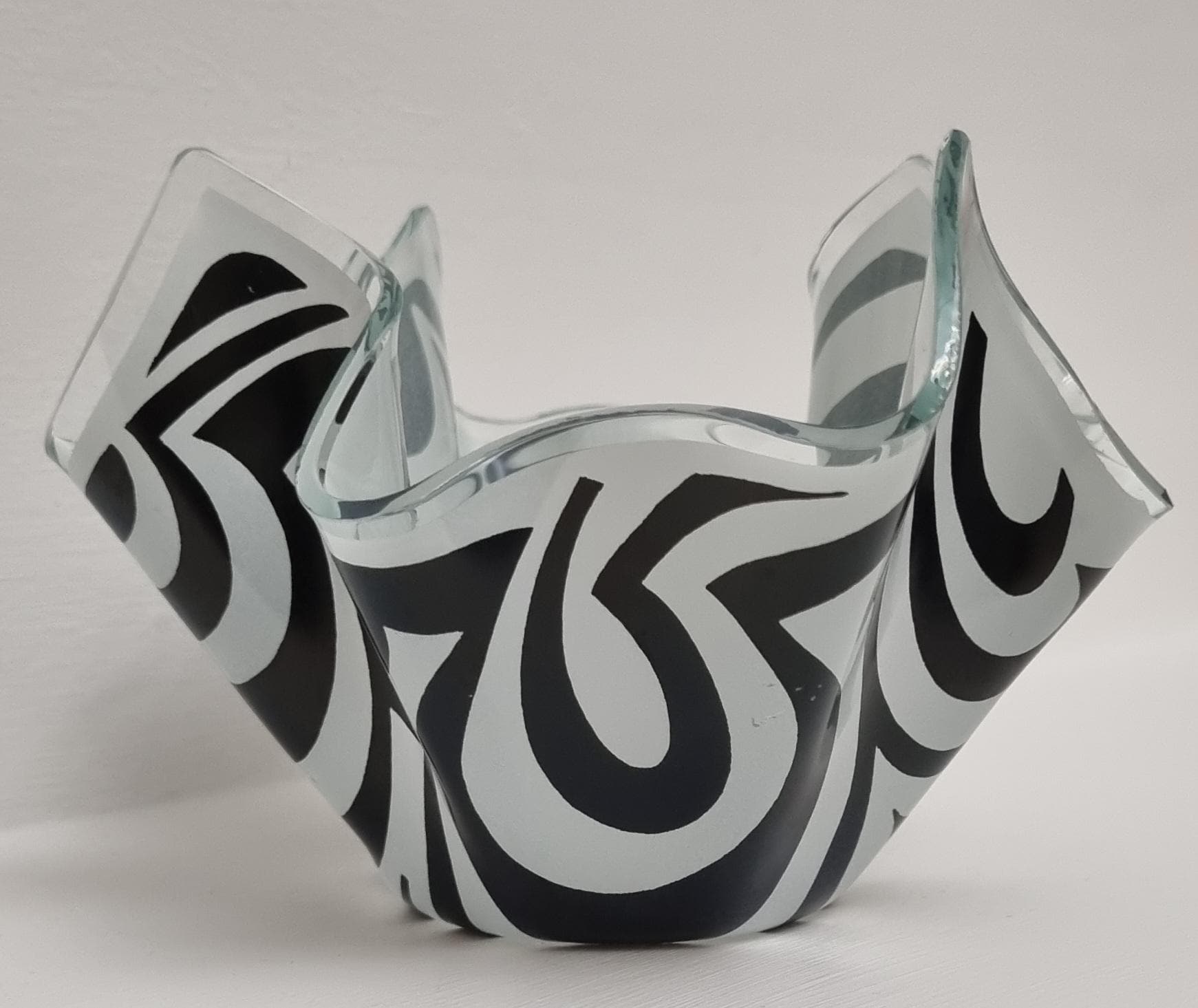 Mid-Century Modern handkerchief vase by the renowned British manufacturer Chance Glass. It features the highly collectible "Psychedelic" pattern, characterized by bold, swirling black and white Op-Art waves that create a striking optical effect.