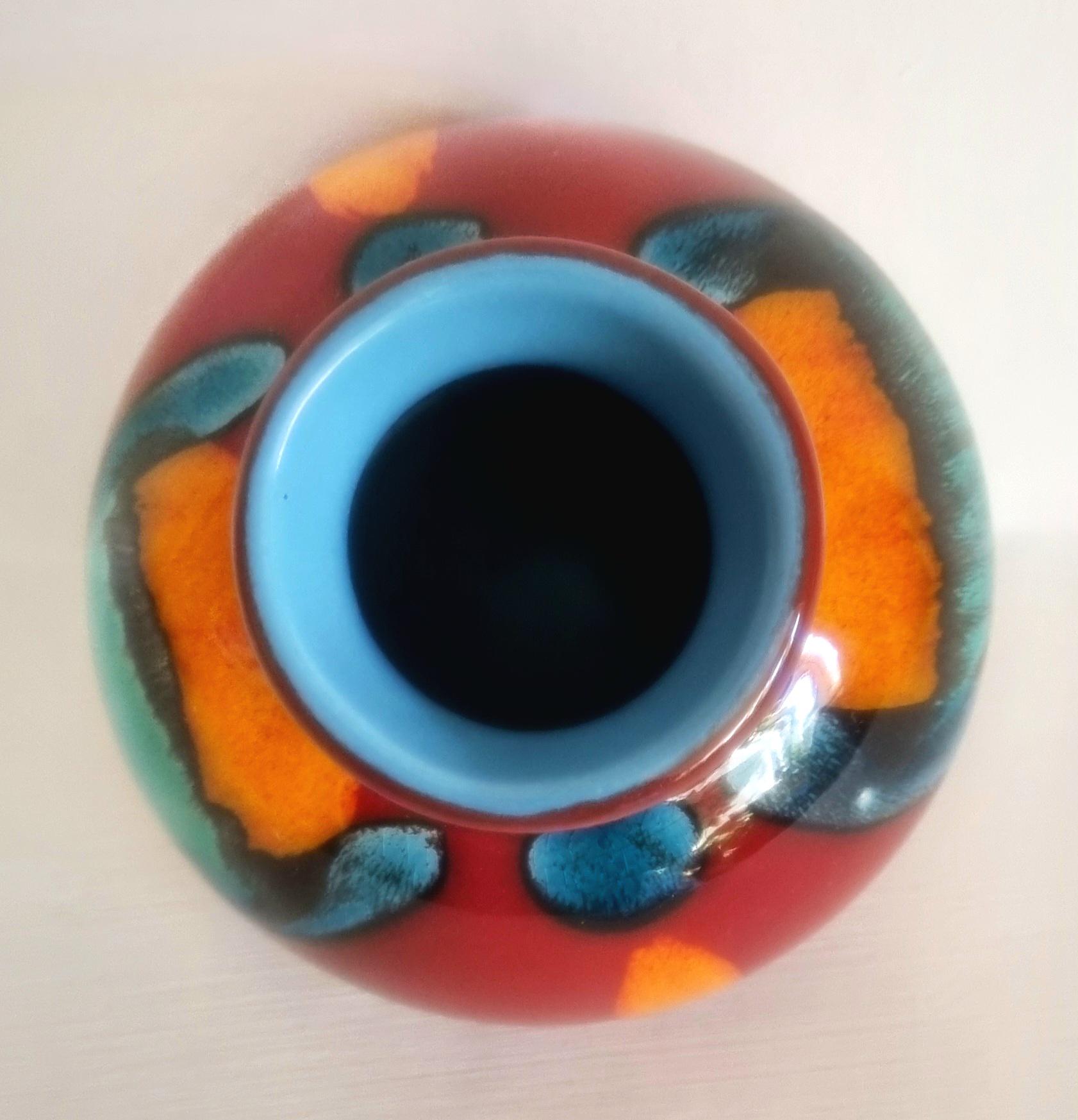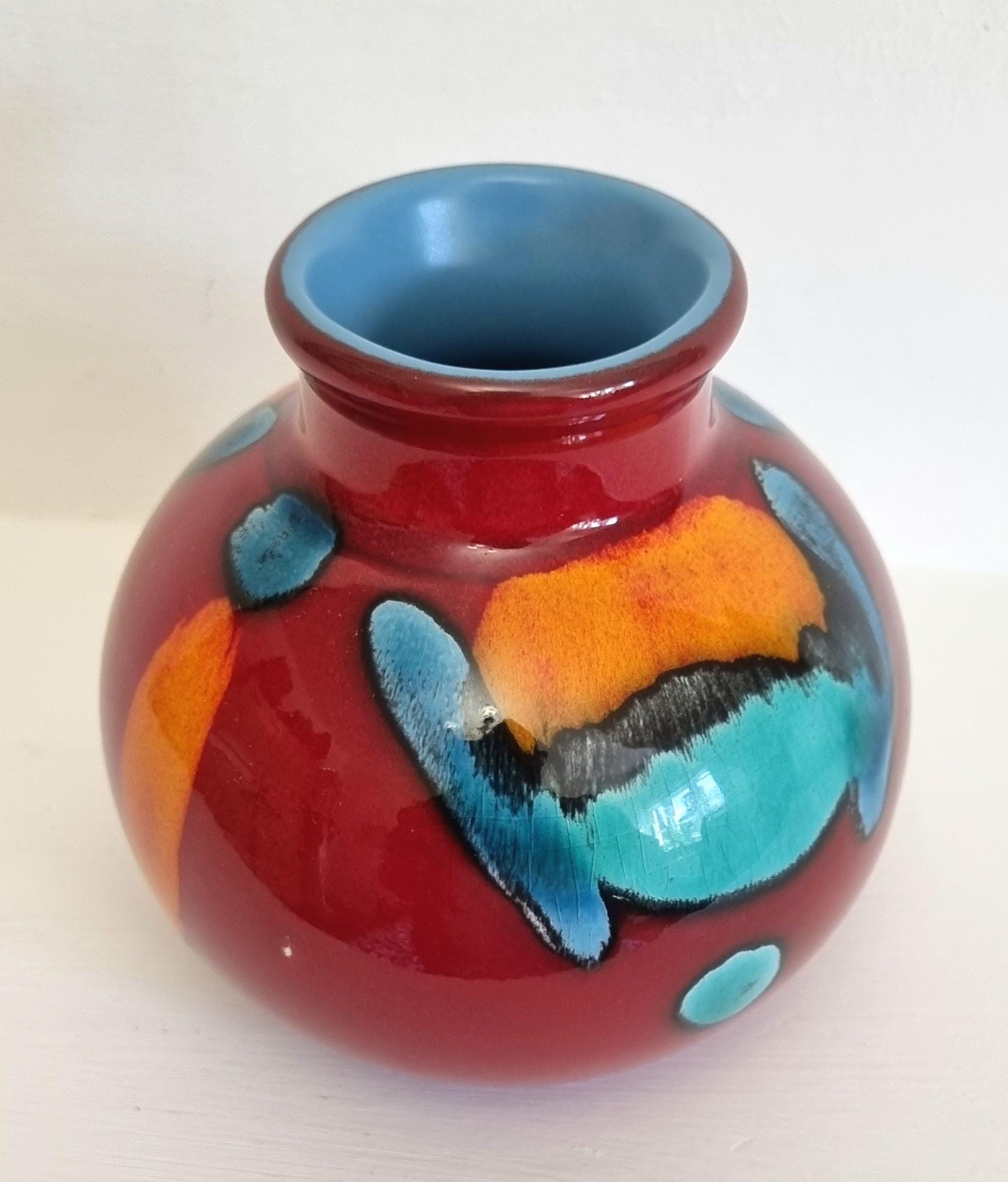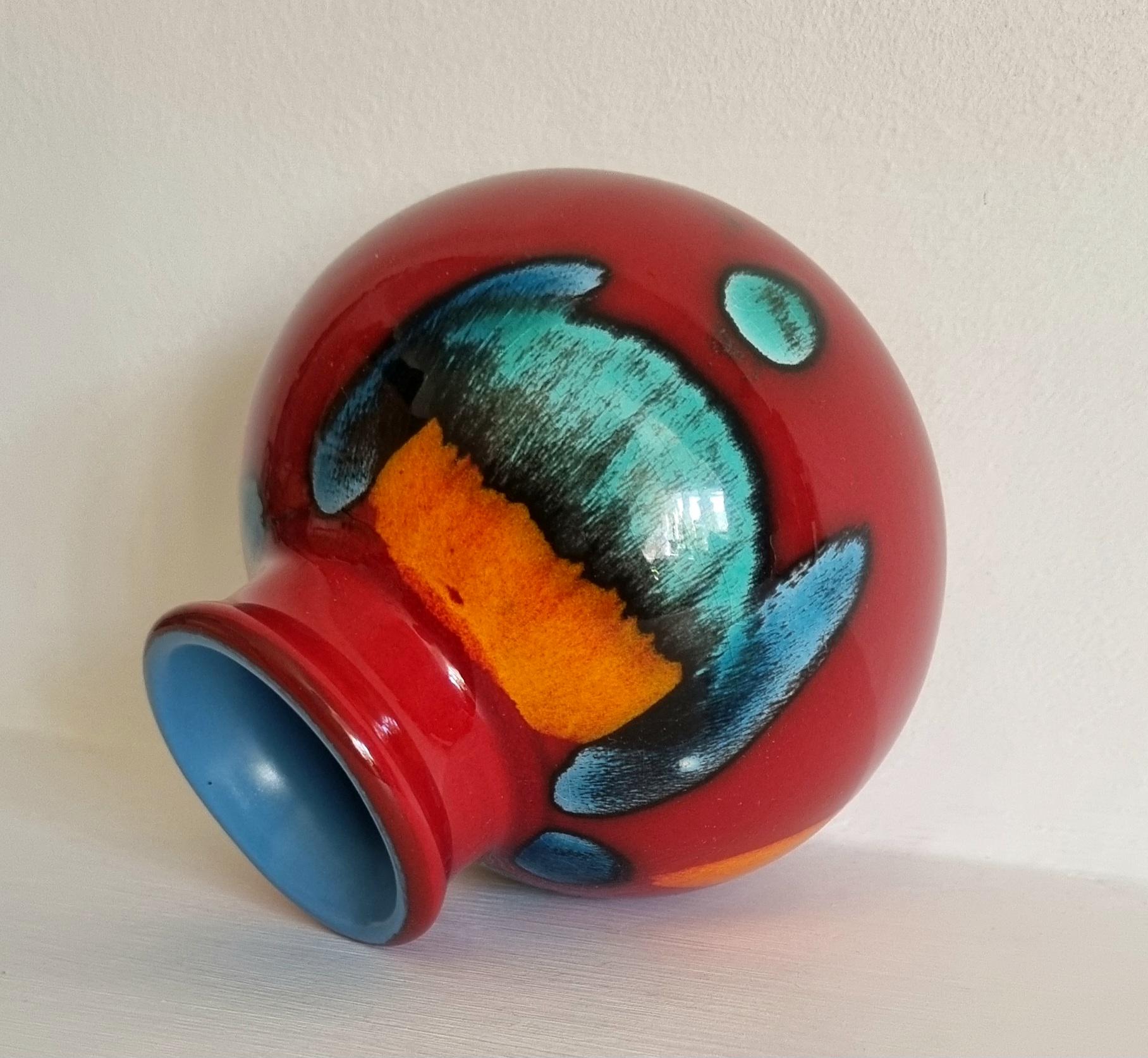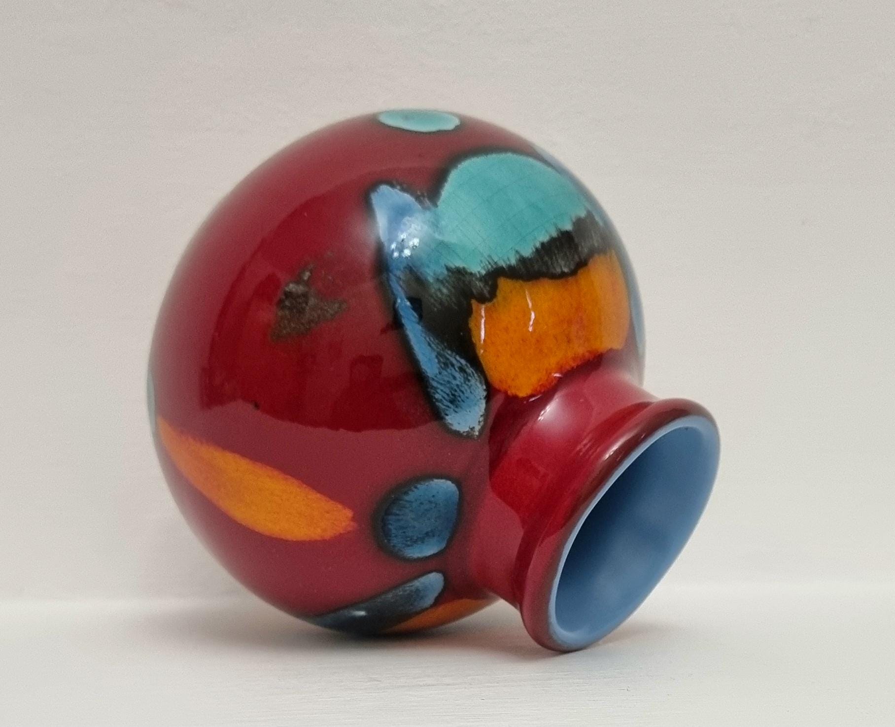 Striking Poole Pottery bulbous vase featuring the bold "Odyssey" or "Volcano" Living Glaze design. Hand-painted in Stoke-on-Trent, the vase showcases a fiery palette of lava red and sunburst orange, contrasted by cool turquoise and cerulean blue "splashes."
