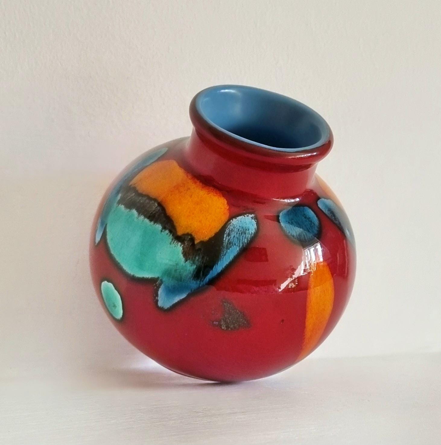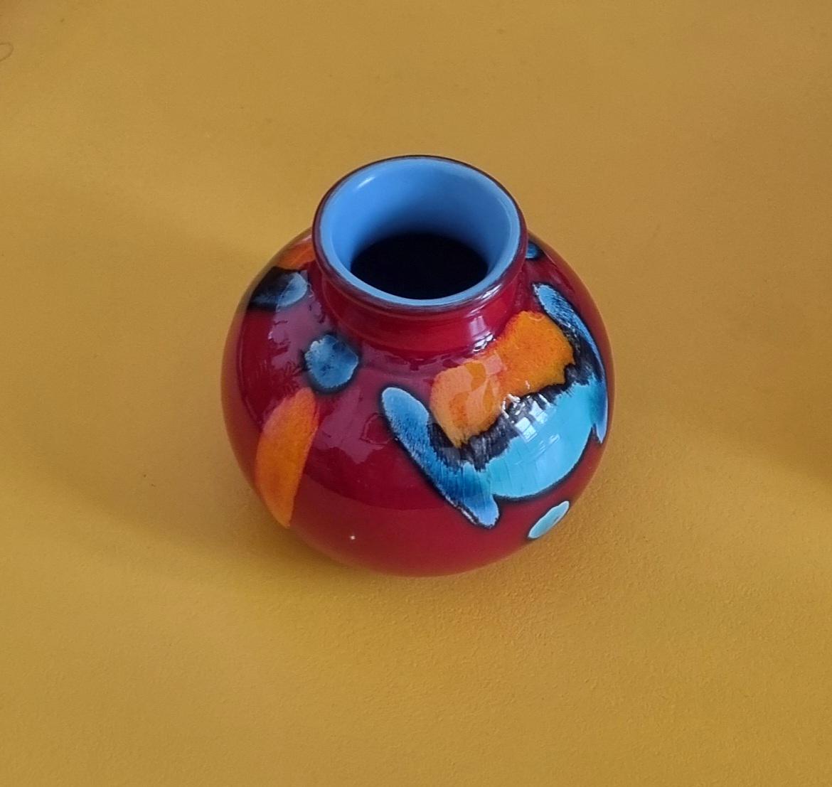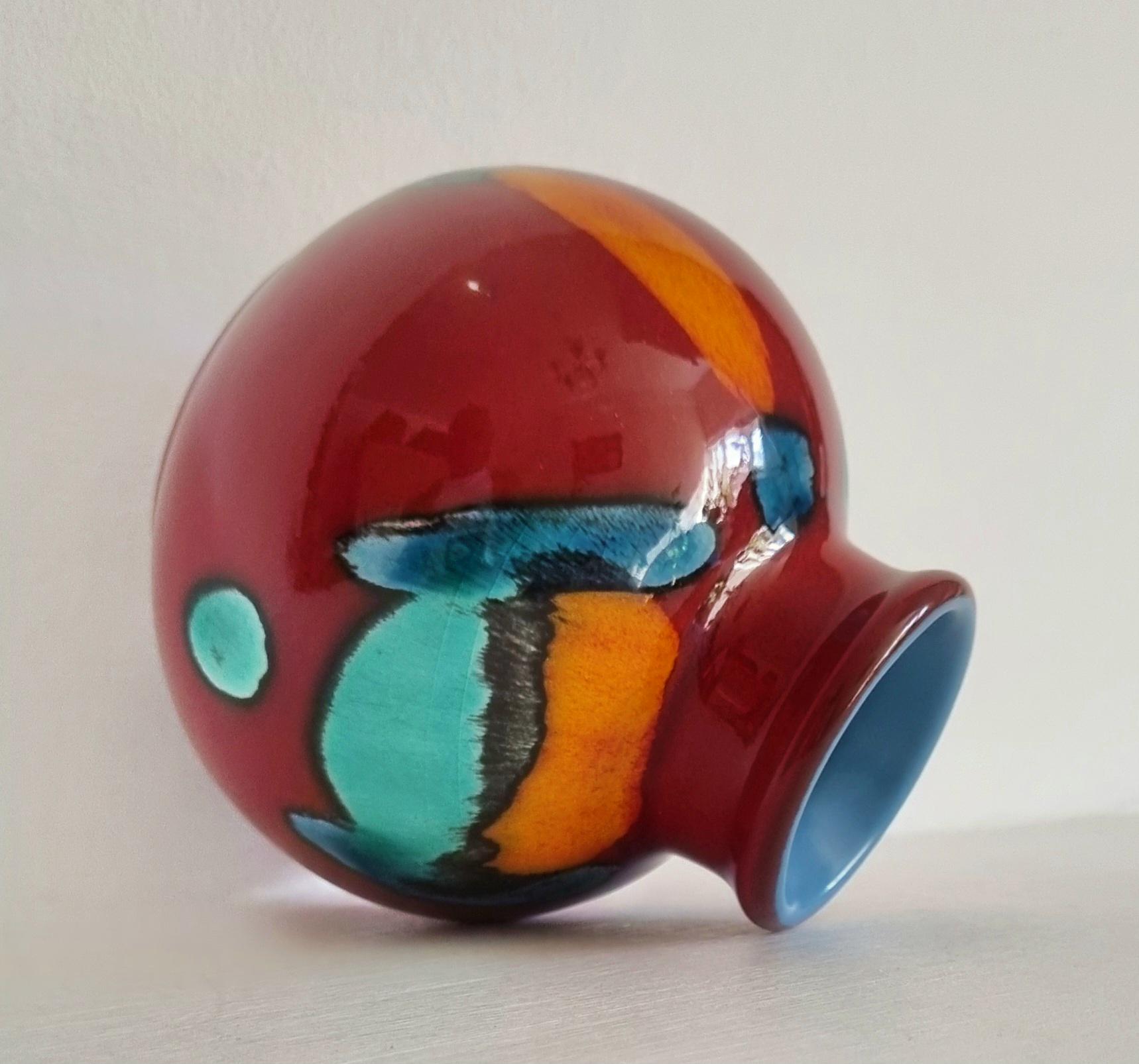 Striking Poole Pottery bulbous vase featuring the bold "Odyssey" or "Volcano" Living Glaze design. Hand-painted in Stoke-on-Trent, the vase showcases a fiery palette of lava red and sunburst orange, contrasted by cool turquoise and cerulean blue "splashes."