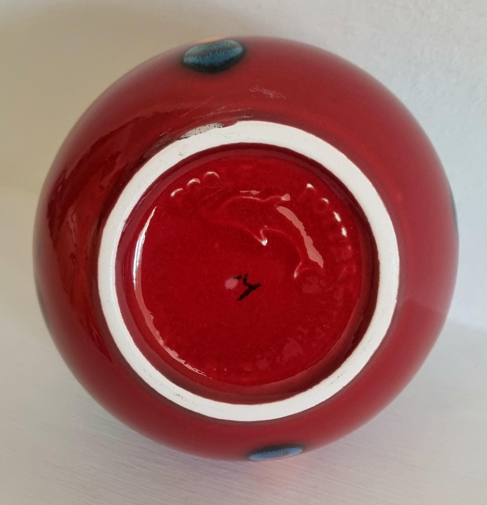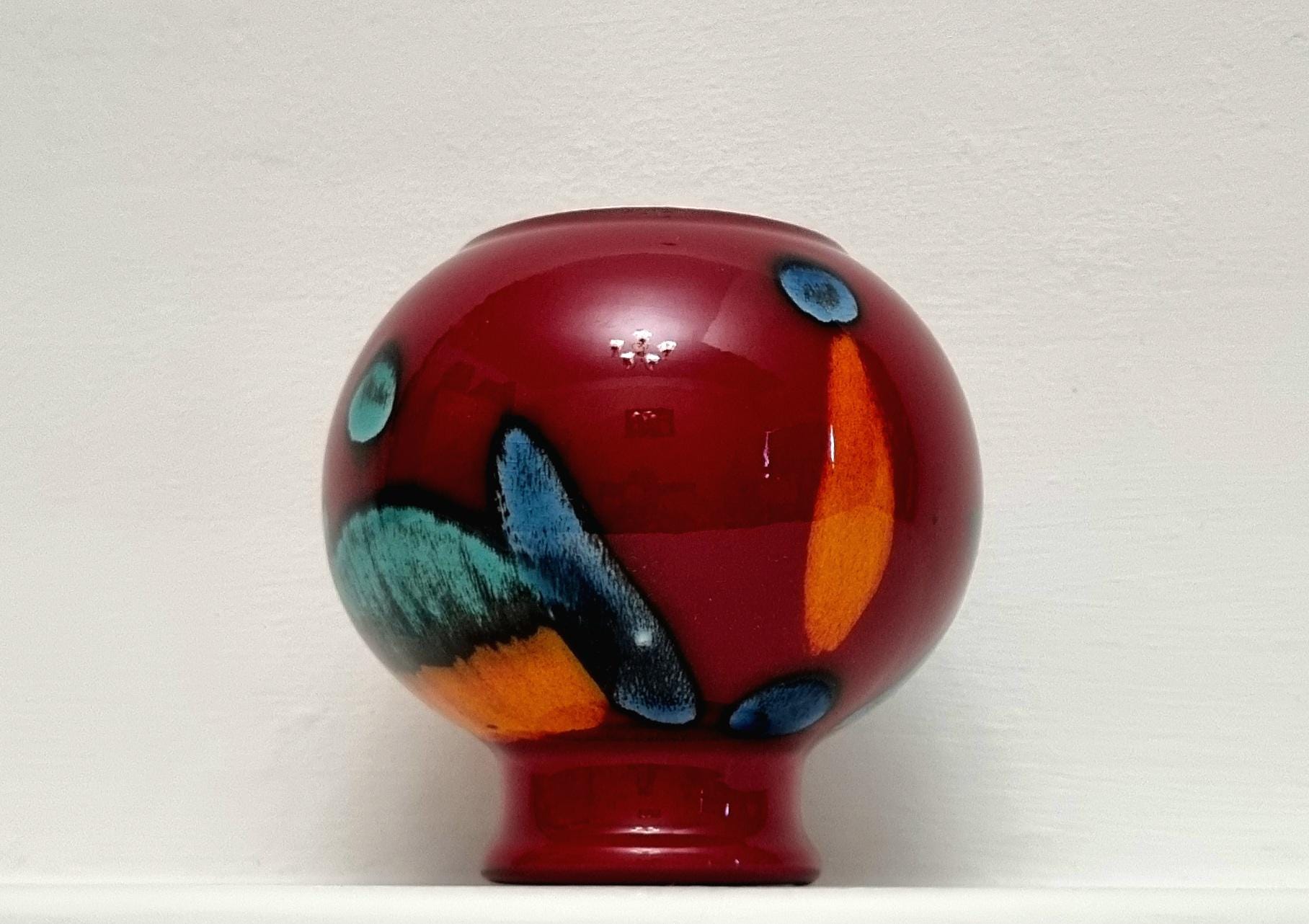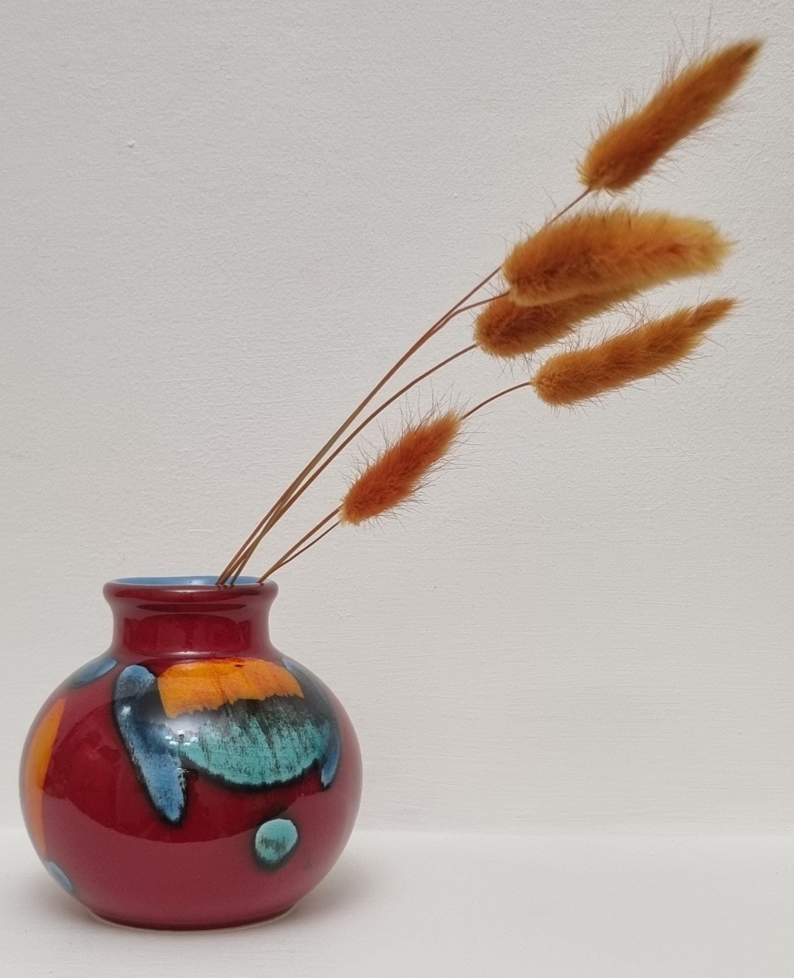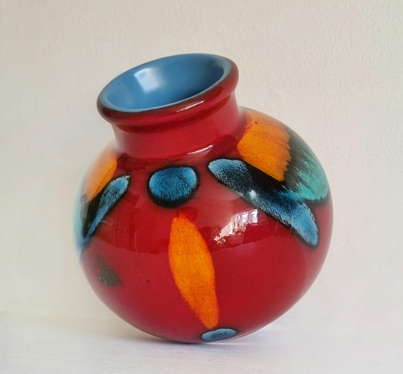 Striking Poole Pottery bulbous vase featuring the bold "Odyssey" or "Volcano" Living Glaze design. Hand-painted in Stoke-on-Trent, the vase showcases a fiery palette of lava red and sunburst orange, contrasted by cool turquoise and cerulean blue "splashes."