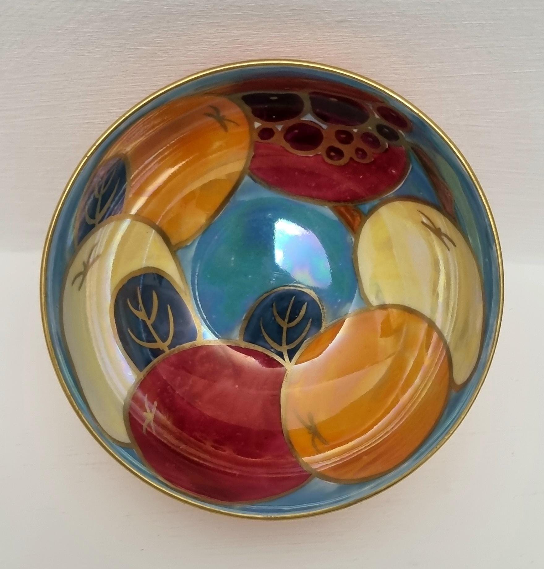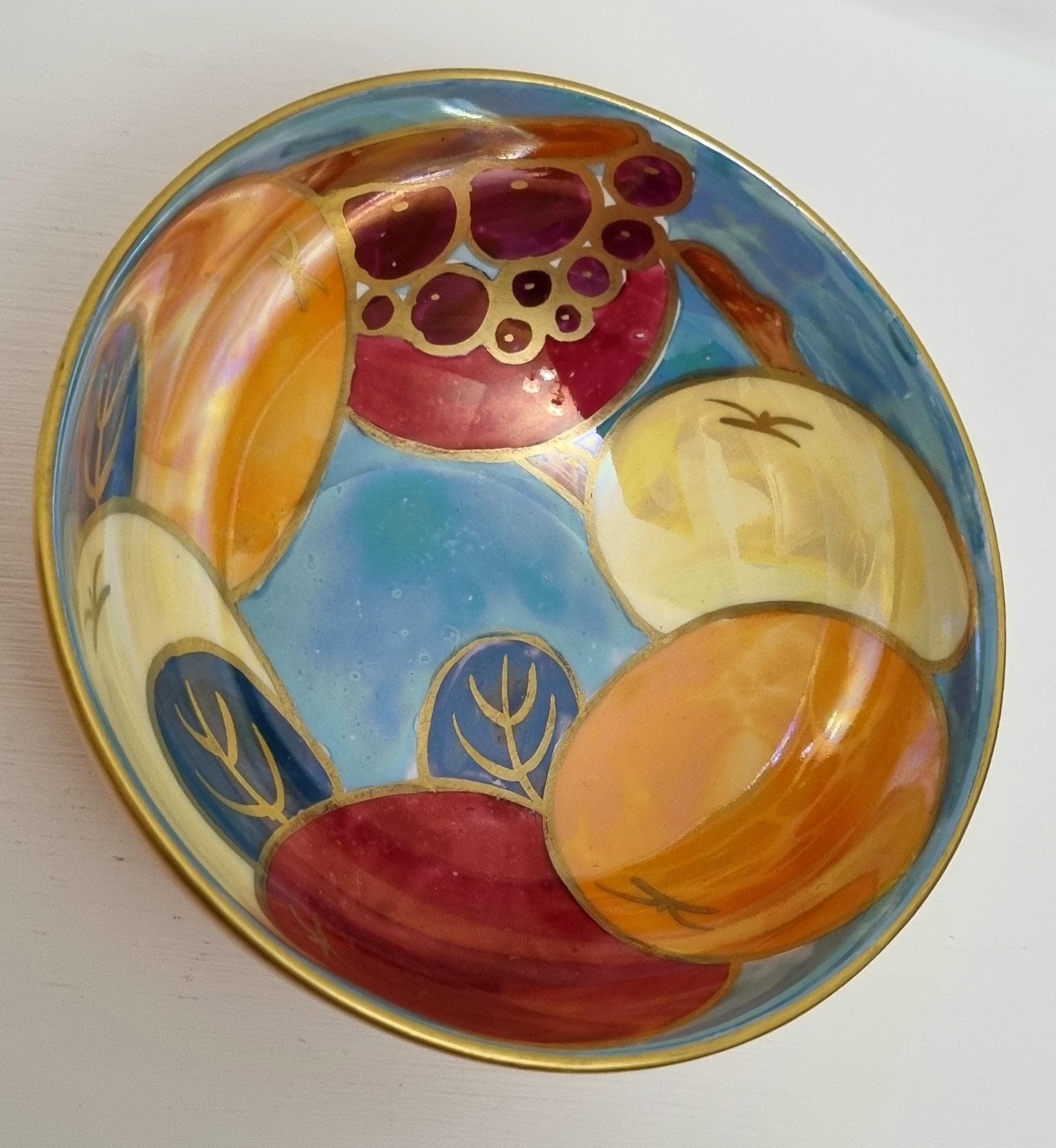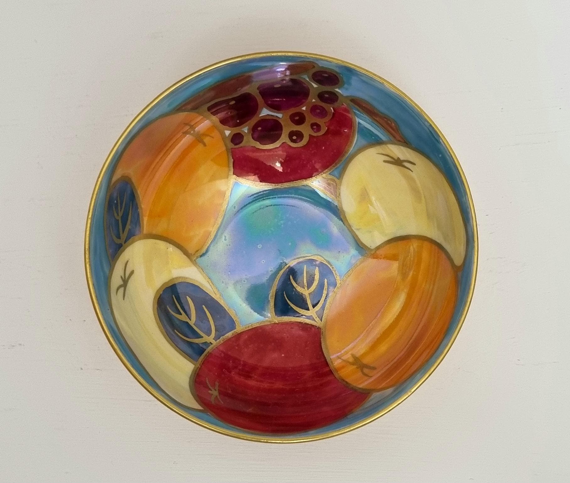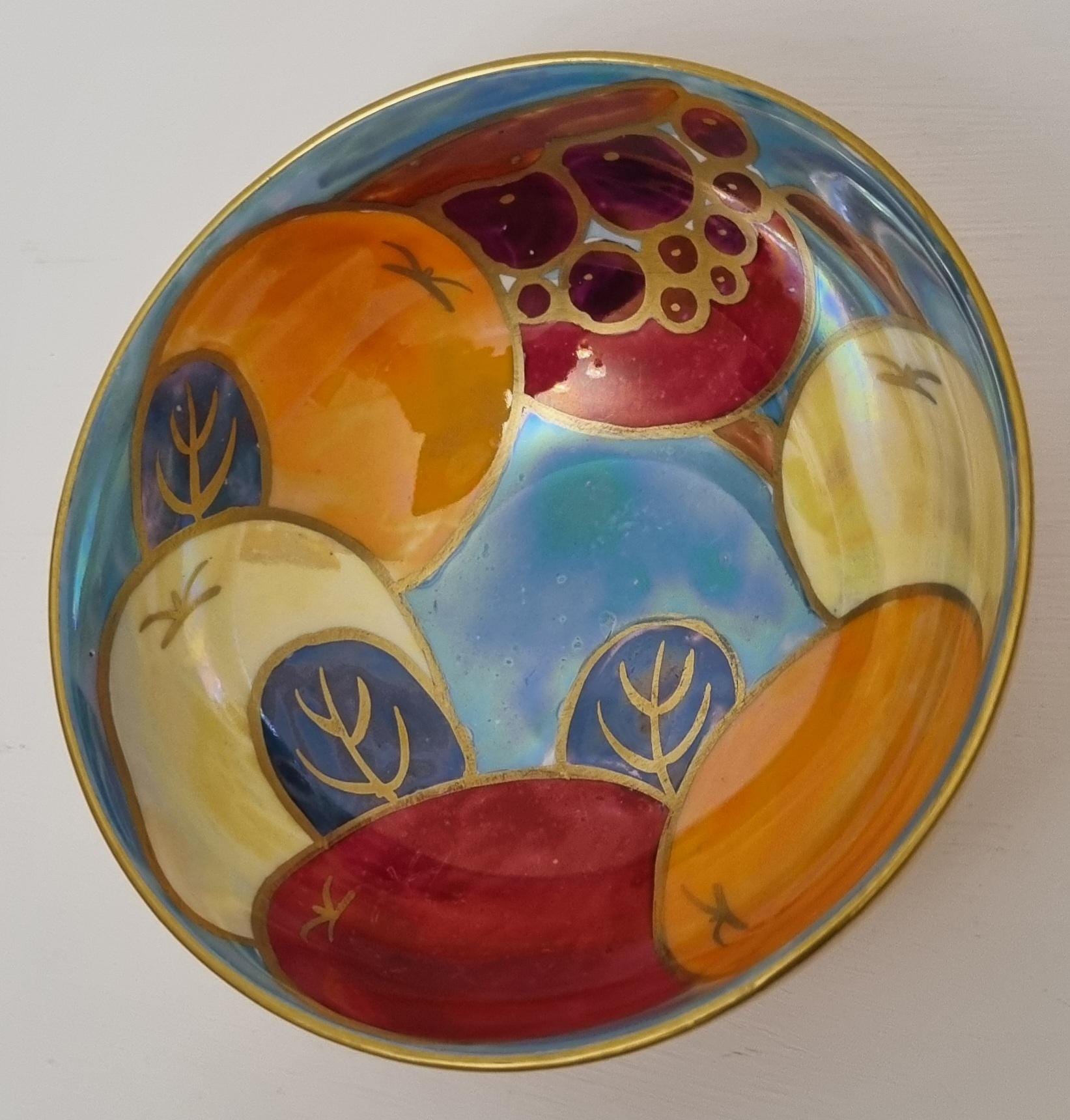 A beautiful Art Deco Crown Ducal lustreware bowl, featuring a rich, hand-painted fruit motif. The interior is decorated with bold stylized apples and grapes in shades of crimson, amber, and golden yellow, set against a shimmering, iridescent pearlescent blue background.