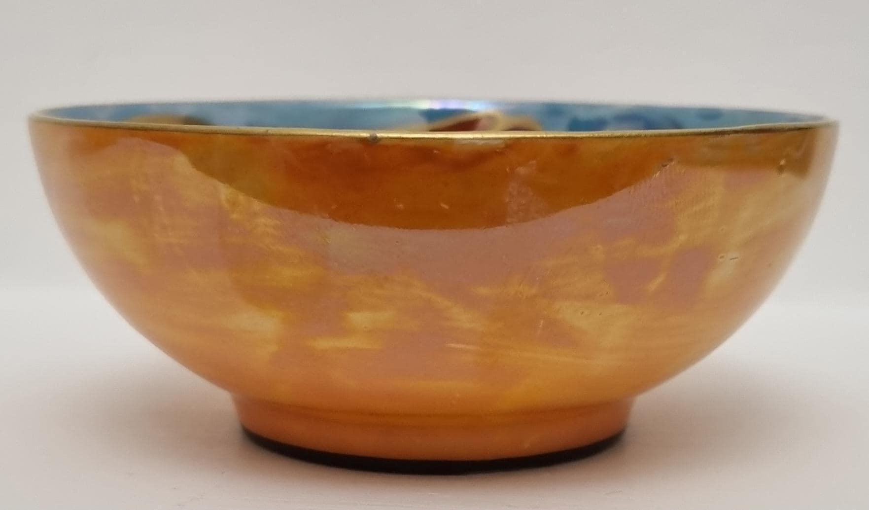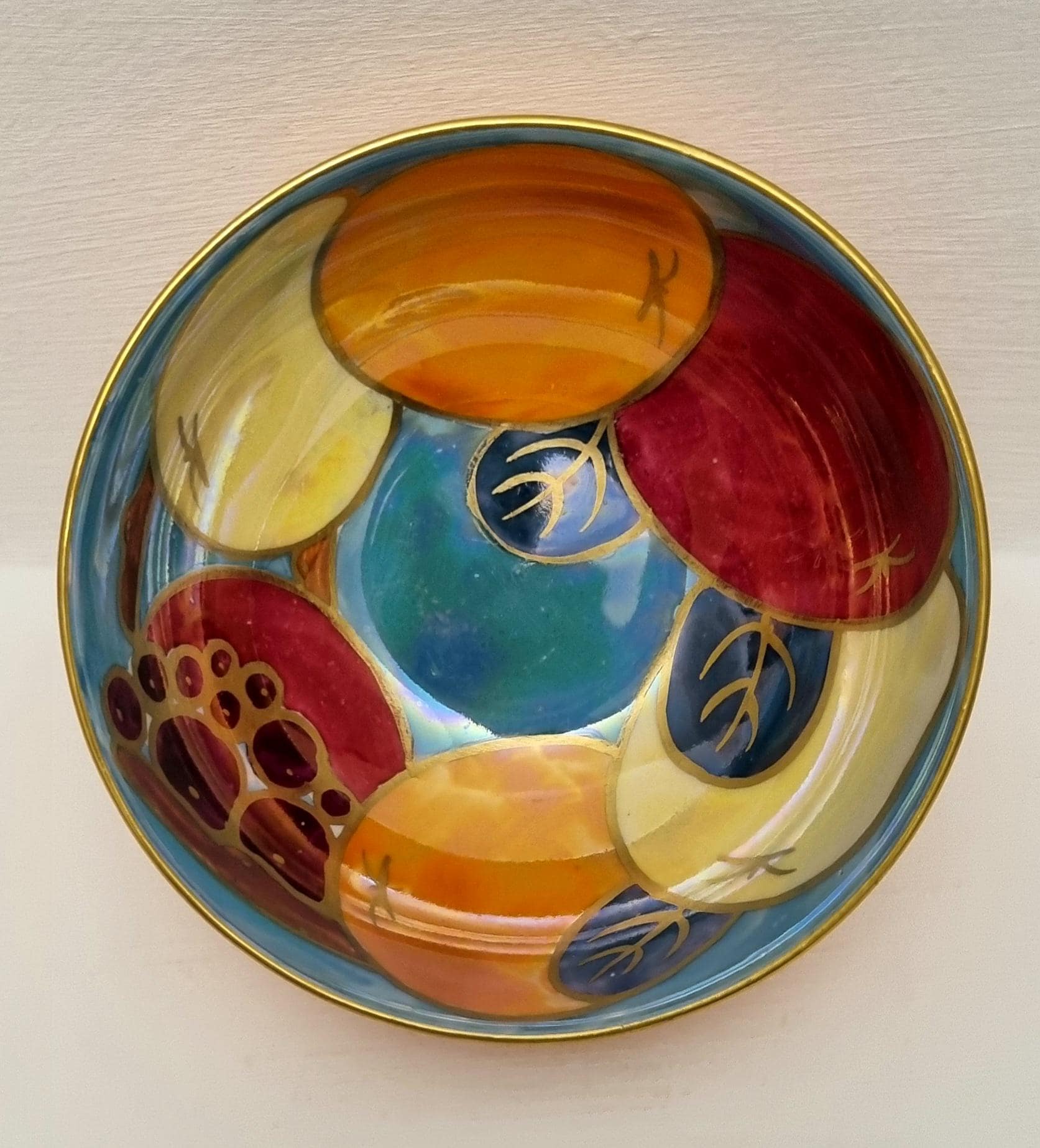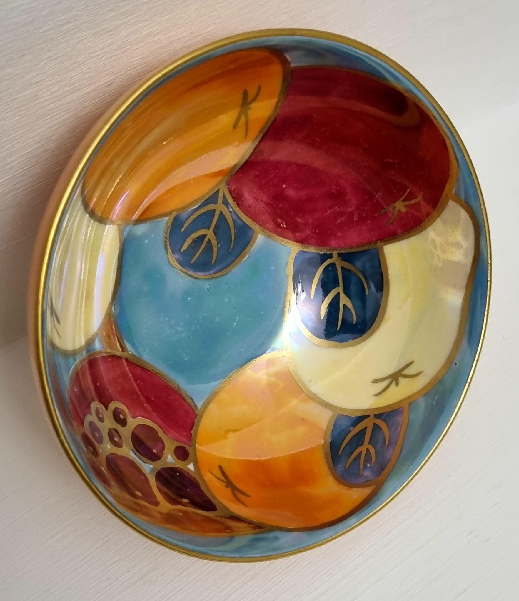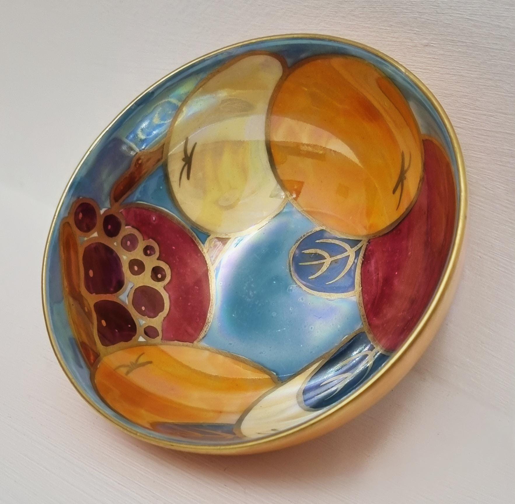 A beautiful Art Deco Crown Ducal lustreware bowl, featuring a rich, hand-painted fruit motif. The interior is decorated with bold stylized apples and grapes in shades of crimson, amber, and golden yellow, set against a shimmering, iridescent pearlescent blue background.