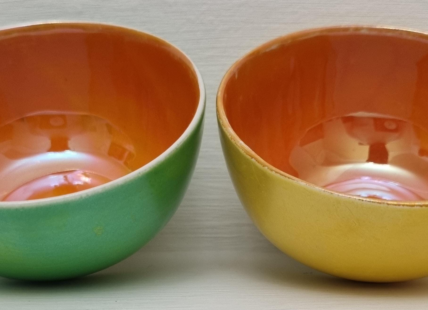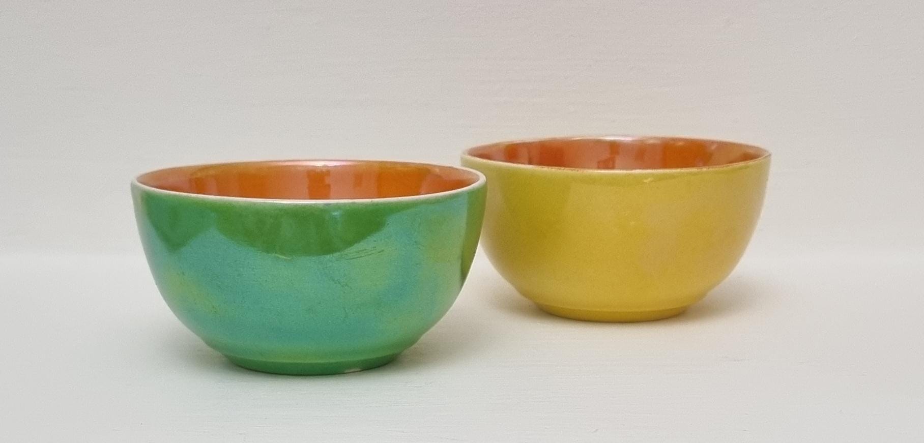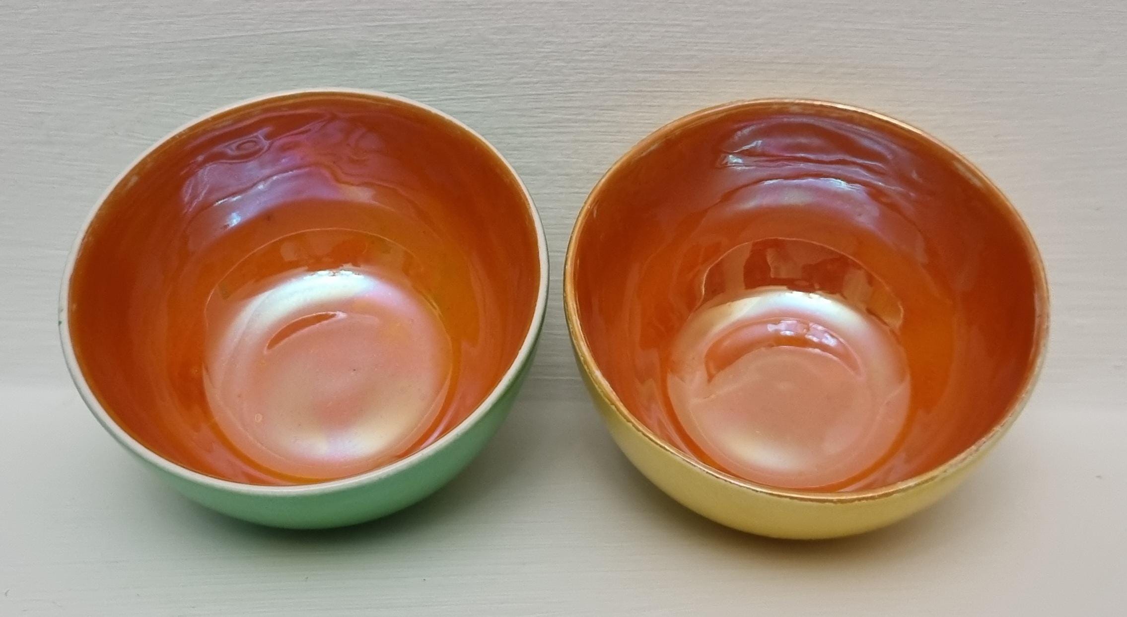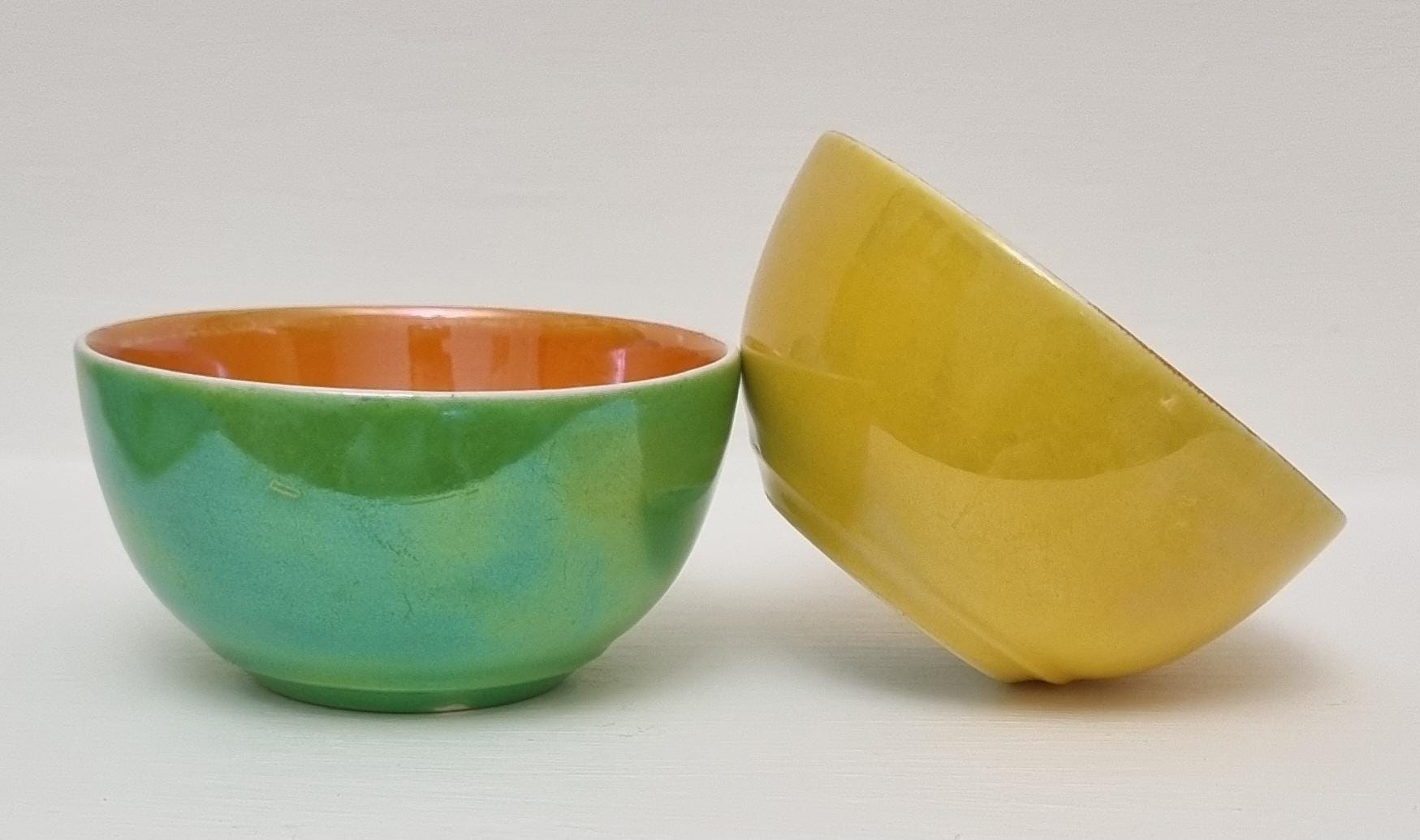 This vibrant pair of 2 small vintage W&R (Wiltshaw & Robinson) Carlton Ware lustreware bowls features the iconic high-gloss, iridescent finish that made the Stoke-on-Trent pottery famous. The set includes one bowl in a striking emerald-to-seafoam green and another in a warm canary yellow, both accented by a glowing tangerine orange interior.