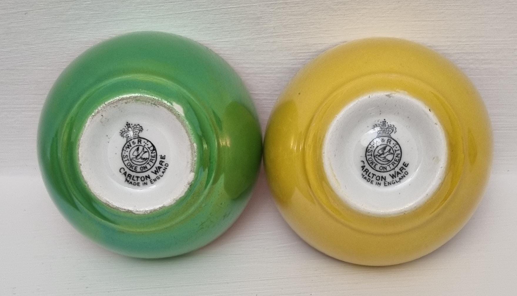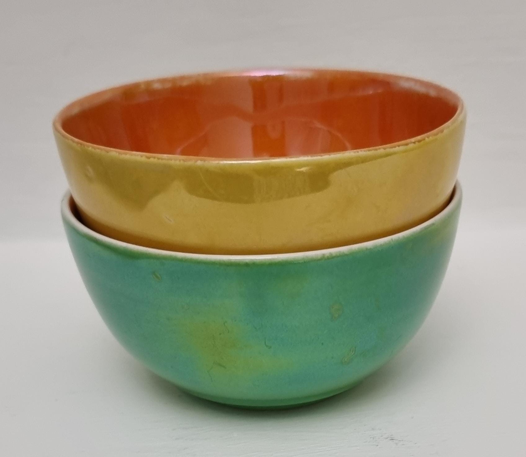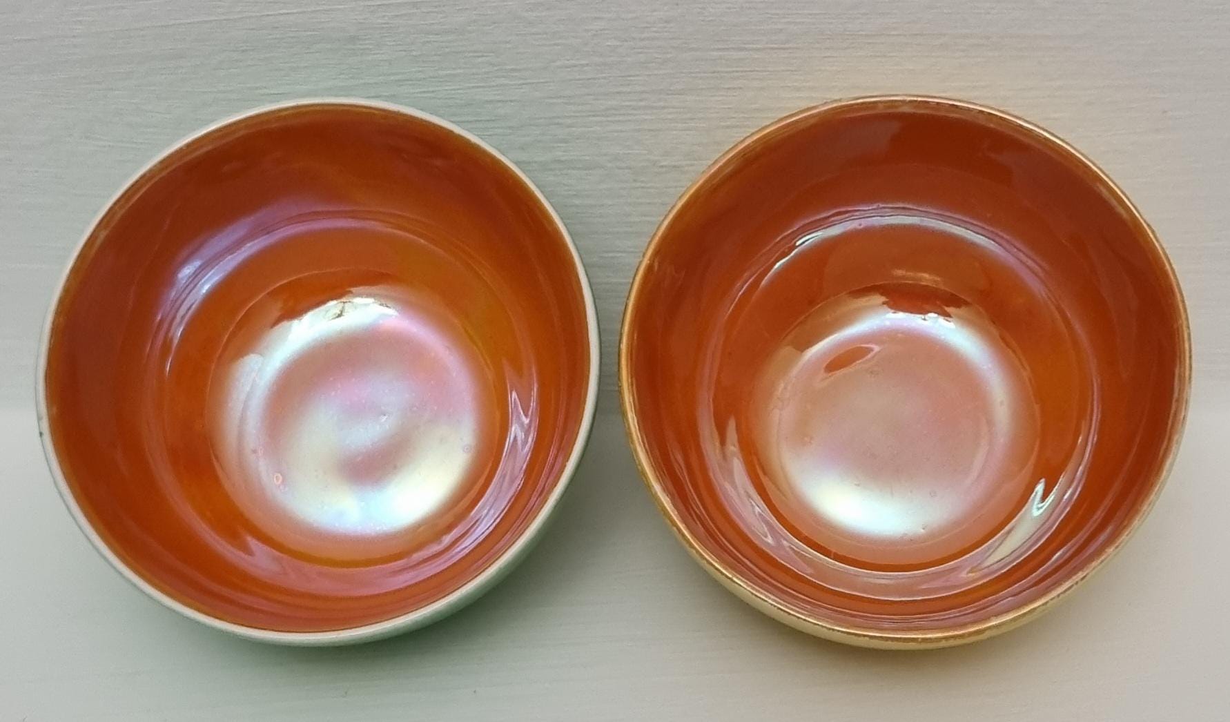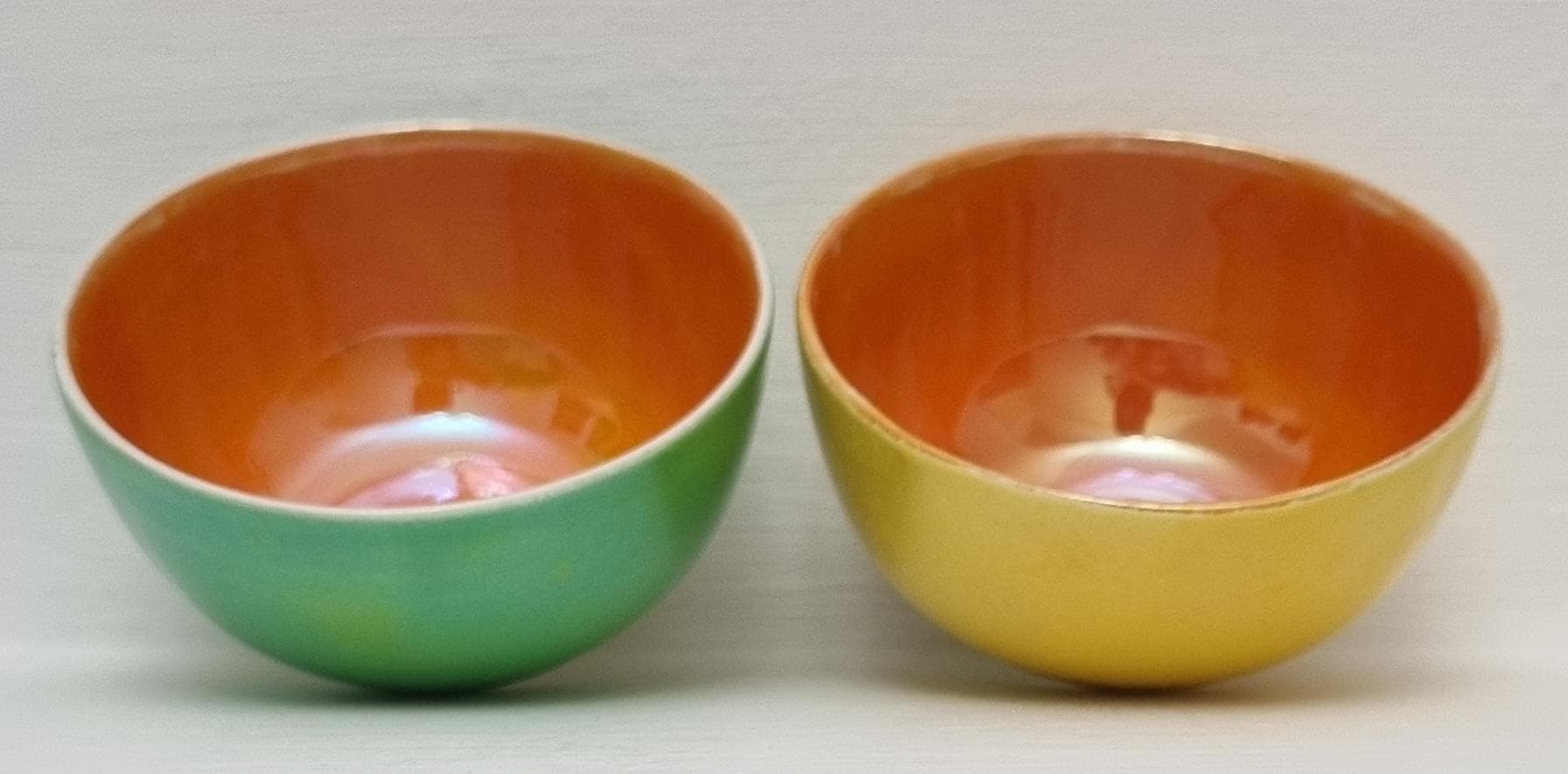 This vibrant pair of 2 small vintage W&R (Wiltshaw & Robinson) Carlton Ware lustreware bowls features the iconic high-gloss, iridescent finish that made the Stoke-on-Trent pottery famous. The set includes one bowl in a striking emerald-to-seafoam green and another in a warm canary yellow, both accented by a glowing tangerine orange interior.