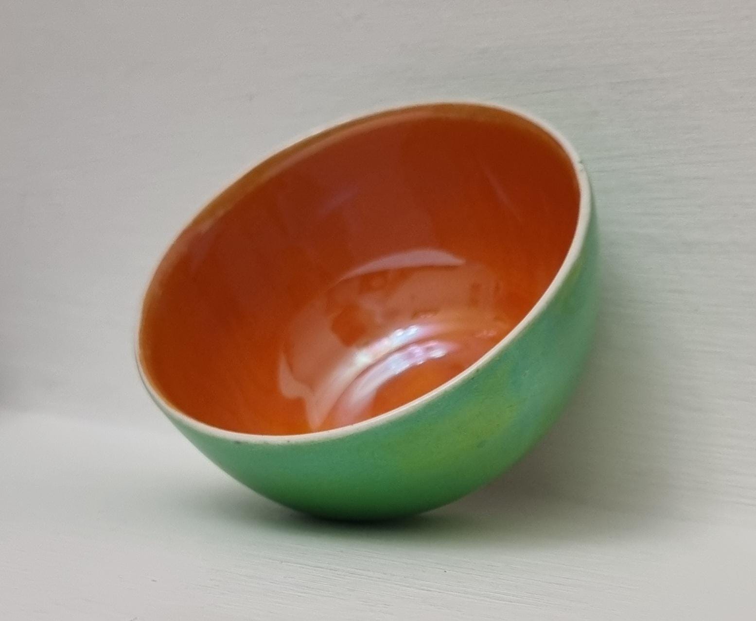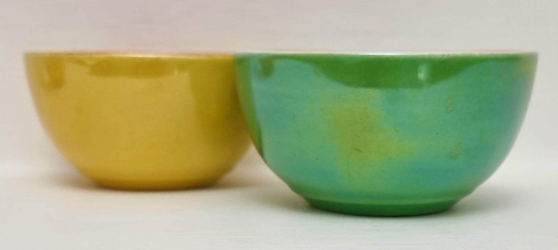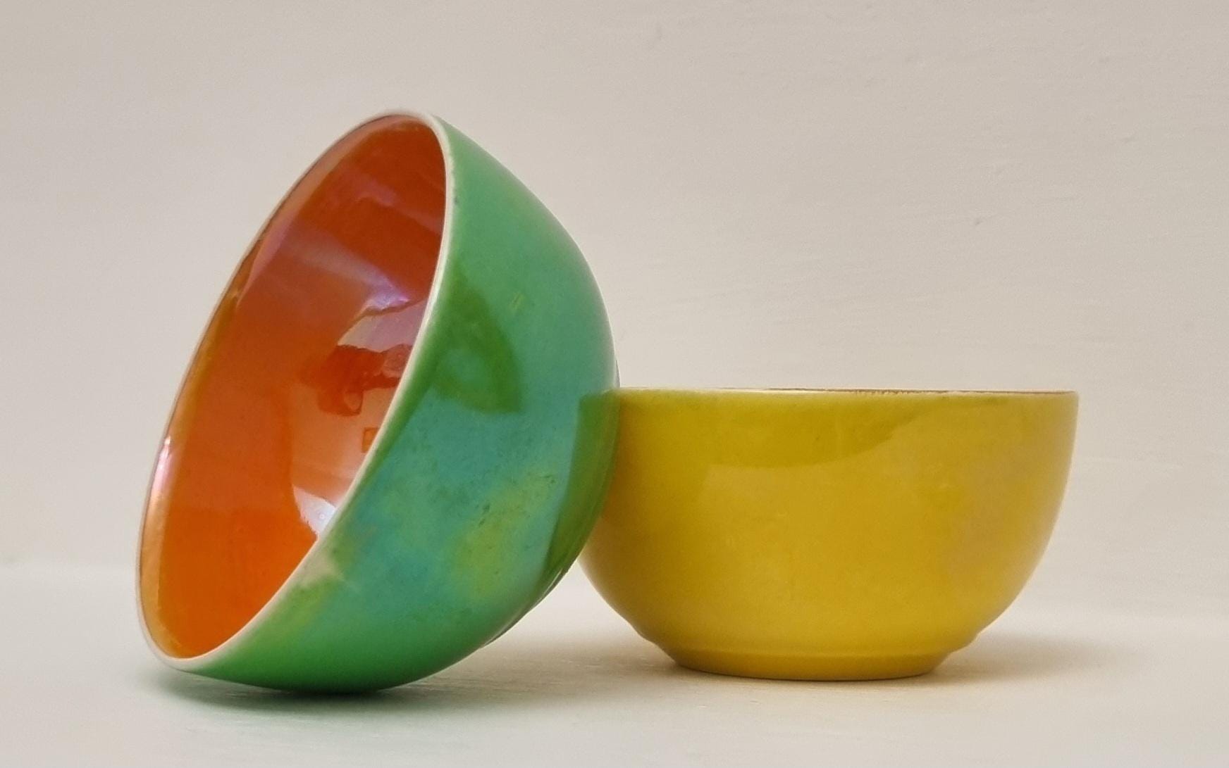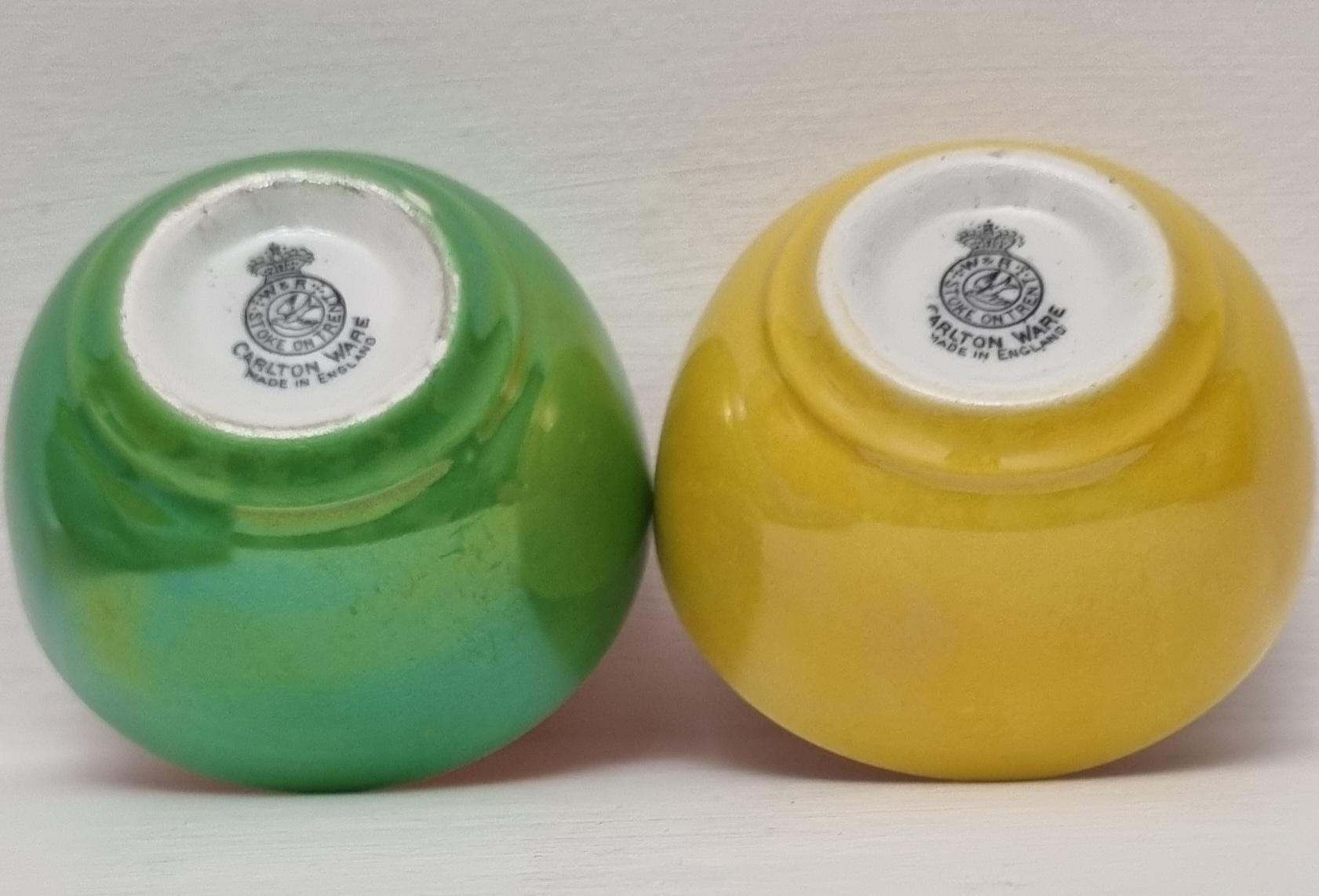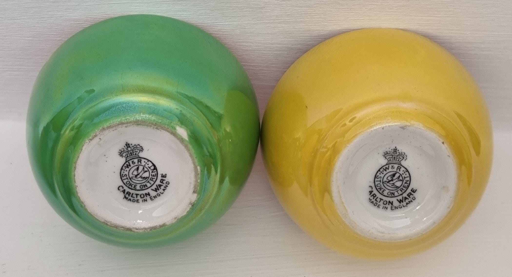 This vibrant pair of 2 small vintage W&R (Wiltshaw & Robinson) Carlton Ware lustreware bowls features the iconic high-gloss, iridescent finish that made the Stoke-on-Trent pottery famous. The set includes one bowl in a striking emerald-to-seafoam green and another in a warm canary yellow, both accented by a glowing tangerine orange interior.