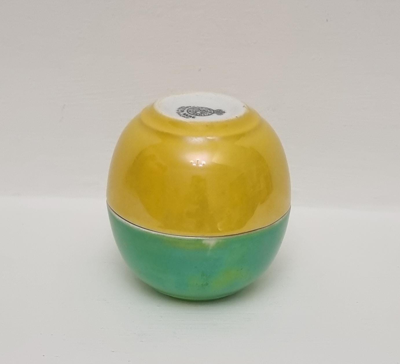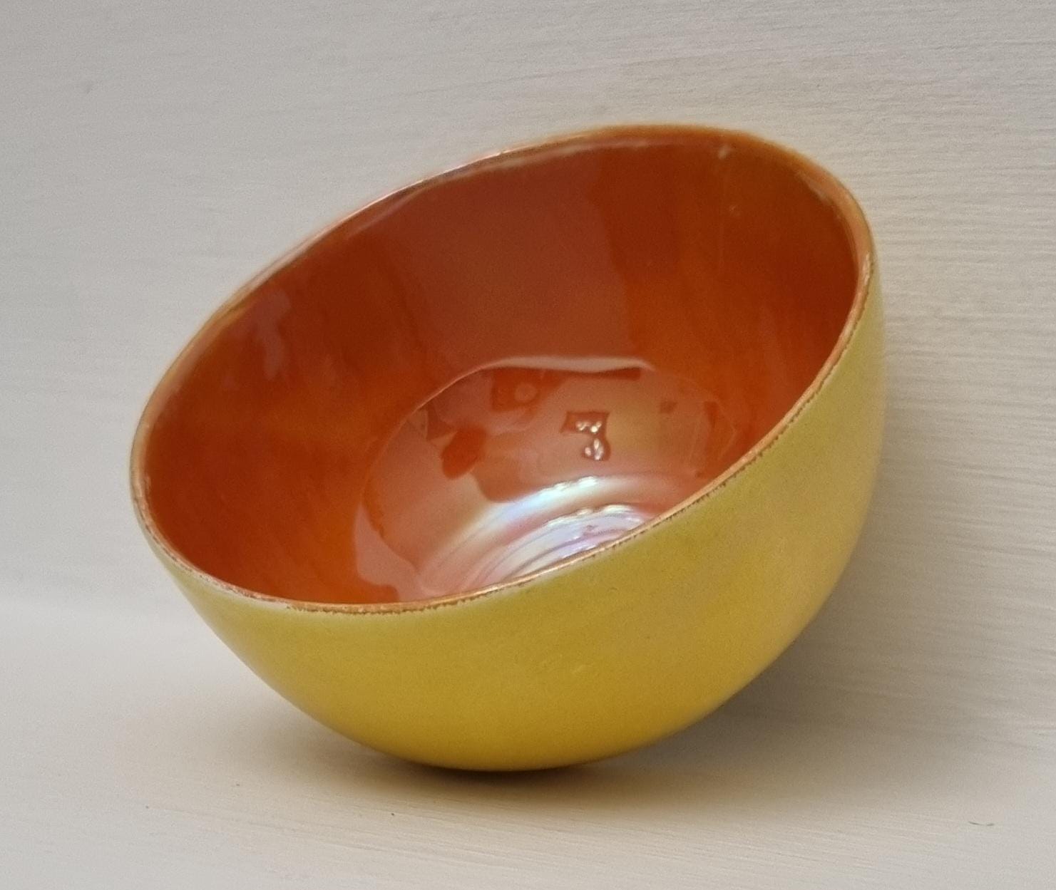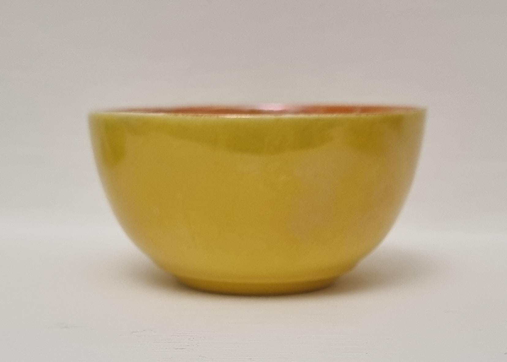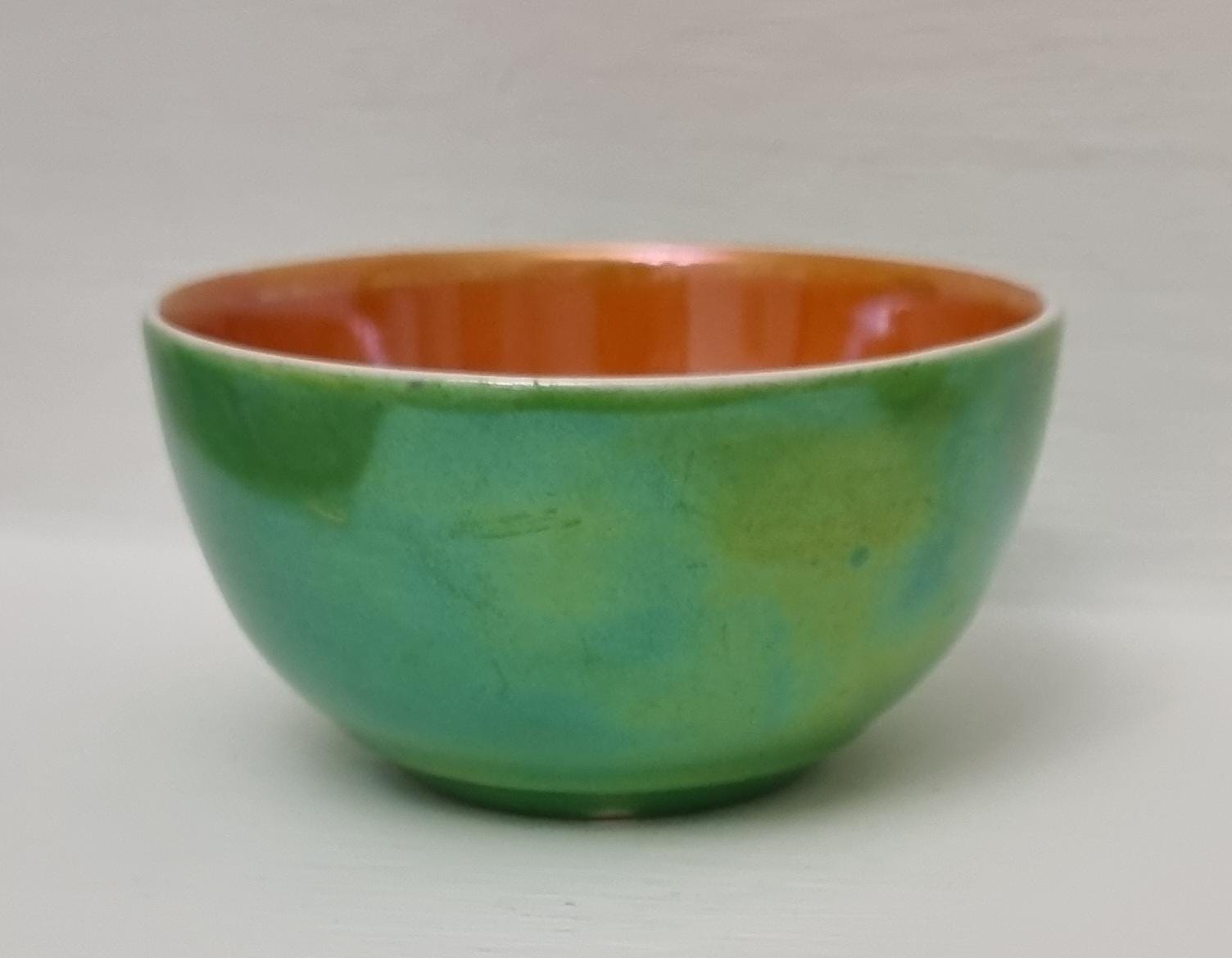 This vibrant pair of 2 small vintage W&R (Wiltshaw & Robinson) Carlton Ware lustreware bowls features the iconic high-gloss, iridescent finish that made the Stoke-on-Trent pottery famous. The set includes one bowl in a striking emerald-to-seafoam green and another in a warm canary yellow, both accented by a glowing tangerine orange interior.
