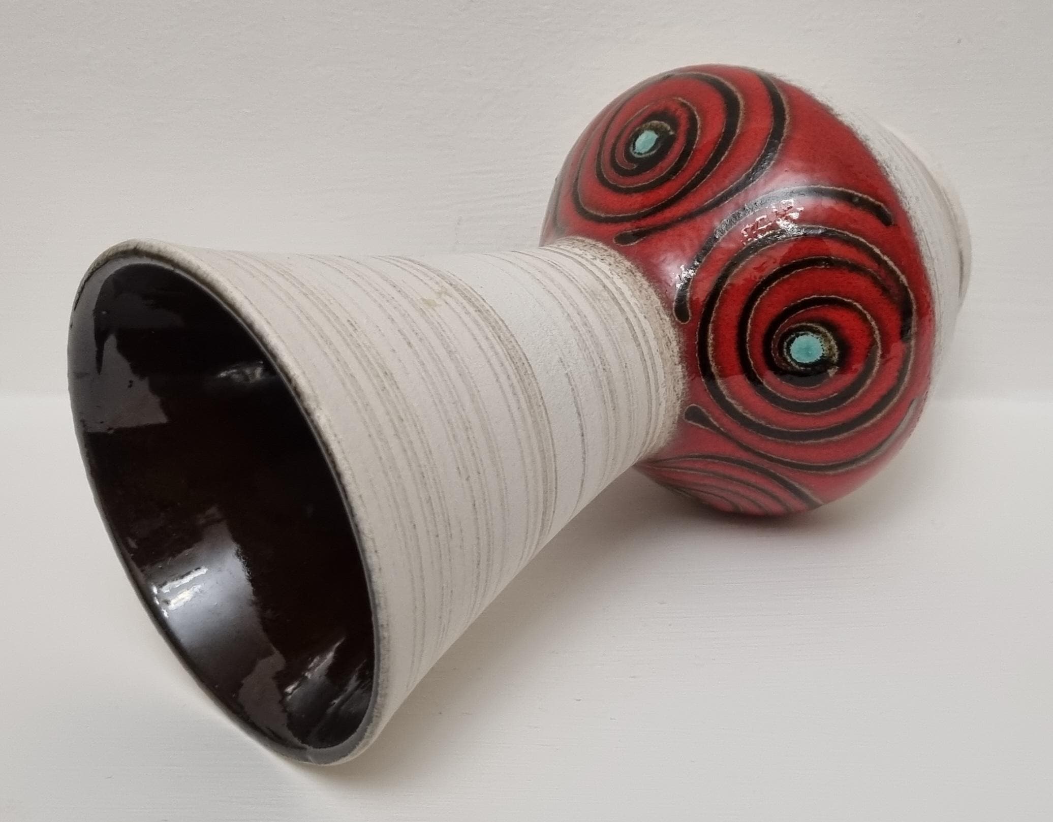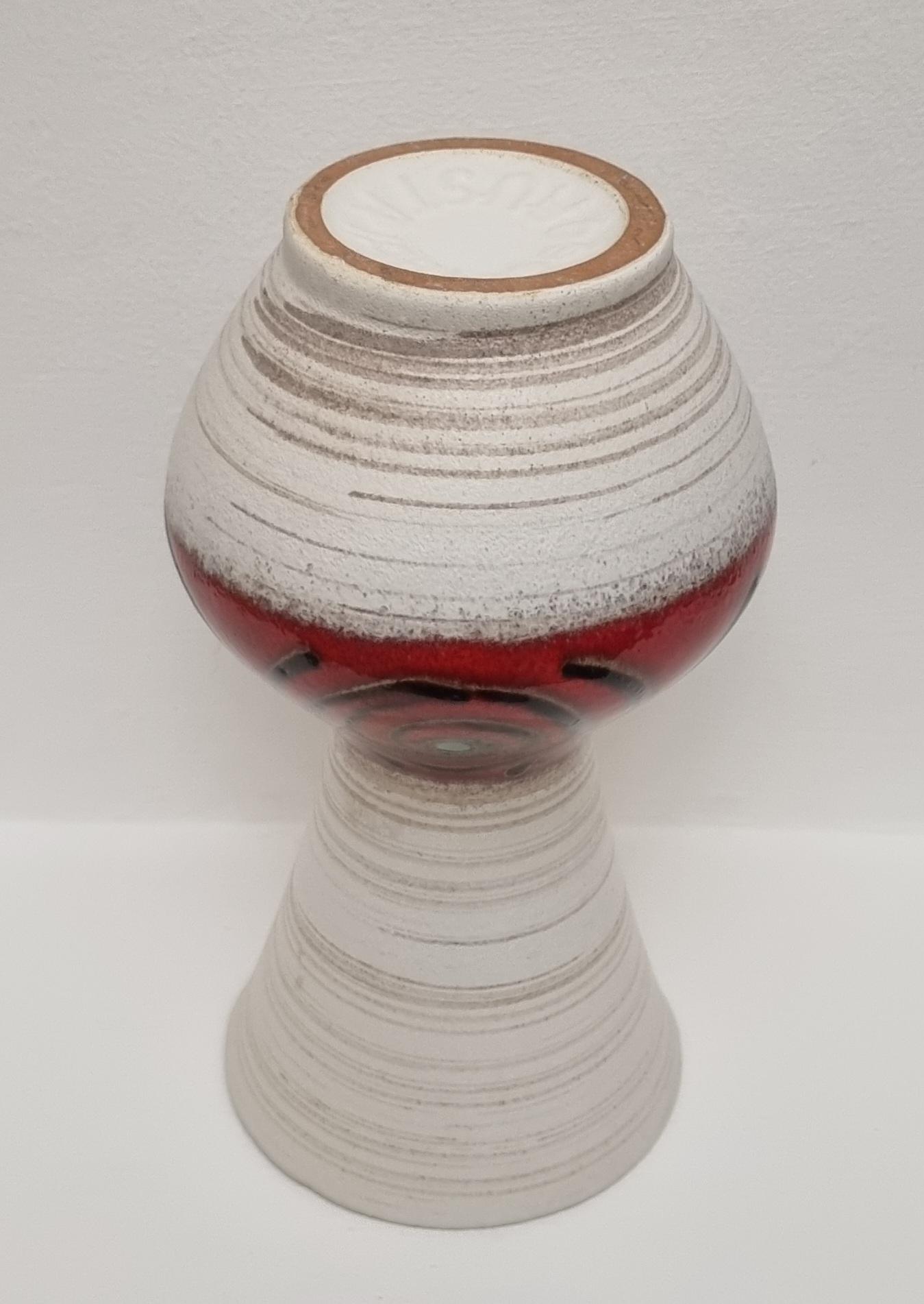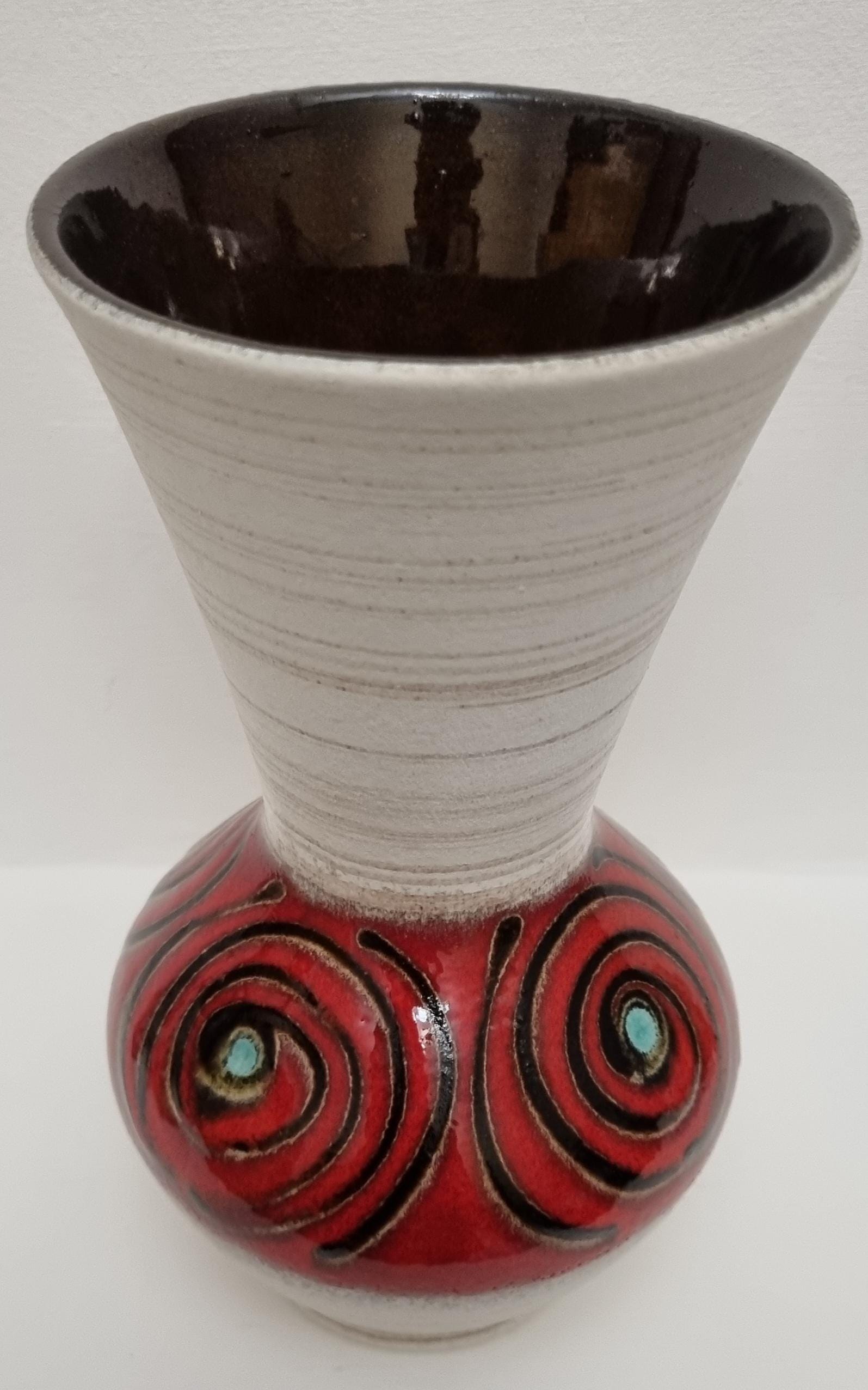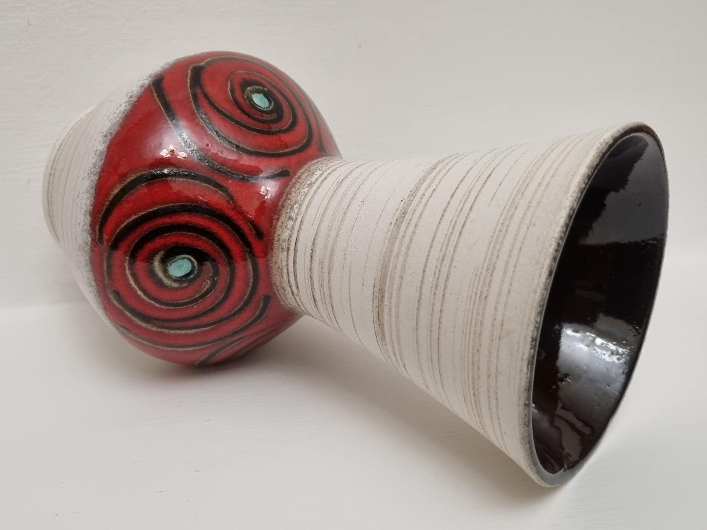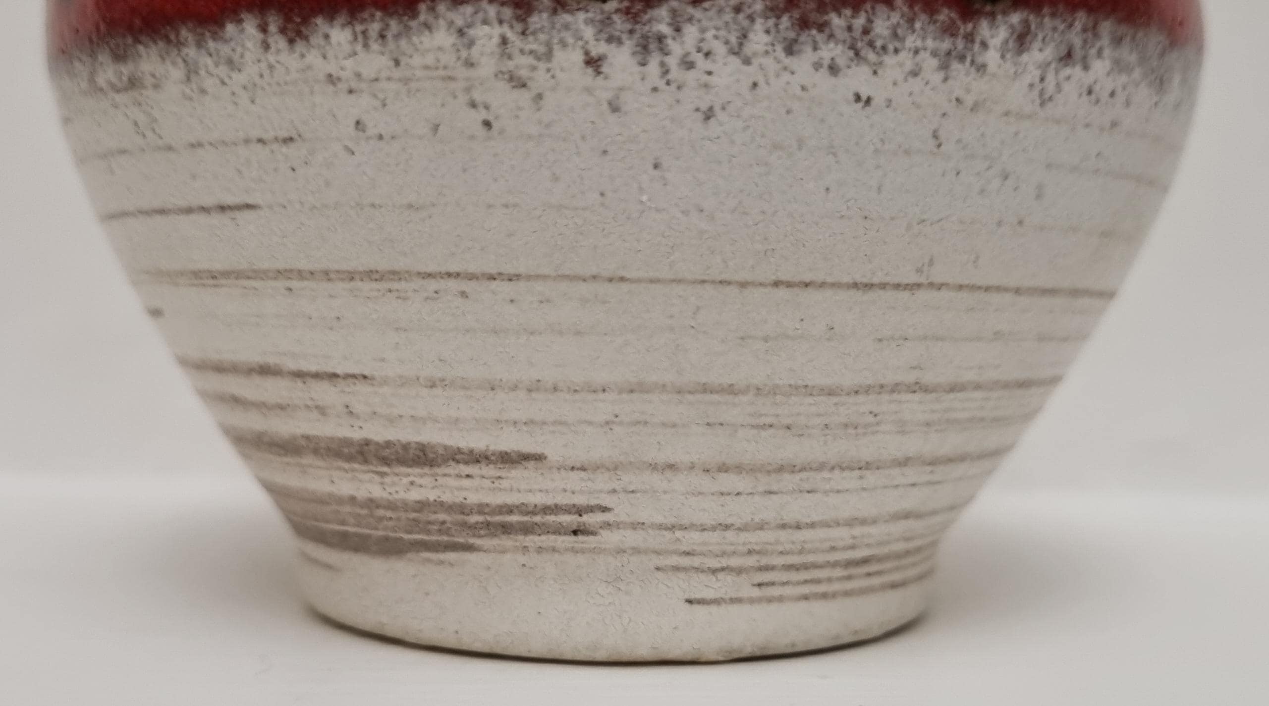 A rare and striking Mid-Century Modern Carstens Keramik Austria art pottery vase. This piece features a sophisticated flared "trumpet" neck and a rounded, squat base. The design showcases a high-contrast "Fat Lava" style glaze, with a textured, matte off-white/cream upper body that transitions into a bold, glossy deep red and chocolate brown. Style 664- 18.