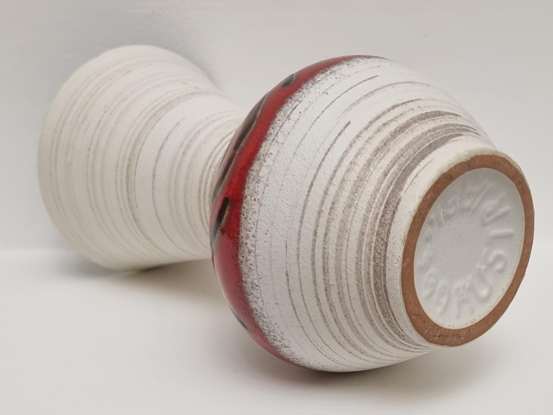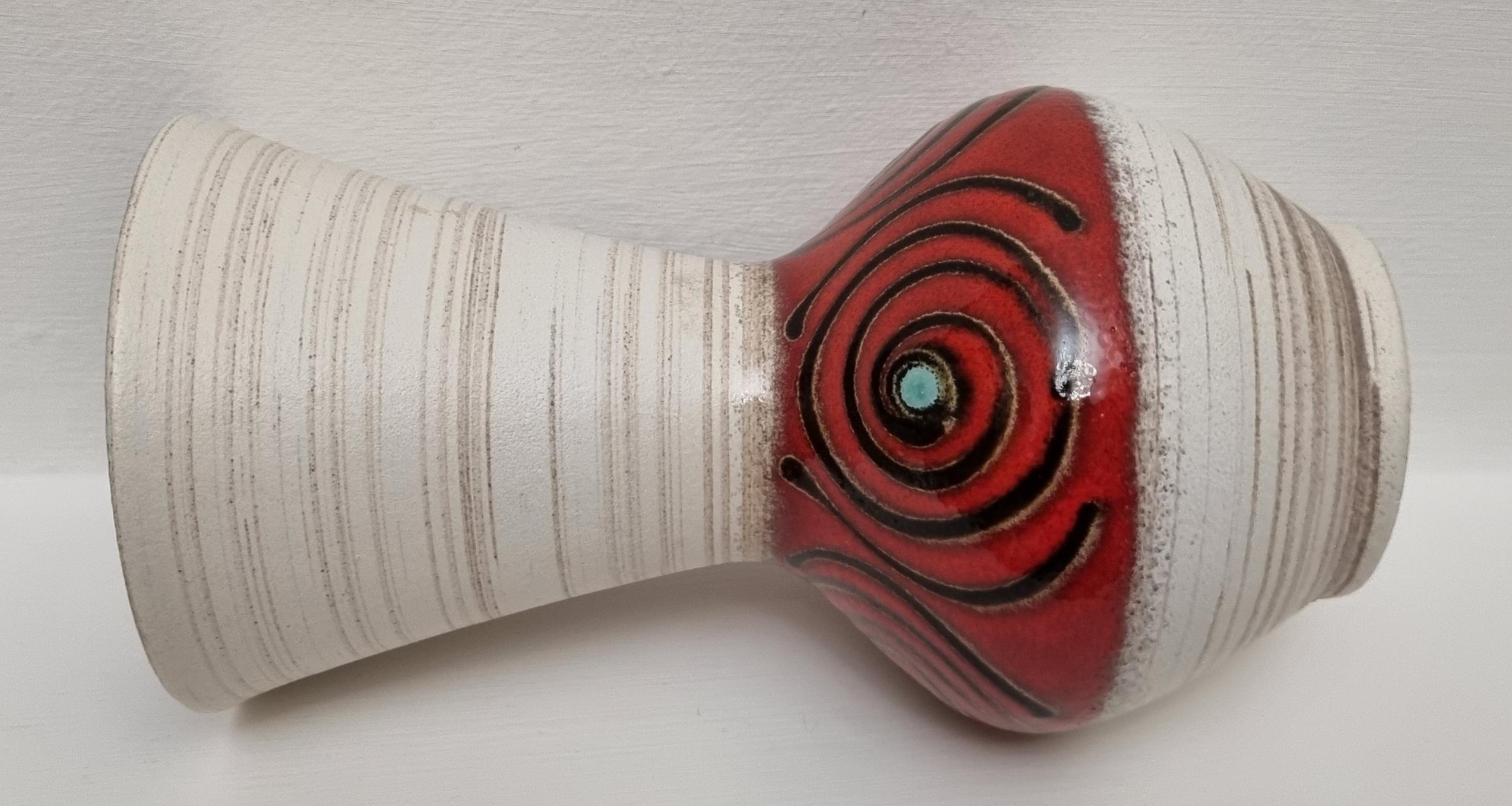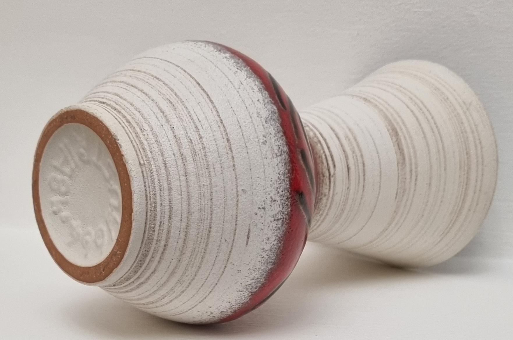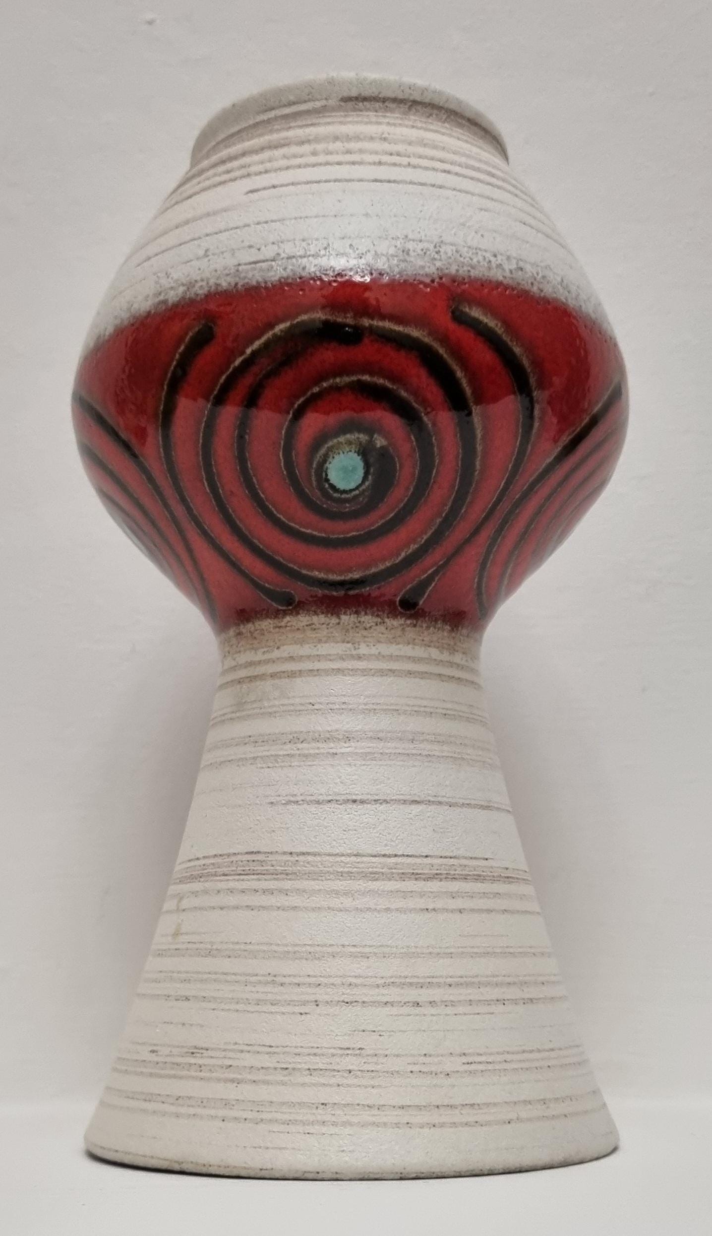 A rare and striking Mid-Century Modern Carstens Keramik Austria art pottery vase. This piece features a sophisticated flared "trumpet" neck and a rounded, squat base. The design showcases a high-contrast "Fat Lava" style glaze, with a textured, matte off-white/cream upper body that transitions into a bold, glossy deep red and chocolate brown. Style 664- 18.