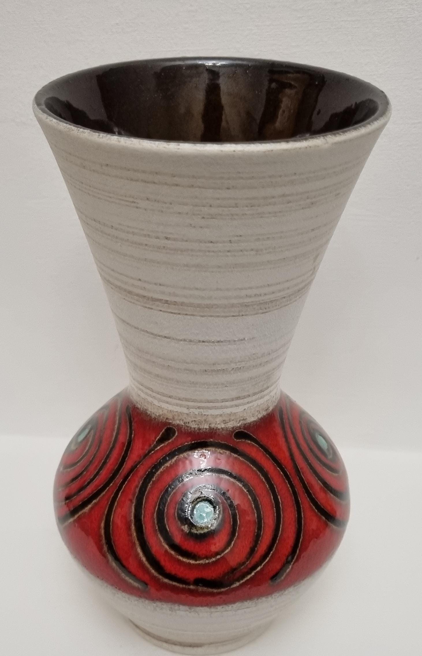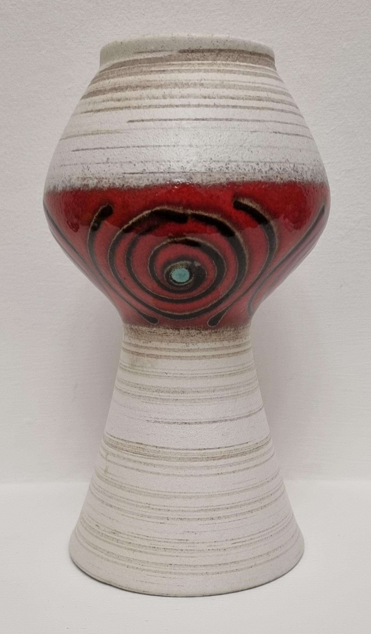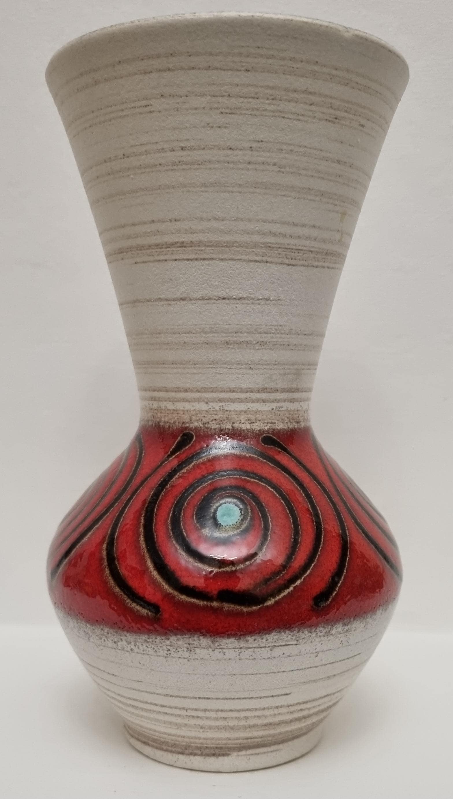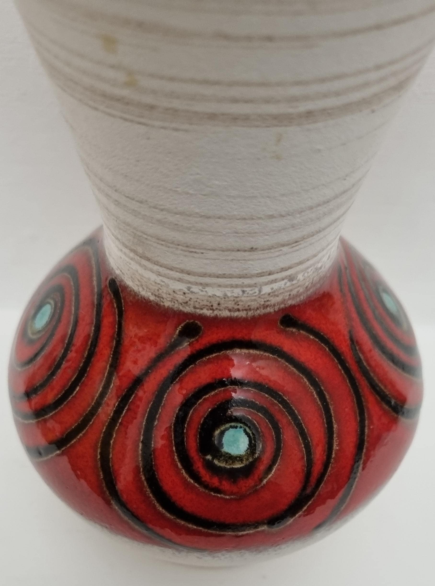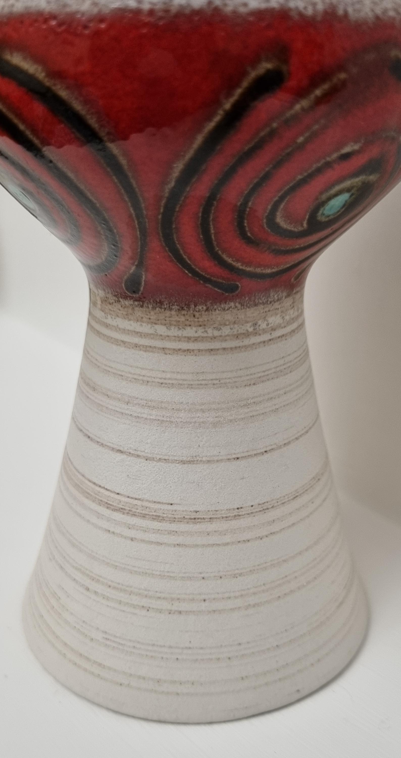 A rare and striking Mid-Century Modern Carstens Keramik Austria art pottery vase. This piece features a sophisticated flared "trumpet" neck and a rounded, squat base. The design showcases a high-contrast "Fat Lava" style glaze, with a textured, matte off-white/cream upper body that transitions into a bold, glossy deep red and chocolate brown. Style 664- 18.