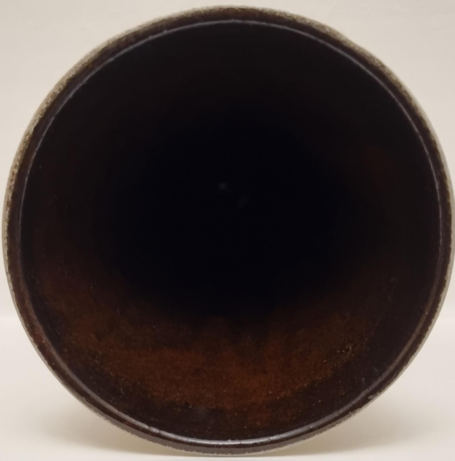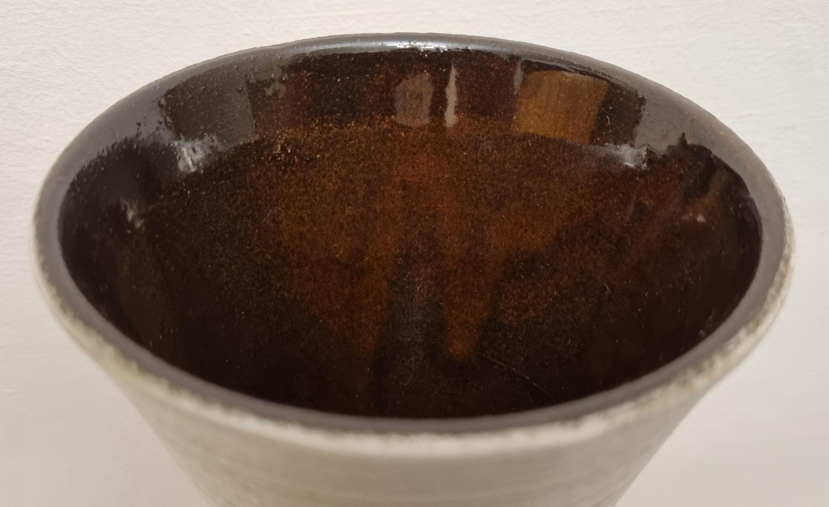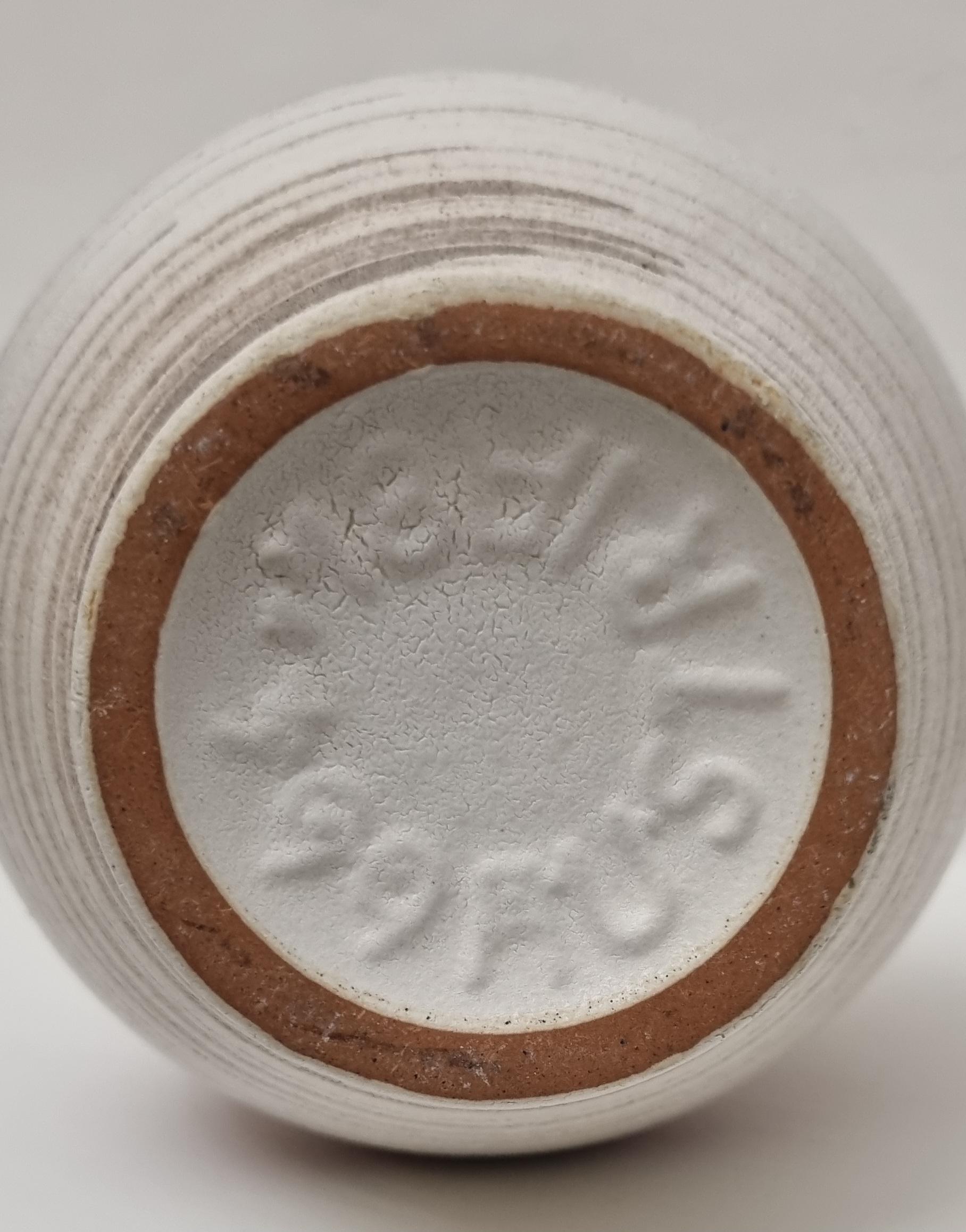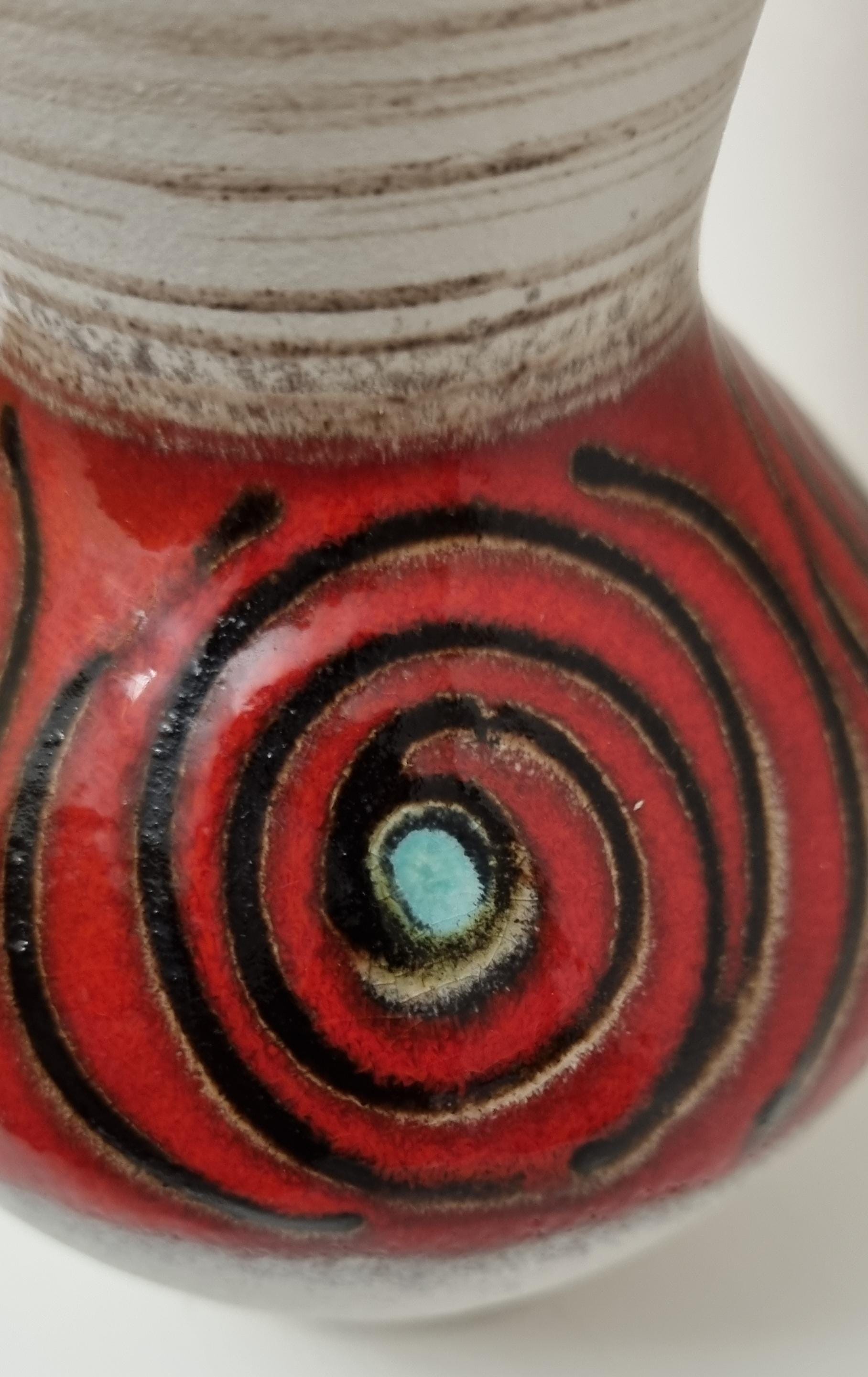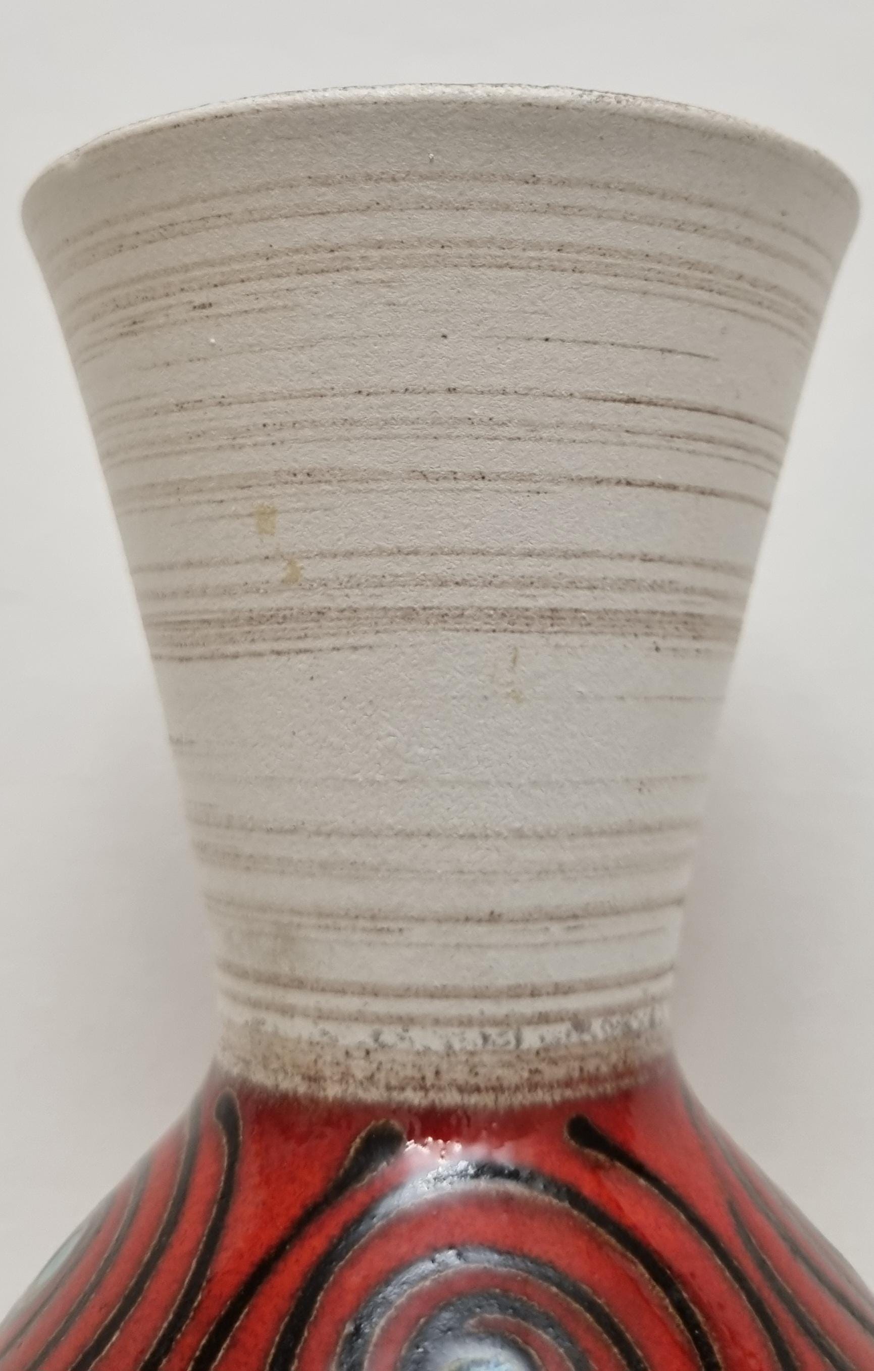 A rare and striking Mid-Century Modern Carstens Keramik Austria art pottery vase. This piece features a sophisticated flared "trumpet" neck and a rounded, squat base. The design showcases a high-contrast "Fat Lava" style glaze, with a textured, matte off-white/cream upper body that transitions into a bold, glossy deep red and chocolate brown. Style 664- 18.