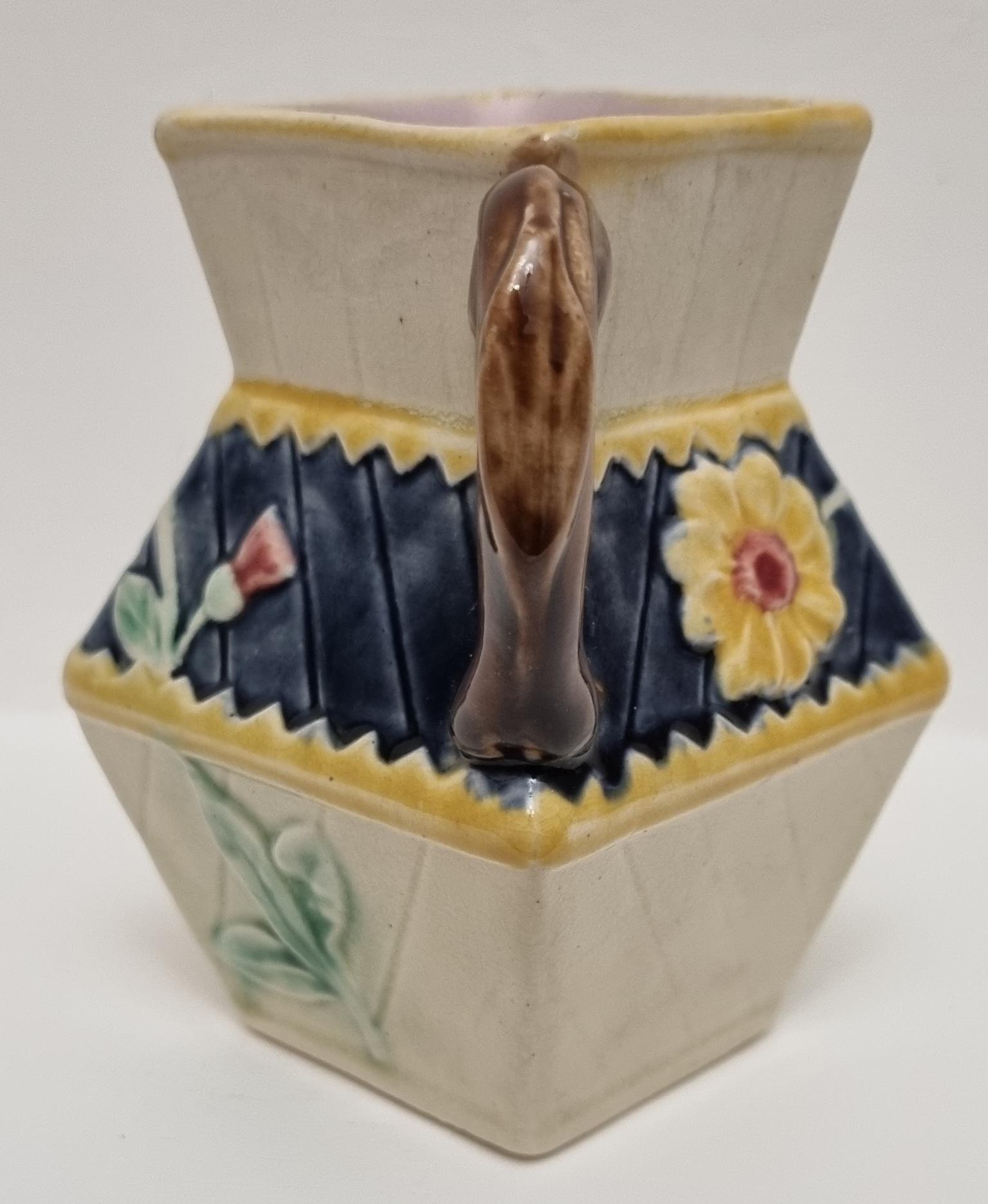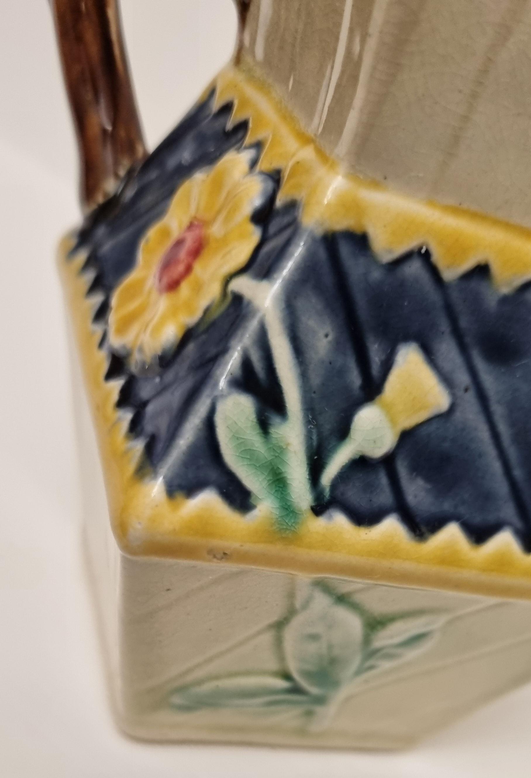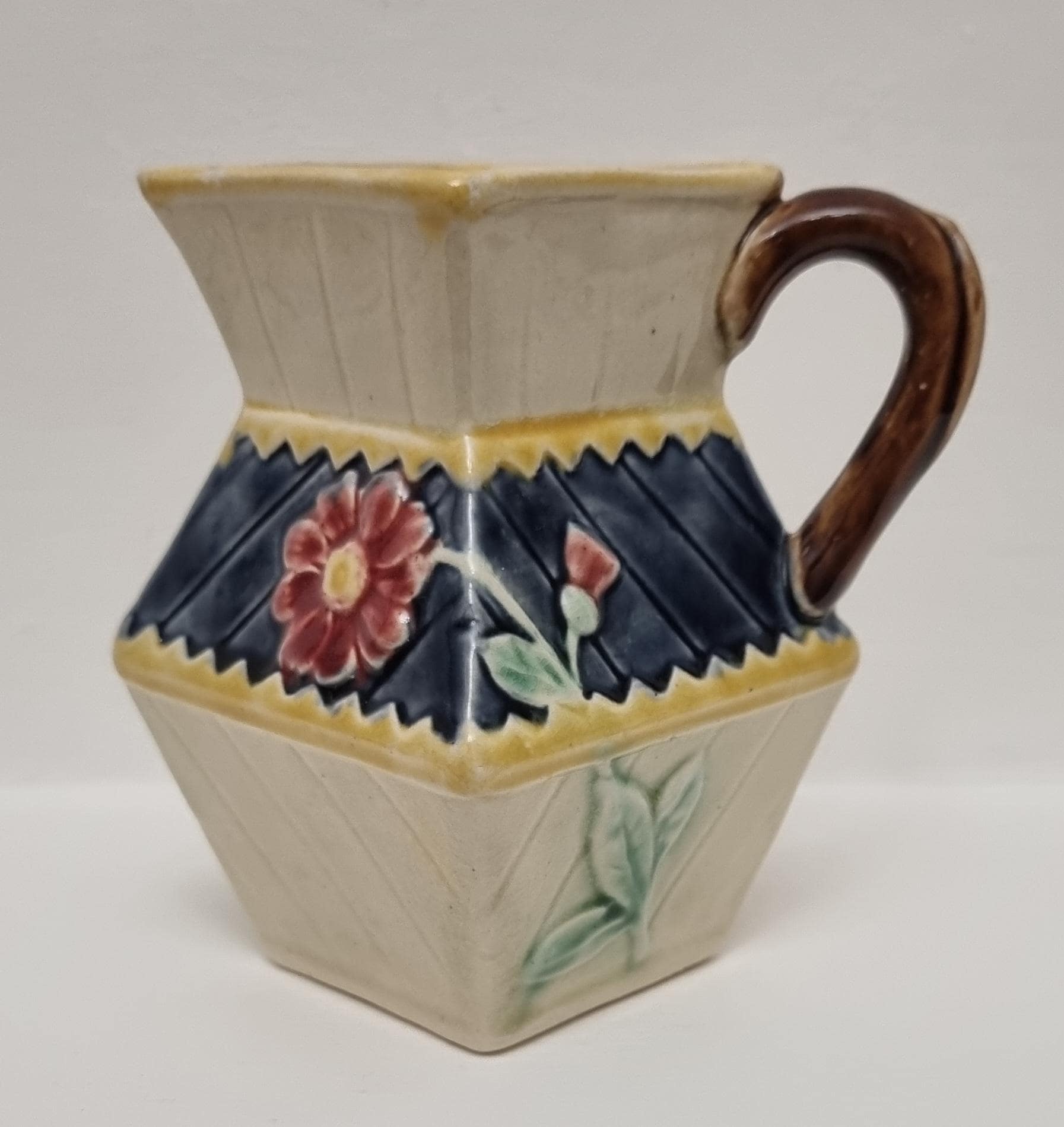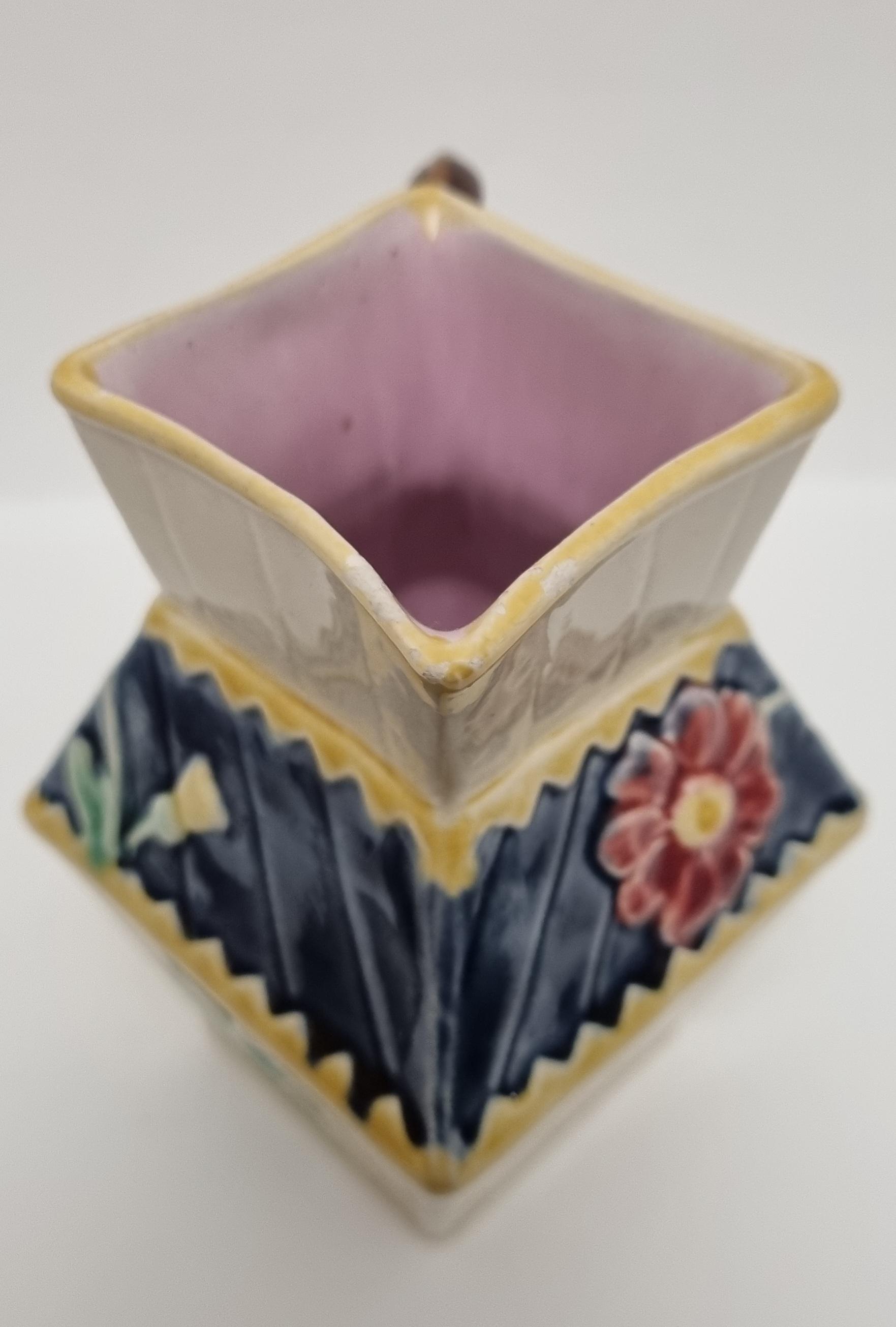A rare and striking Aesthetic Movement Majolica jug, circa 1880. This piece features a unique hexagonal/diamond-shaped body with crisp, moulded geometric fluting. The central band is decorated with a vibrant relief-moulded pink flower and bud against a deep cobalt blue textured ground, framed by mustard-yellow serrated borders and lilac interior.