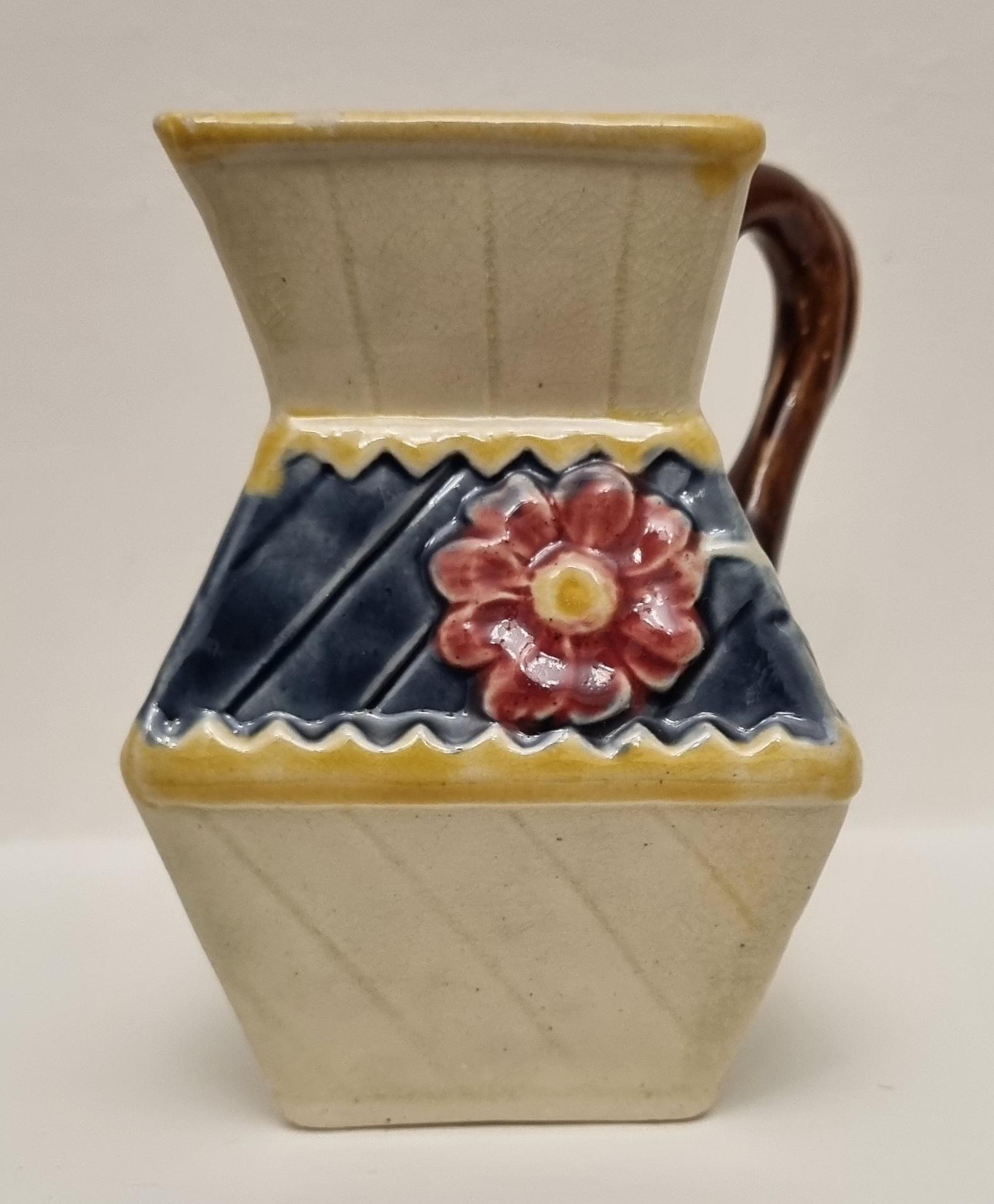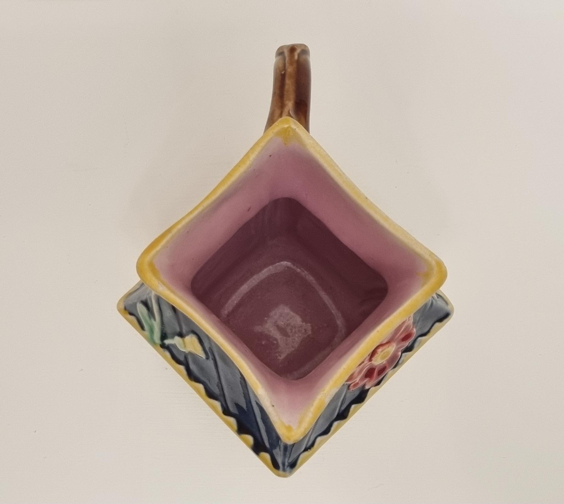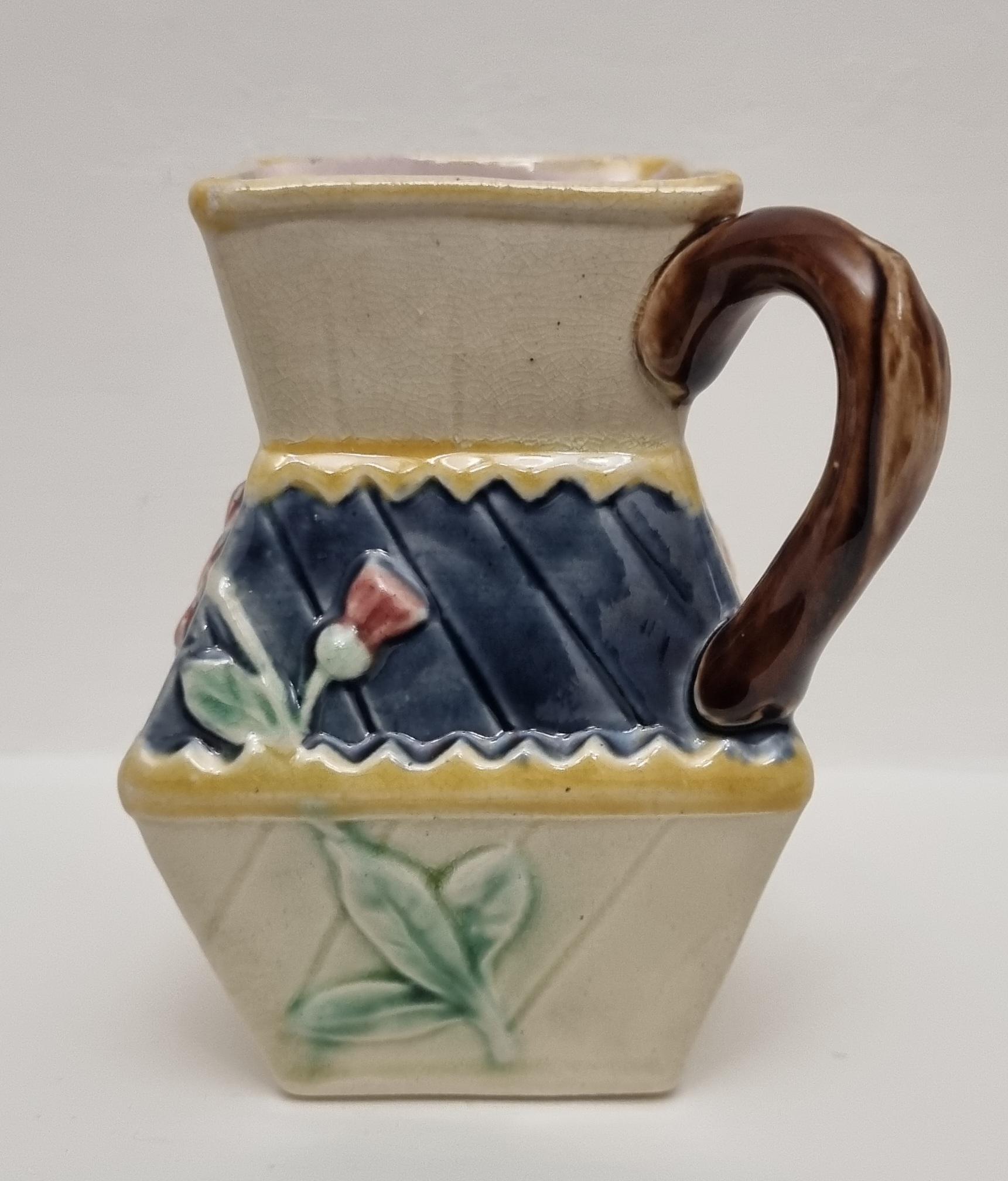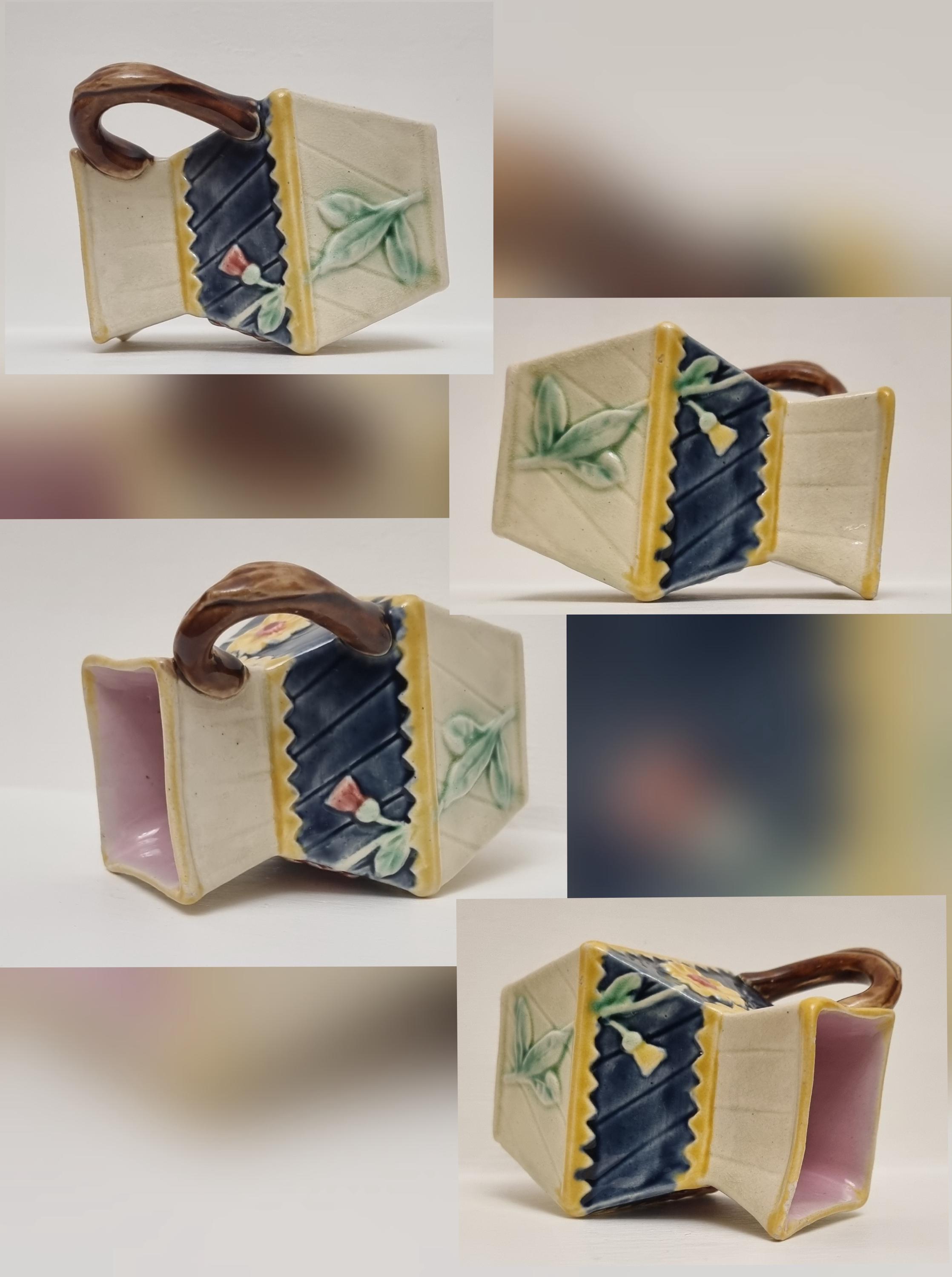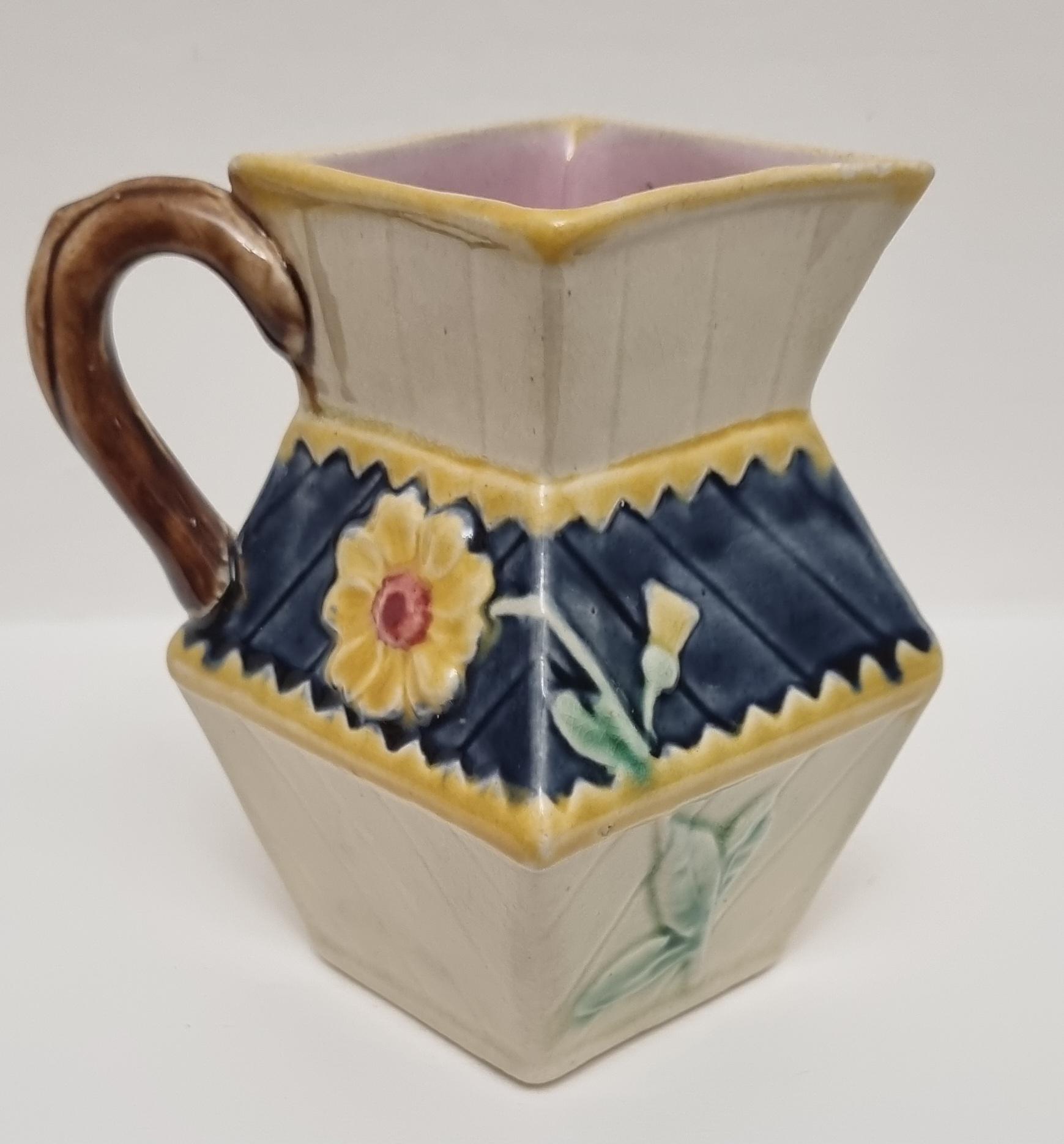 A rare and striking Aesthetic Movement Majolica jug, circa 1880. This piece features a unique hexagonal/diamond-shaped body with crisp, moulded geometric fluting. The central band is decorated with a vibrant relief-moulded pink flower and bud against a deep cobalt blue textured ground, framed by mustard-yellow serrated borders and lilac interior.