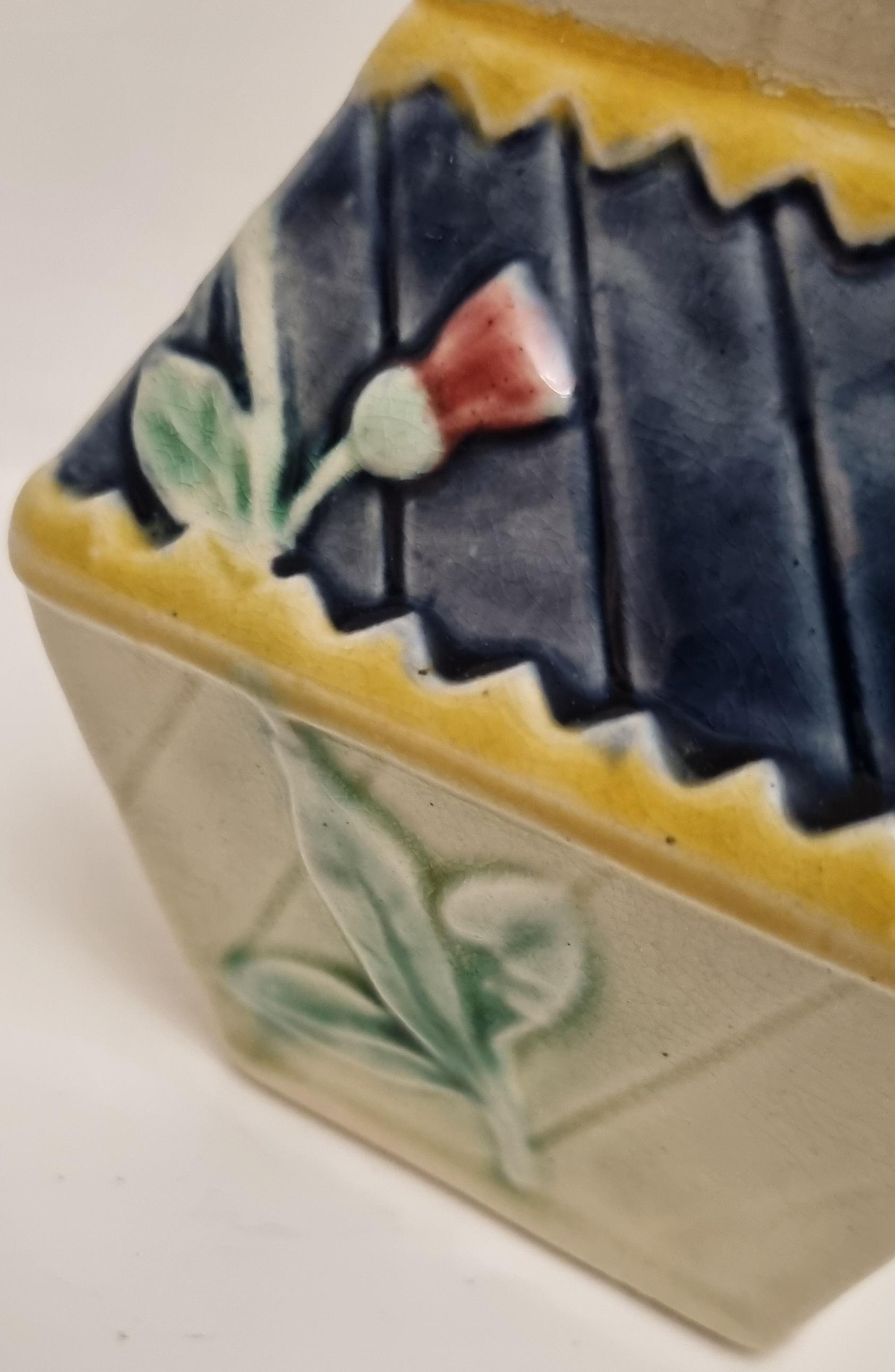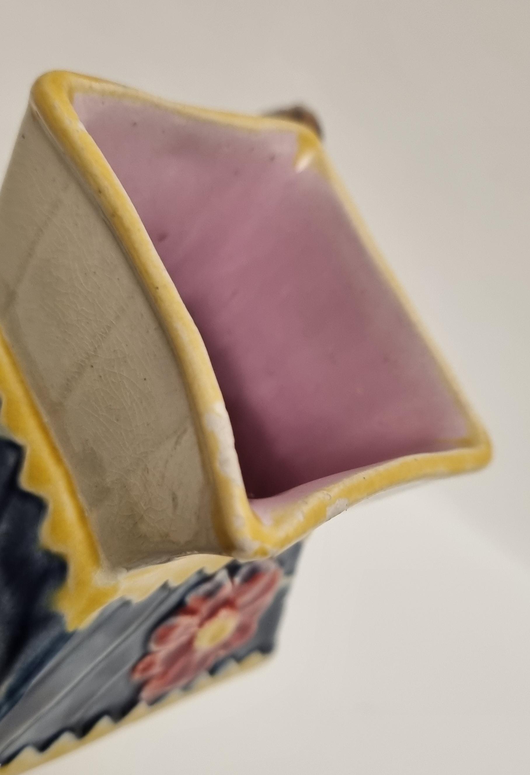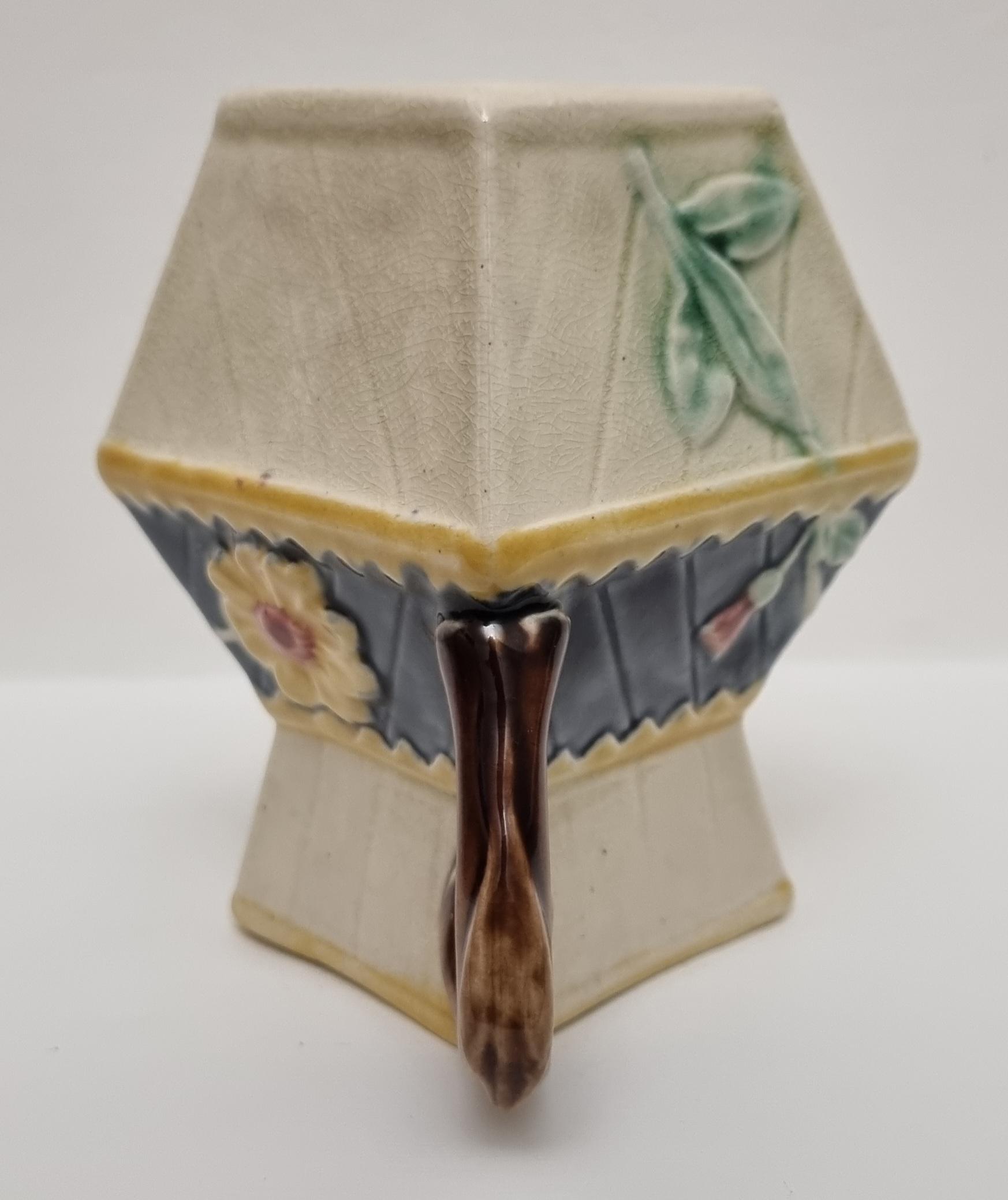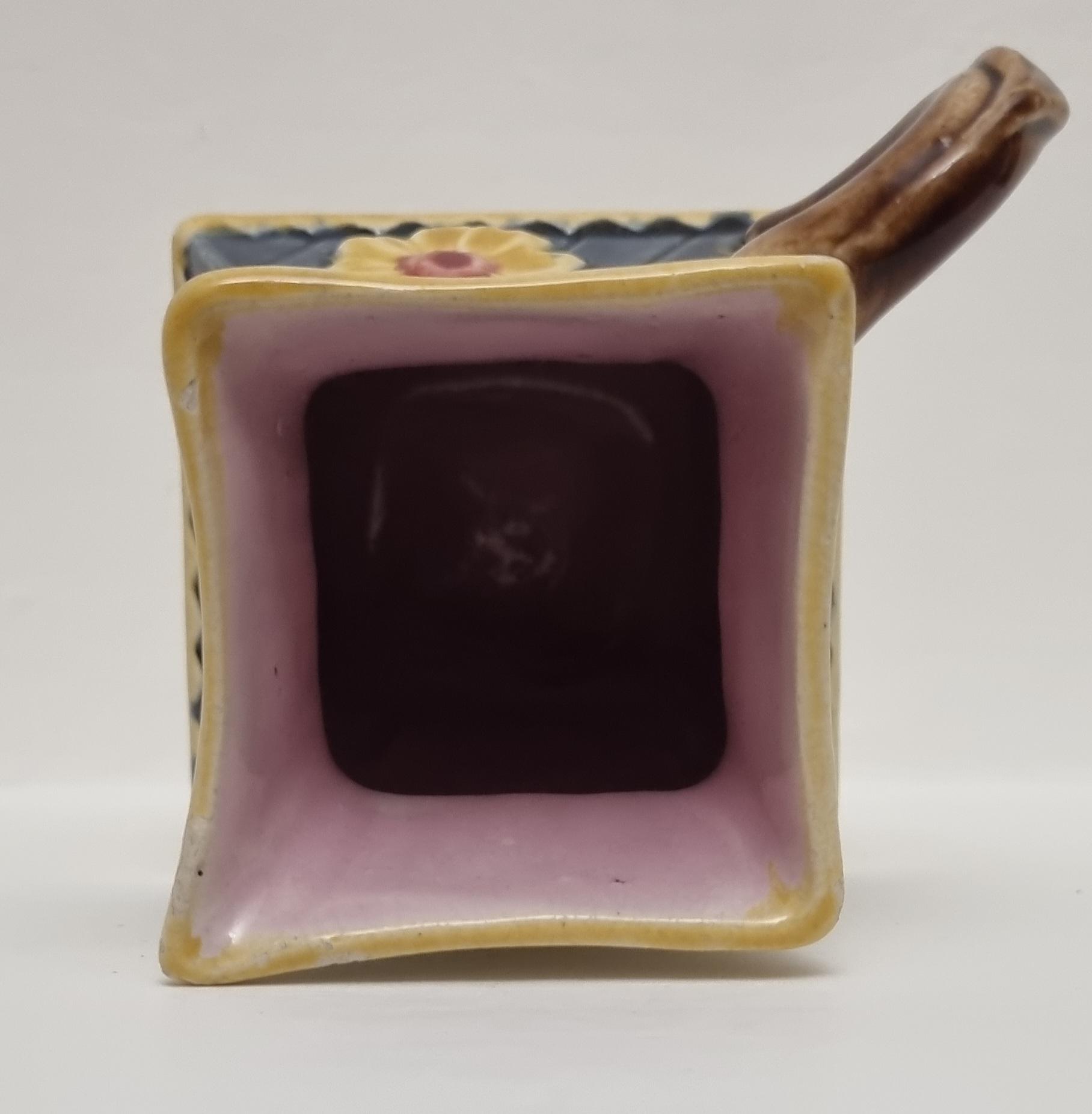 A rare and striking Aesthetic Movement Majolica jug, circa 1880. This piece features a unique hexagonal/diamond-shaped body with crisp, moulded geometric fluting. The central band is decorated with a vibrant relief-moulded pink flower and bud against a deep cobalt blue textured ground, framed by mustard-yellow serrated borders and lilac interior.
