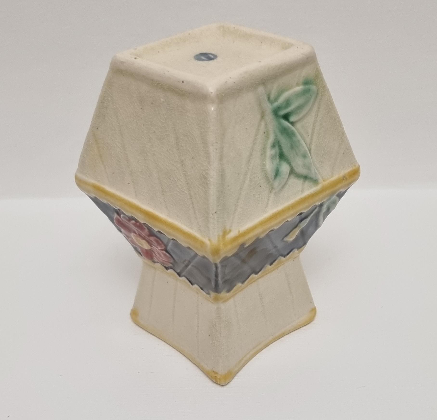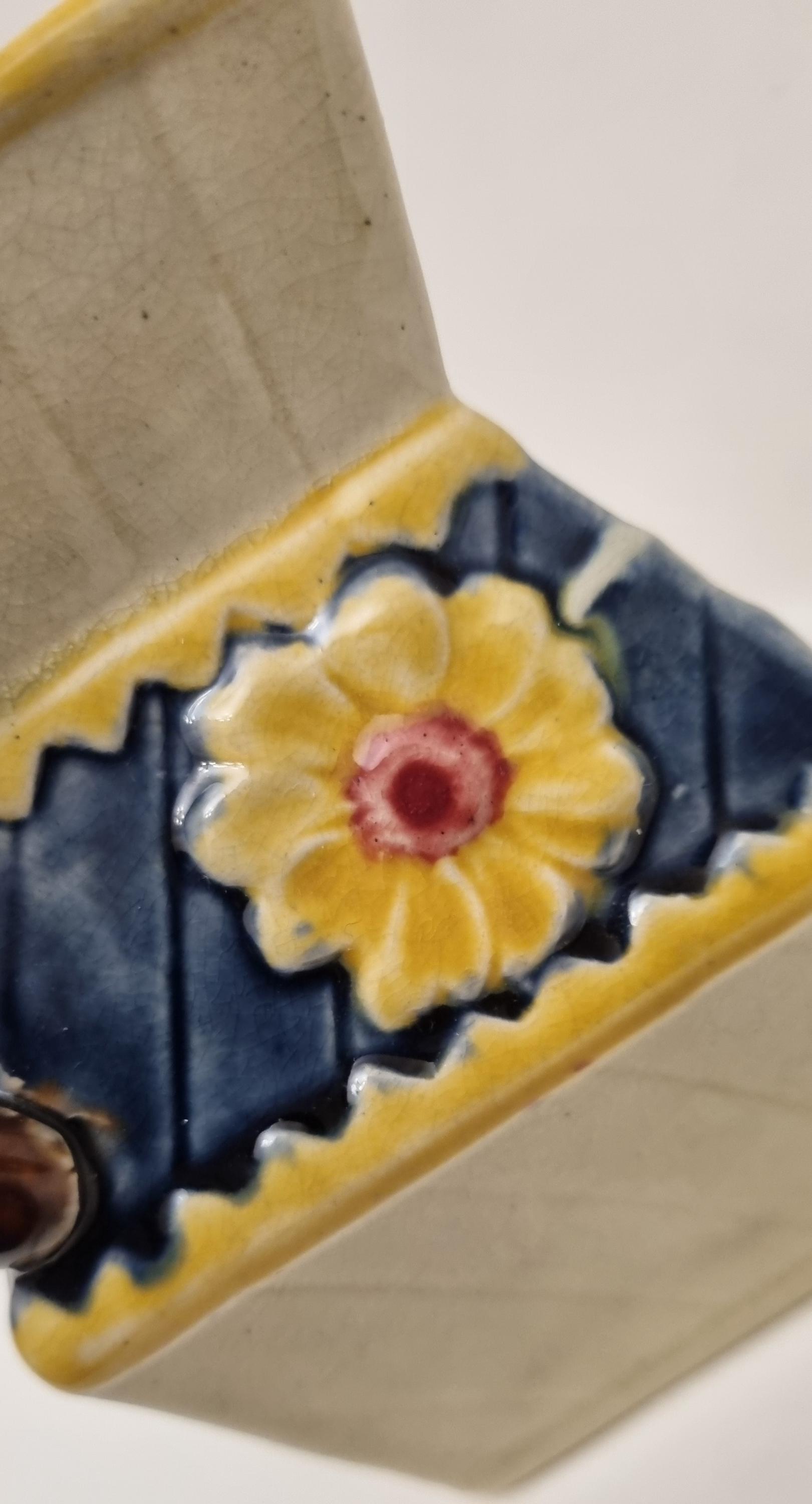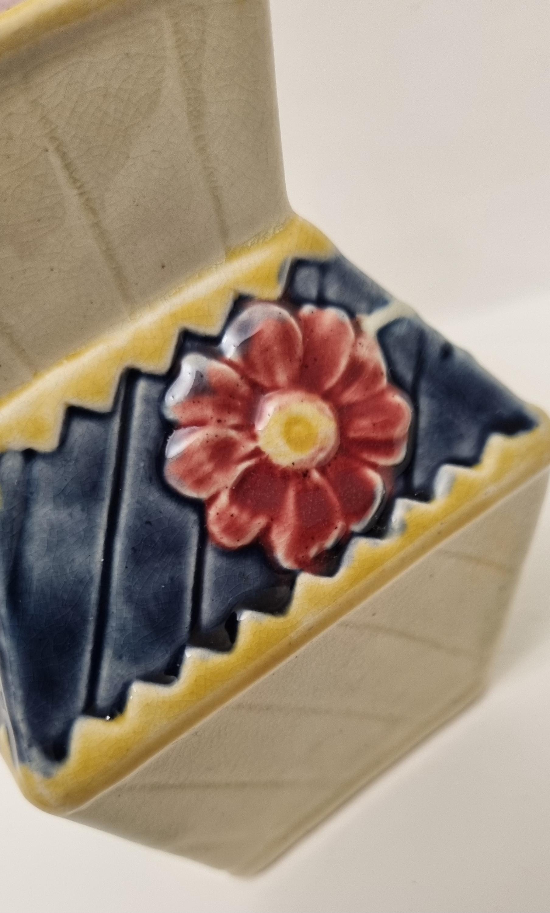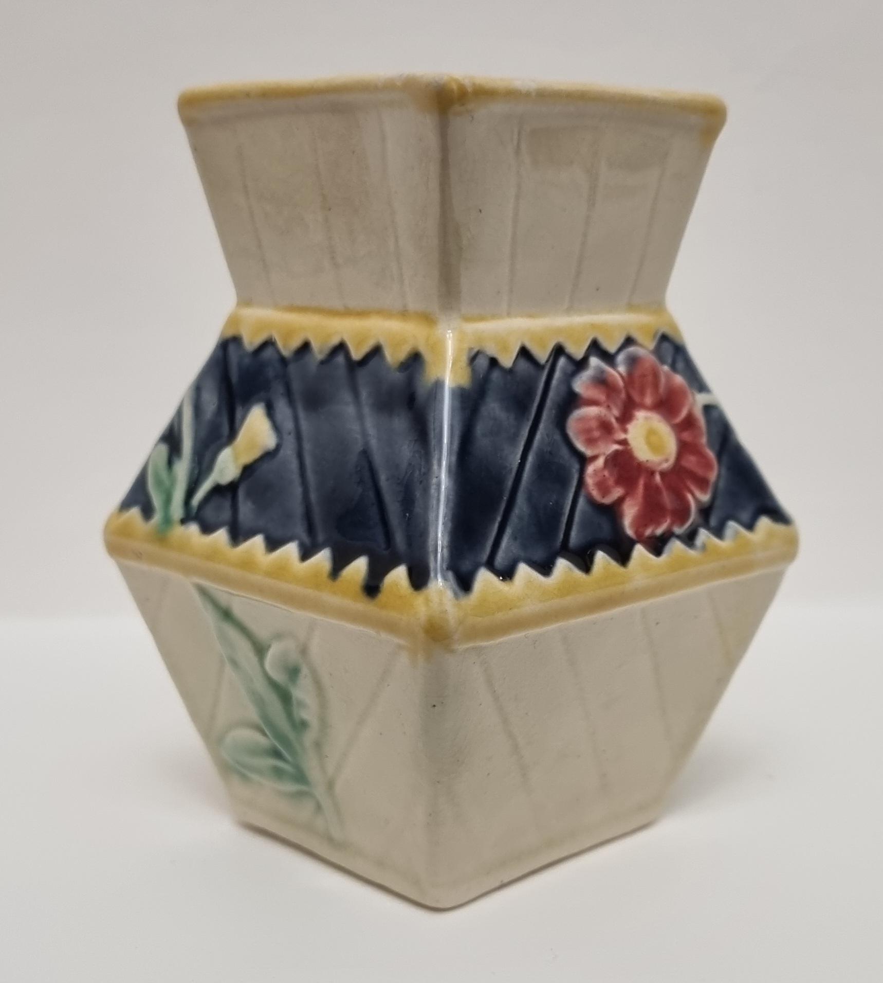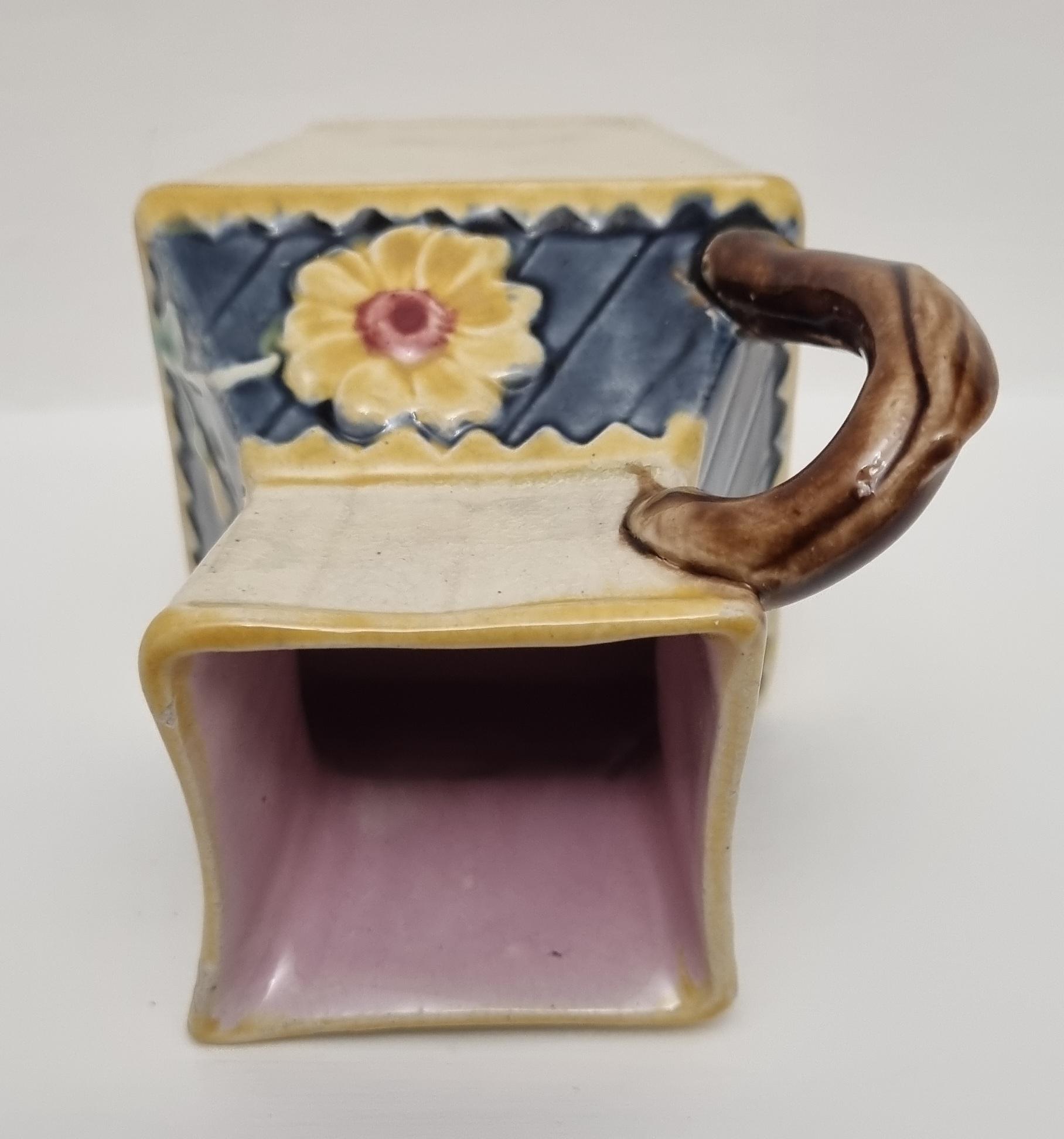 A rare and striking Aesthetic Movement Majolica jug, circa 1880. This piece features a unique hexagonal/diamond-shaped body with crisp, moulded geometric fluting. The central band is decorated with a vibrant relief-moulded pink flower and bud against a deep cobalt blue textured ground, framed by mustard-yellow serrated borders and lilac interior.